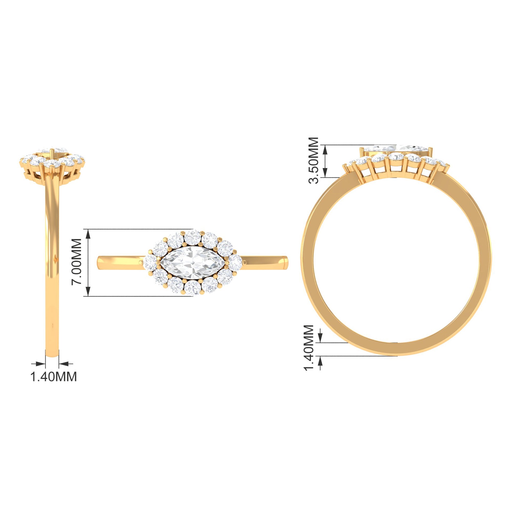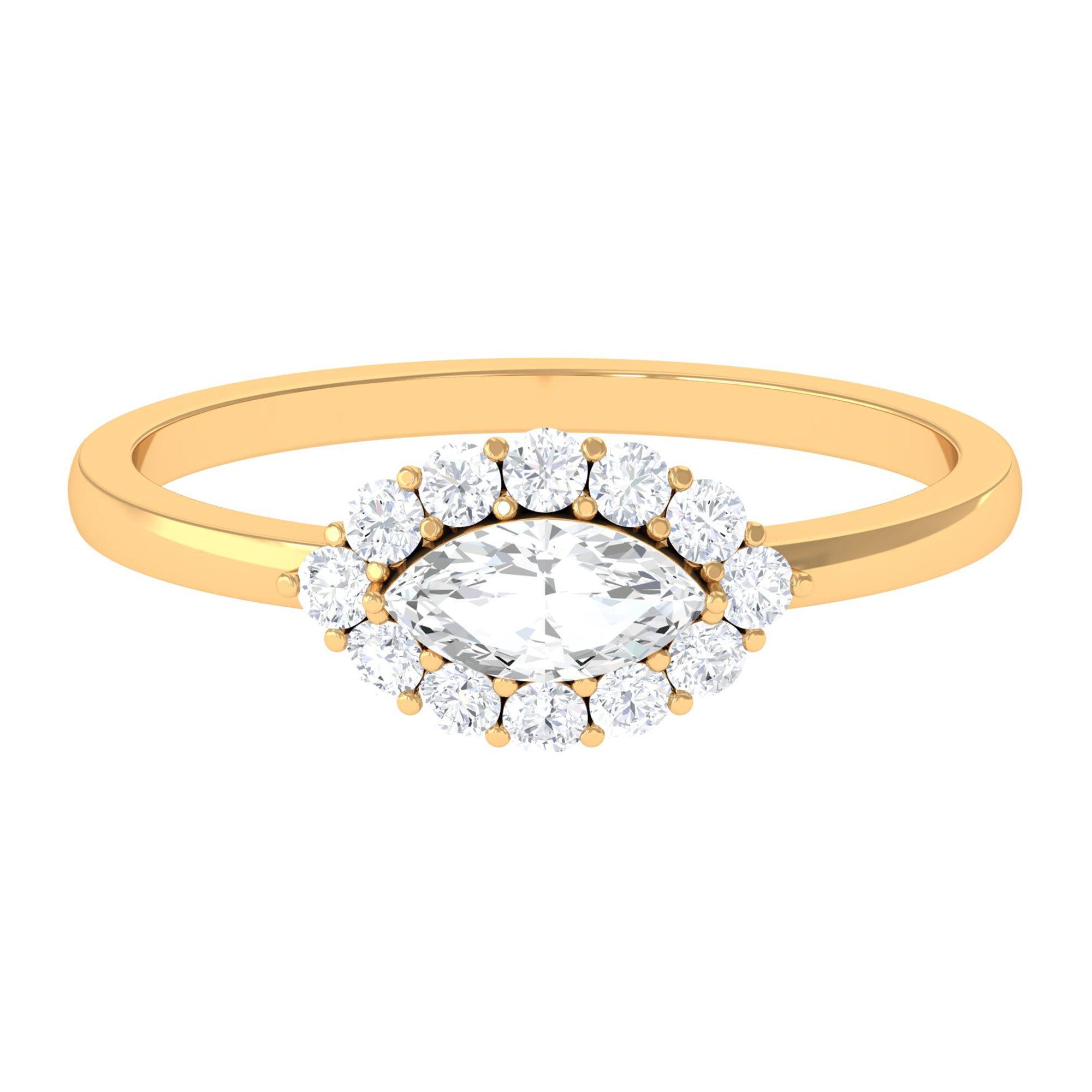 This Engagement Ring is one where the Marquise Cut Cubic Zirconia is oriented horizontally on the band in prong setting along with Round Cut zircon halo. Beautiful East West Simulated Diamond Engagement Ring will make her eyes glitter with your love. Crafted in Gold.