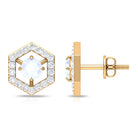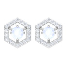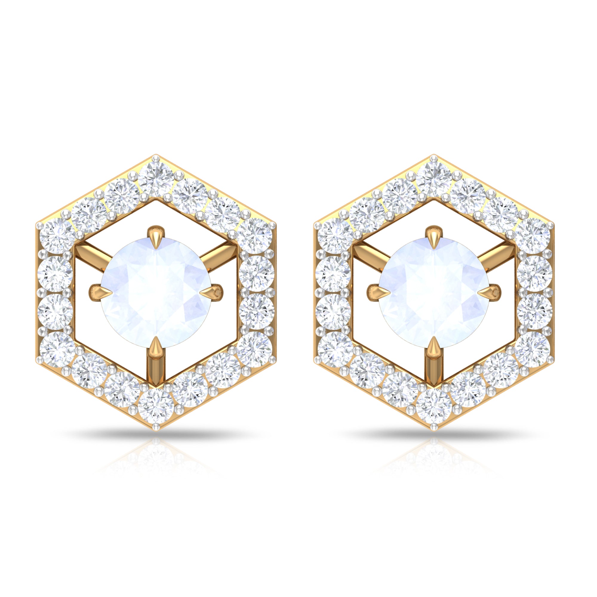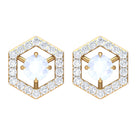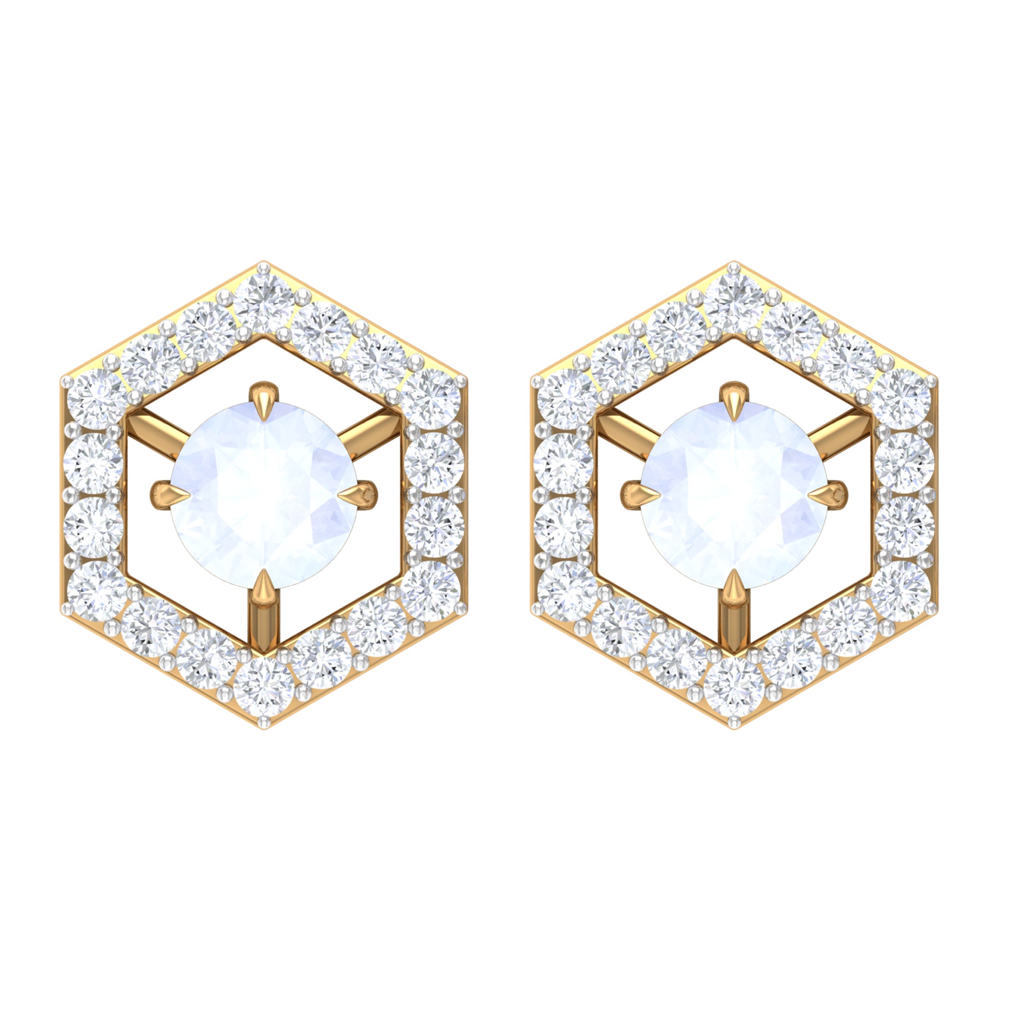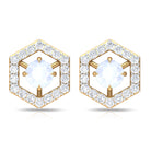 Feel unique with these Geometric Stud Earrings, adorned with Round Shape Moonstone Gemstone set as a center stone with Diamond Accent. These Minimal Stud Earrings are crafted in Solid Gold