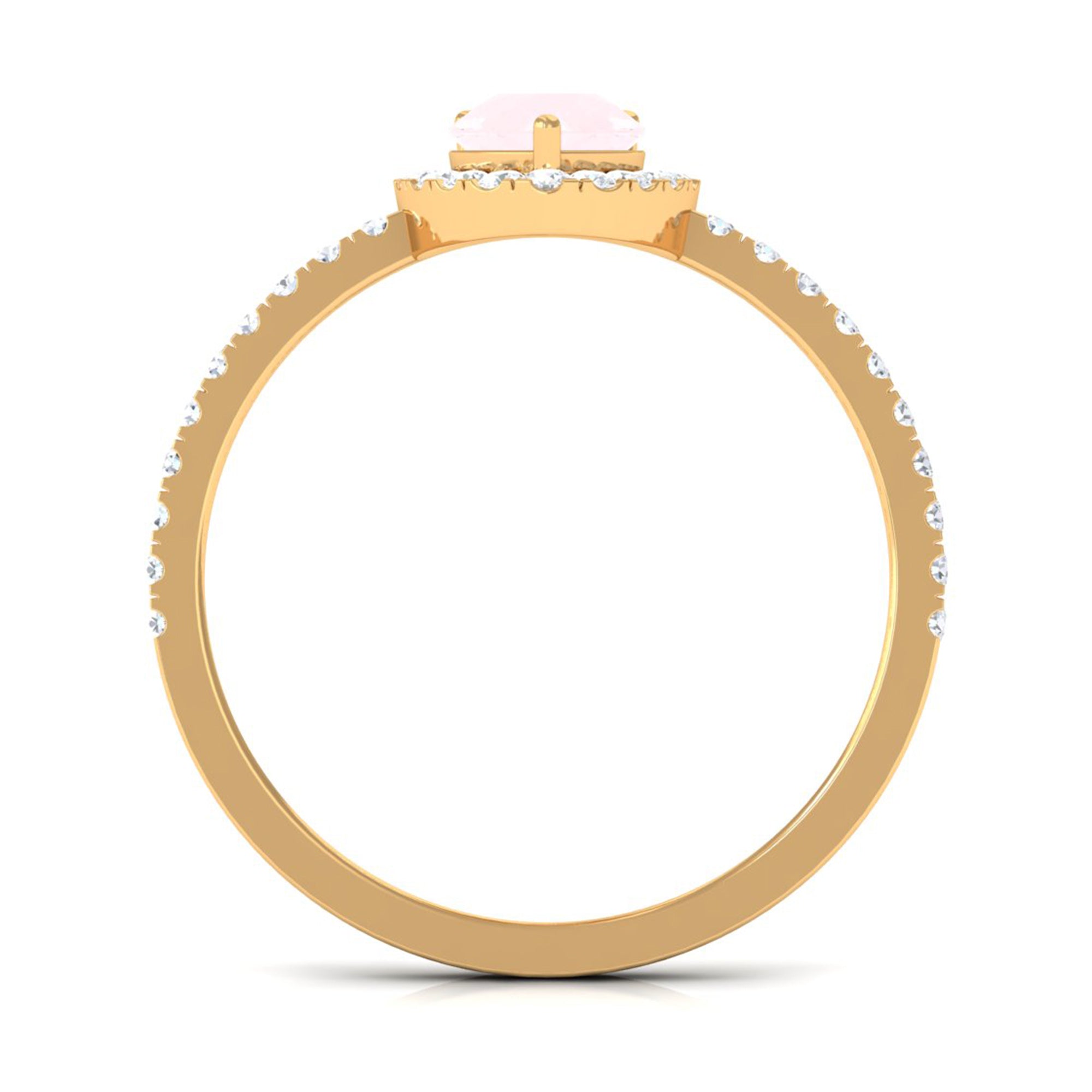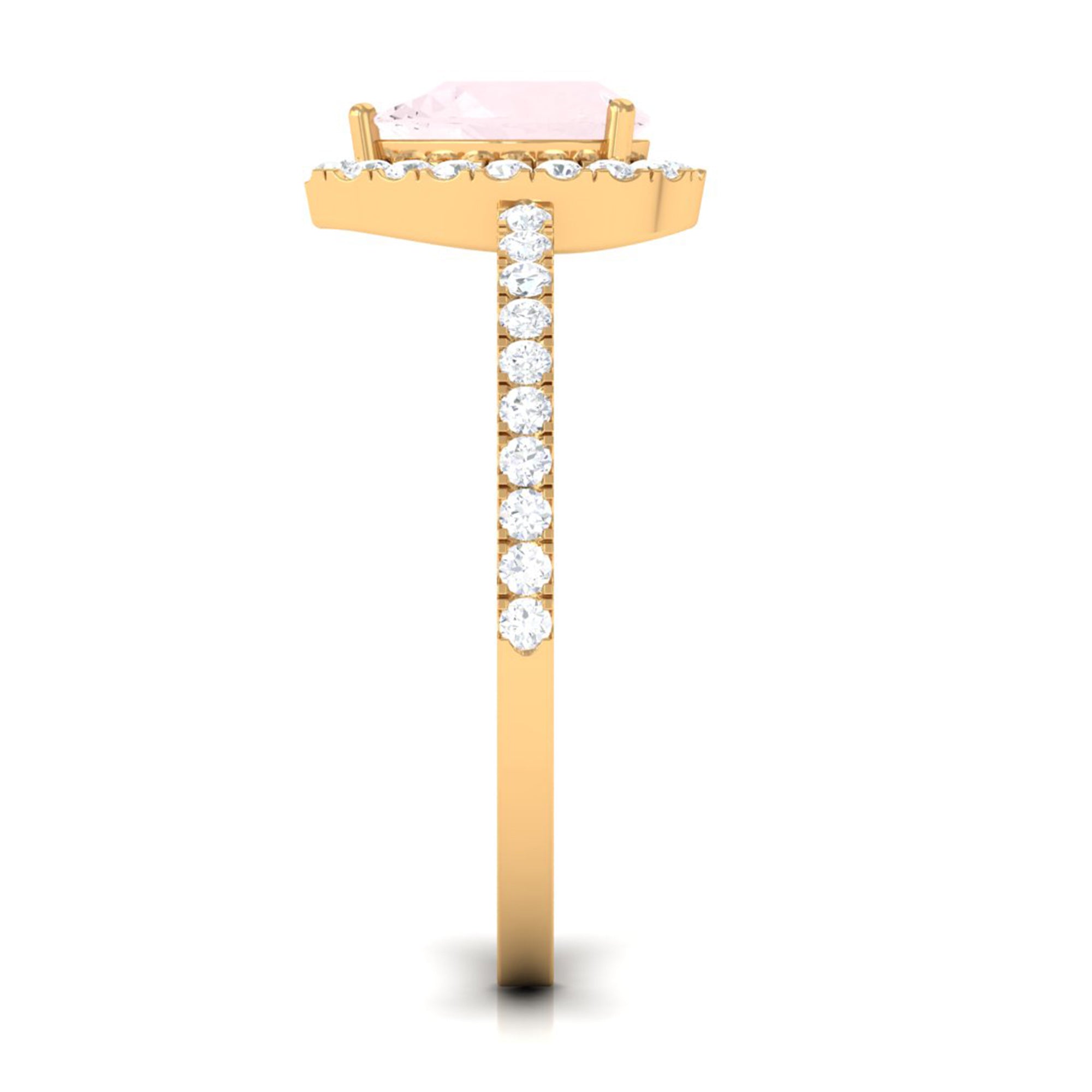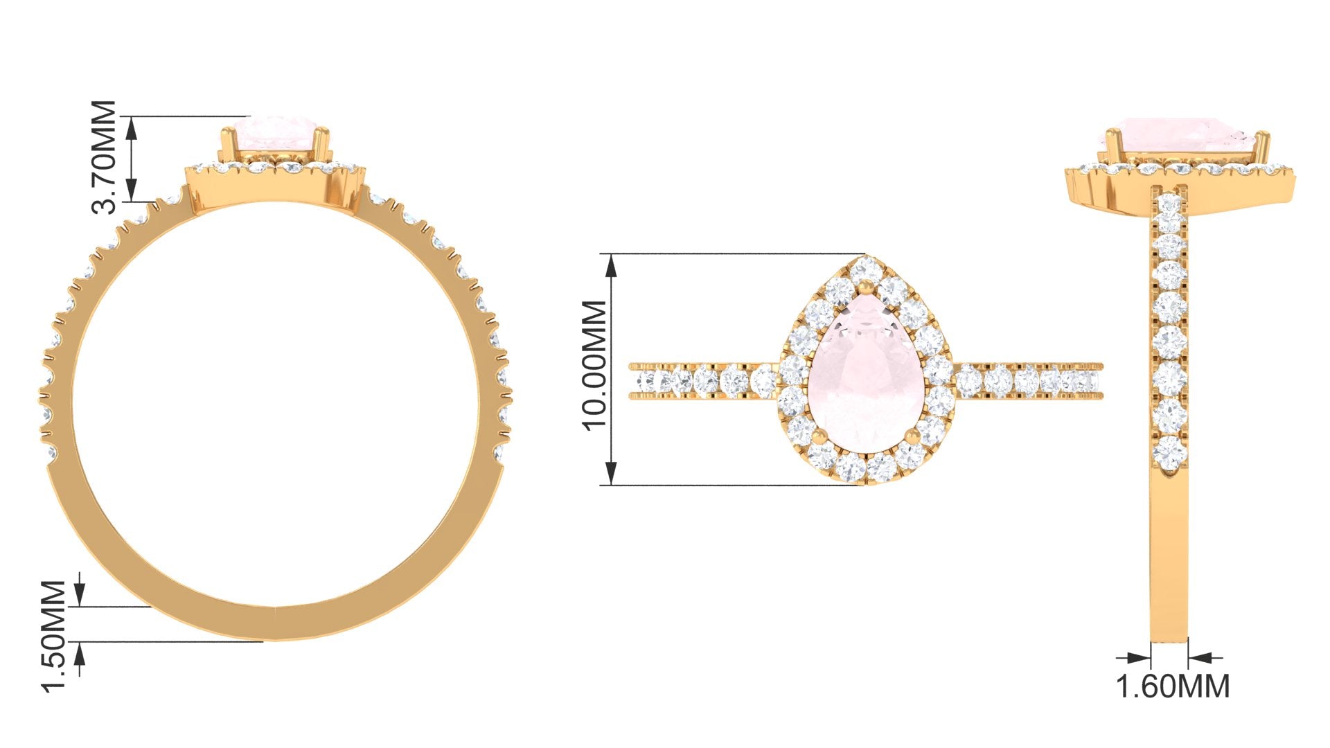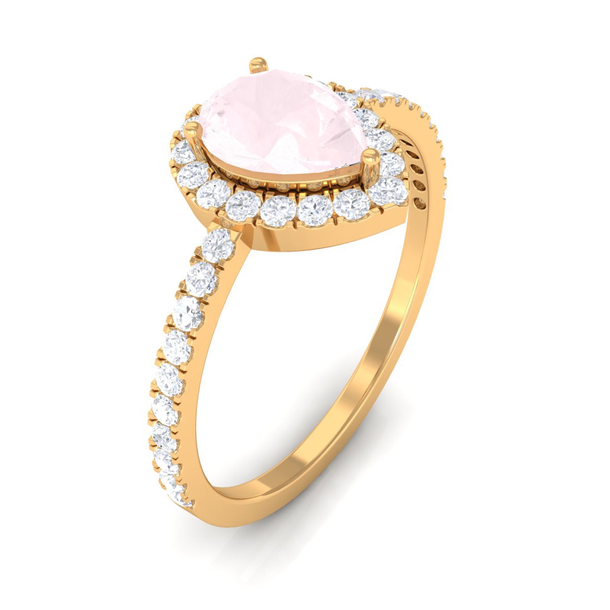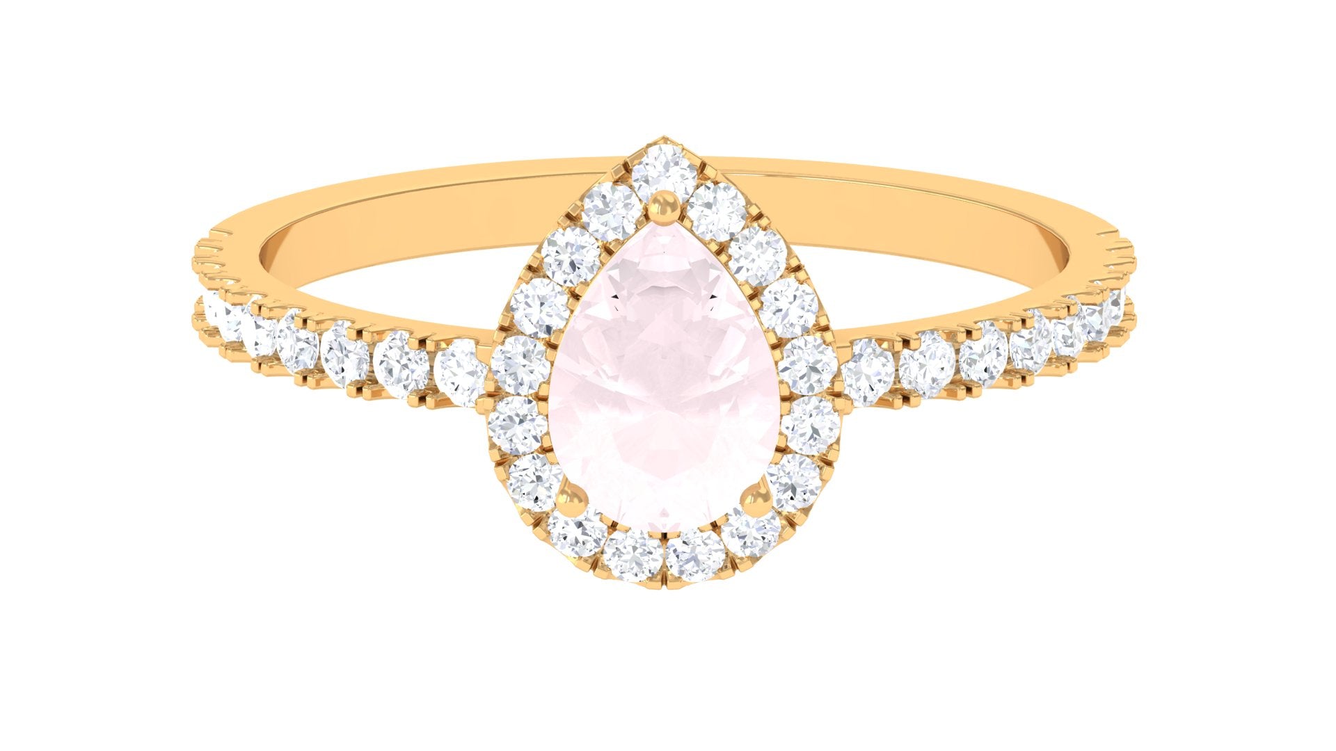 A stunning and timeless Teardrop Engagement Ring with a beautiful design would make a wonderful gift for your significant other. This understated yet elegant engagement ring features a Pear Cut Rose Quartz at the center, surrounded by a Halo of Round Diamond and Side Stones. The Rose Quartz Engagement Ring is crafted with Gold Metal for a luxurious finish.
