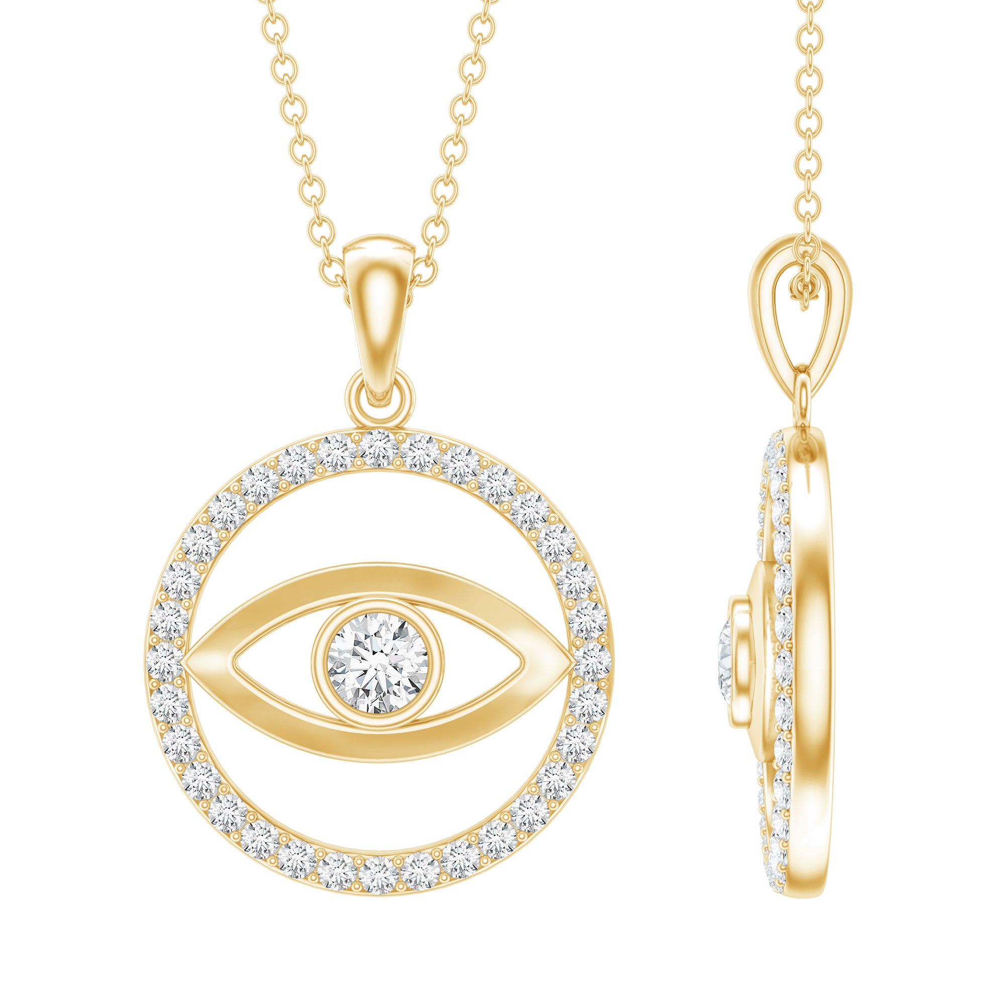 This trendy Evil Eye and Eternity Pendant is all what you need to set the trend out there. It is embedded with Round Shape Moissanite Gemstone set in the Bezel Setting at the centre and encircled by Moissanite Eternity. This pendant is crafted in solid Gold