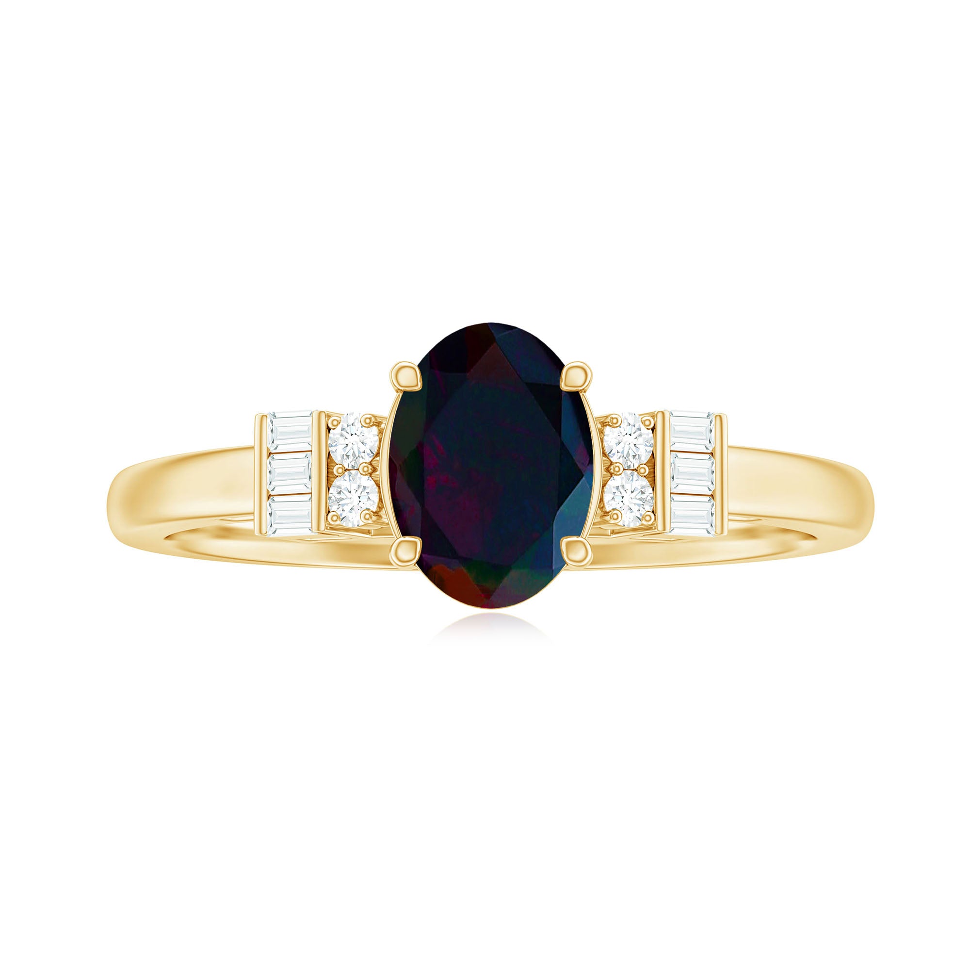 Graceful and divine, this Black Opal Engagement Ring is a classic piece of fine jewelry, artistically crafted in Gold for a perfect and luxurious look. Oval Shape Black Opal Ring has Baguette and Round Diamond embellishing the ring from sideways. Make your significant other extremely happy by presenting her with this Black Opal Diamond Ring.