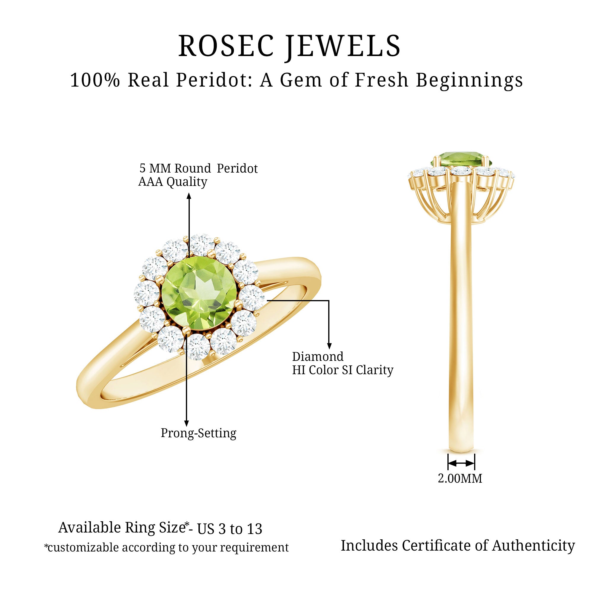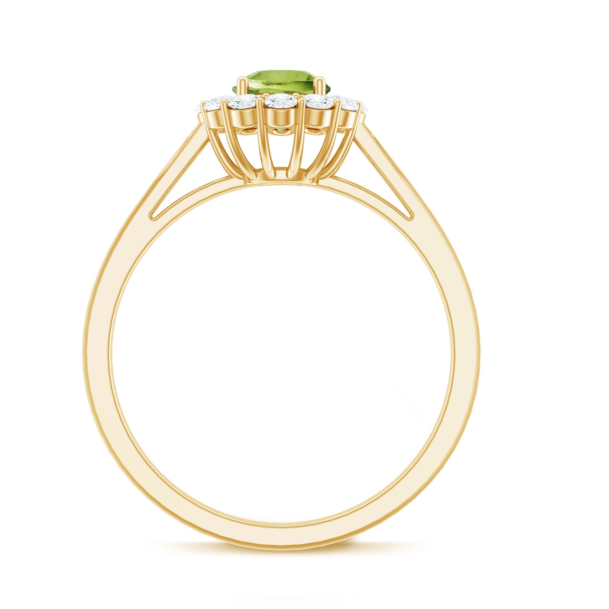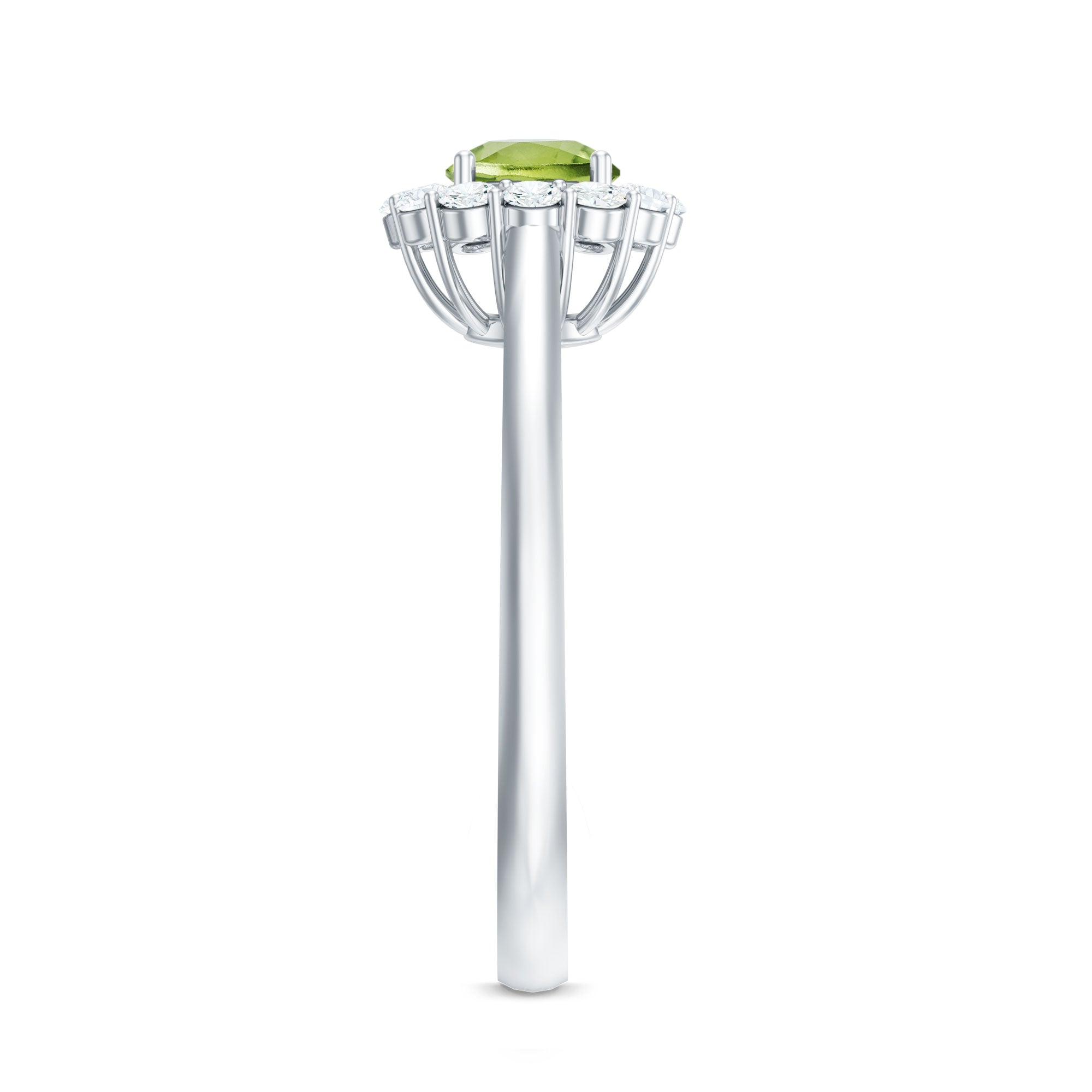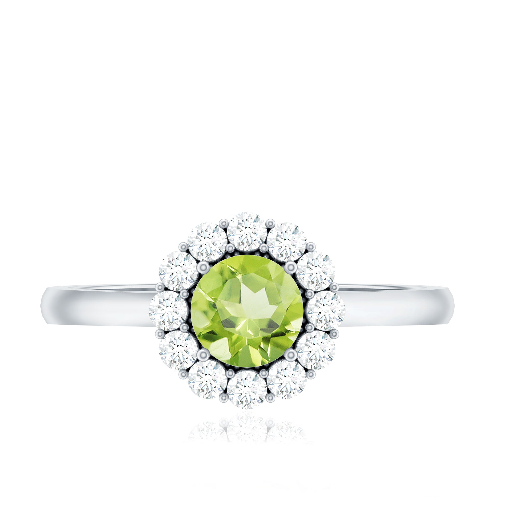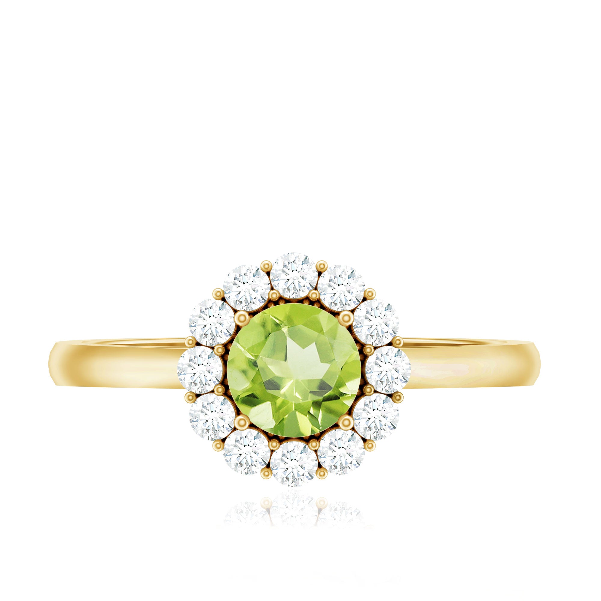 Enhance your beauty with Floating Halo Engagement Ring is embellished with Round Shape Peridot Set as a solitaire in a prong setting and Round Shape Diamond in a floating Halo. This Engagement Ring is composed of solid gold.
