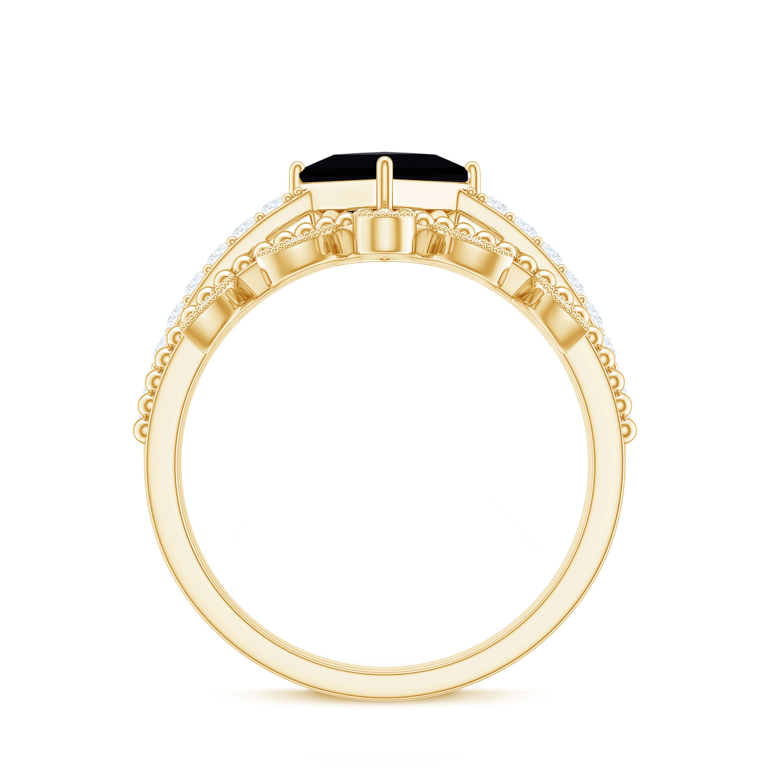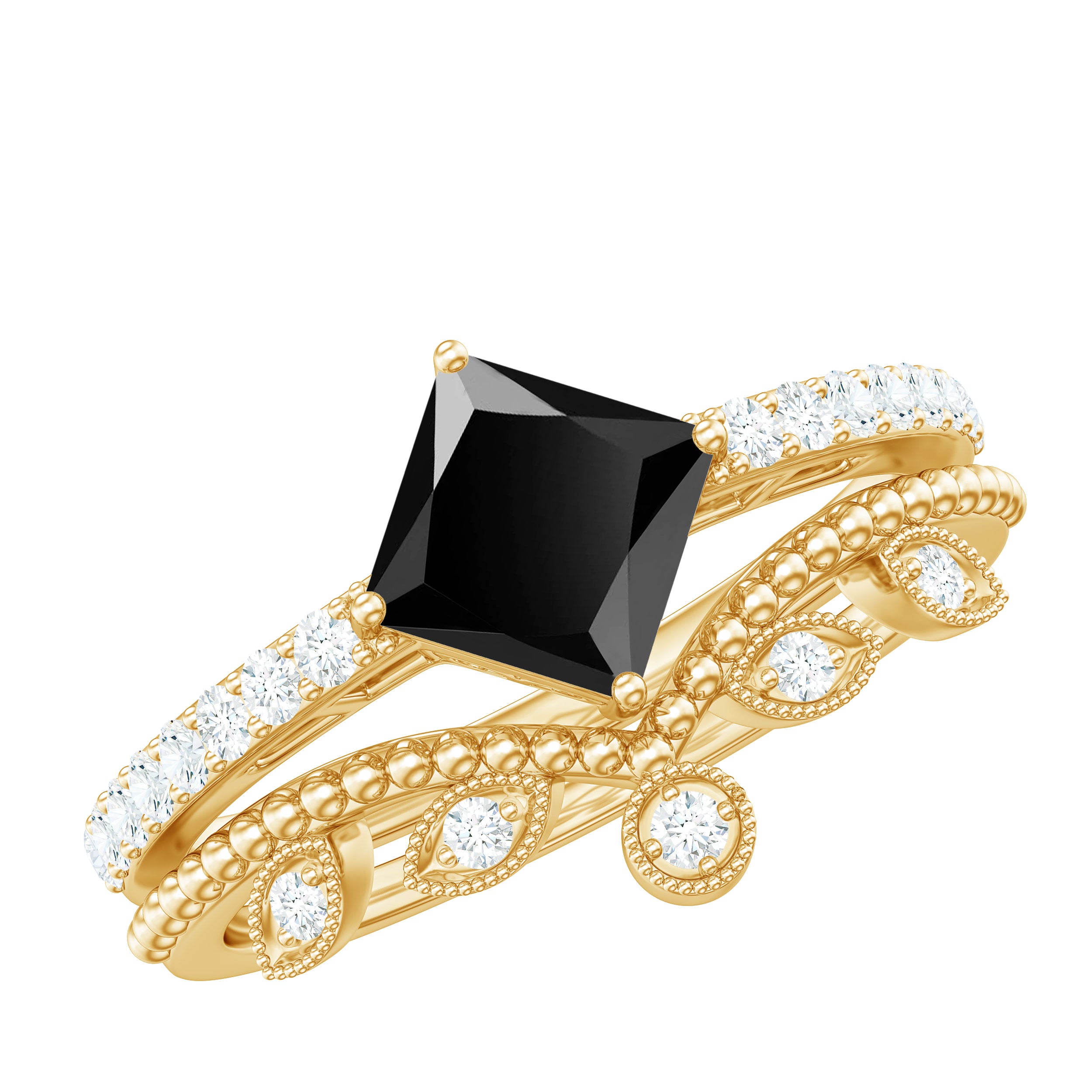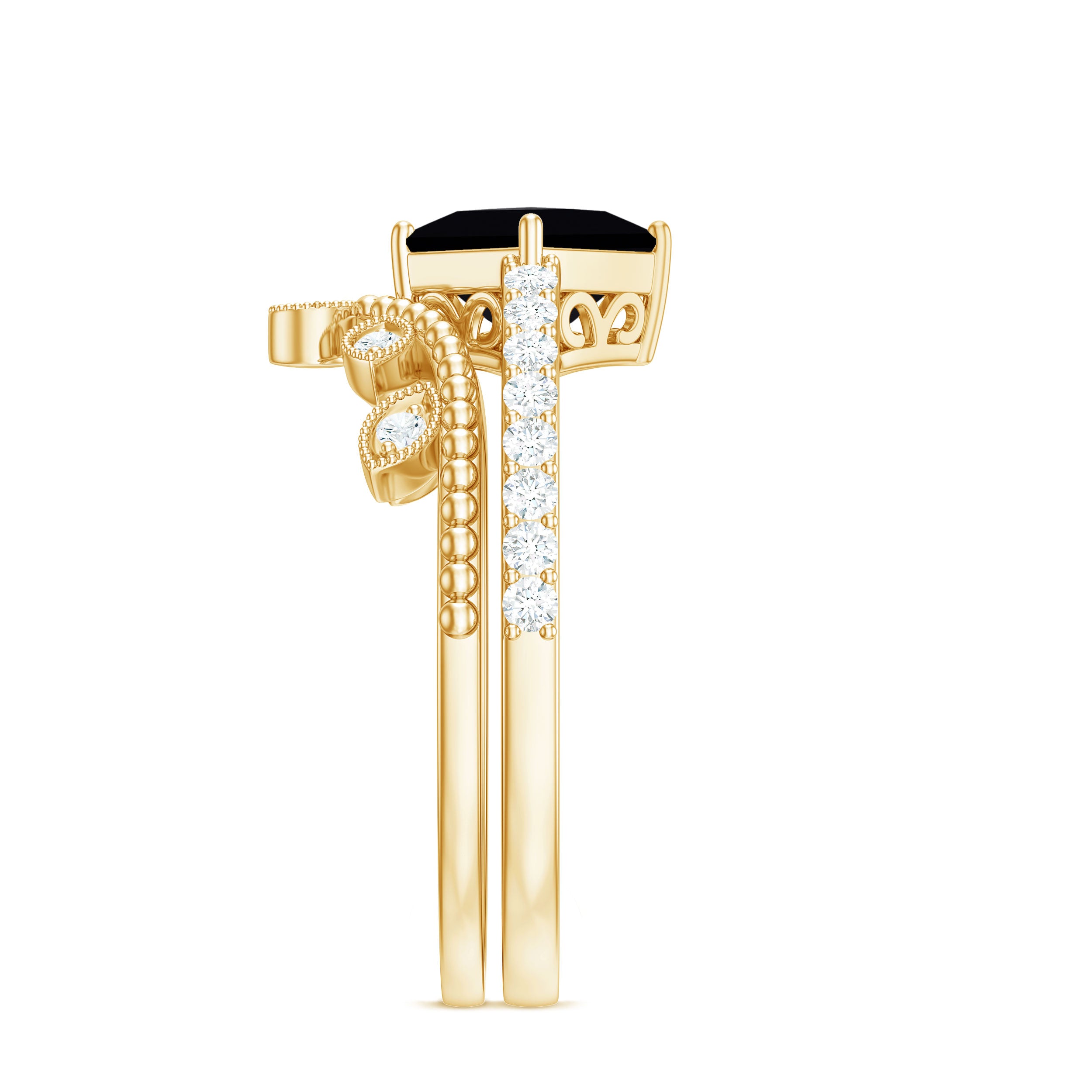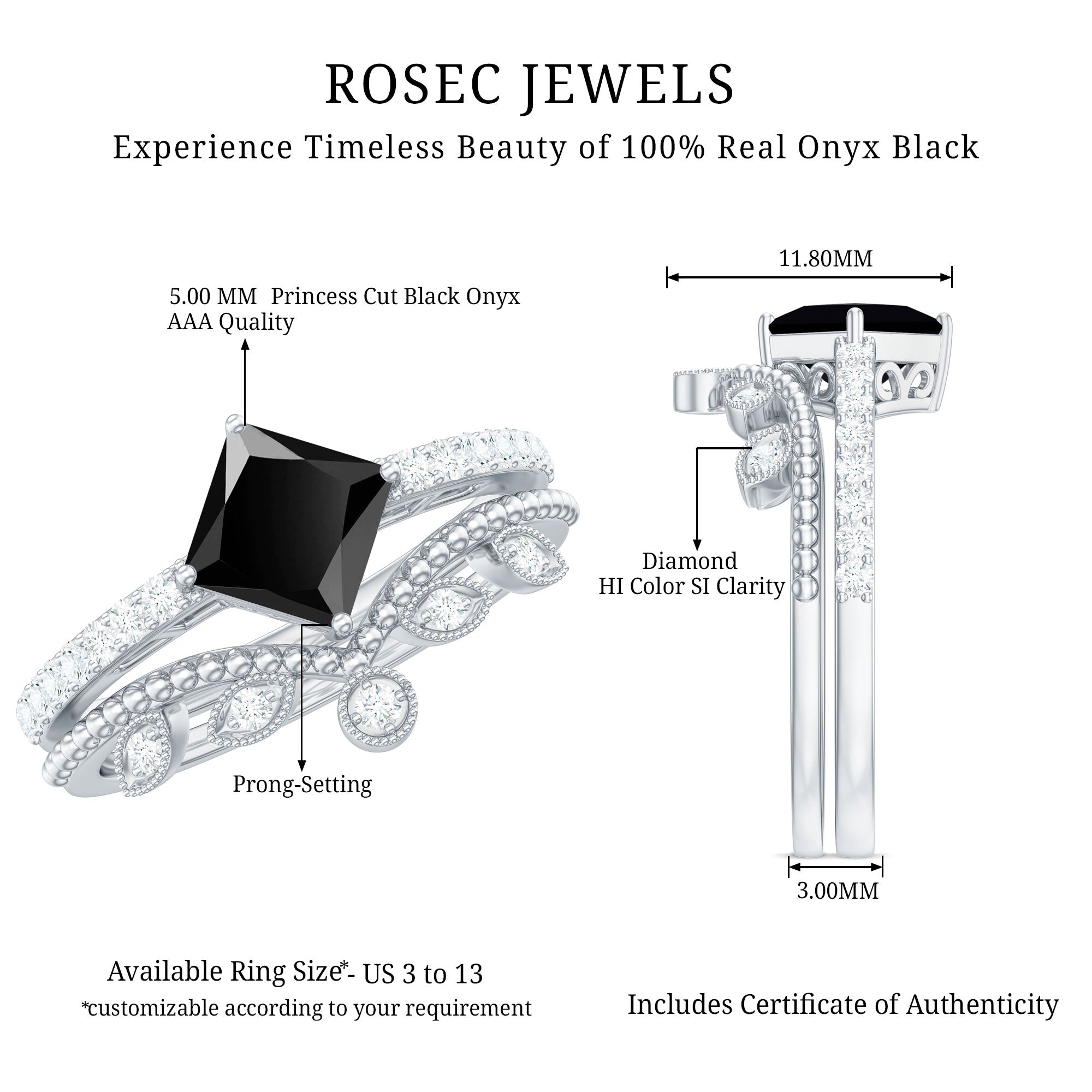 This Onyx Wedding Ring Set is a harmonious blend of sparkle and elegance, presented in the most graceful manner. Featuring a striking 5 MM princess cut AAA quality Black Onyx at its center with round shape Diamond set as side stones in the engagement ring. The curved enhancer ring further enhances the brilliance with round Diamond stones that are designed to embrace the engagement ring flawlessly. This Curved Wedding Band is embedded with beaded design, gives it a vintage look and add a unique charm to the Engagement Ring with Wedding Band Set. This Black Onyx Engagement Ring Set is ideal for anyone seeking something meaningful, striking, and full of character. Whether for an engagement, wedding, or simply to celebrate love, this Bridal Rings Set is crafted to shine, just like your everlasting bond. Packaged in a luxurious signature jewelry box, this Wedding Ring Set is all set to celebrate the start of your forever. Gift her a ring that mirrors the light she brings into your life - a radiant symbol of love, made to endure a lifetime.