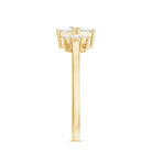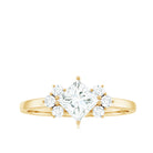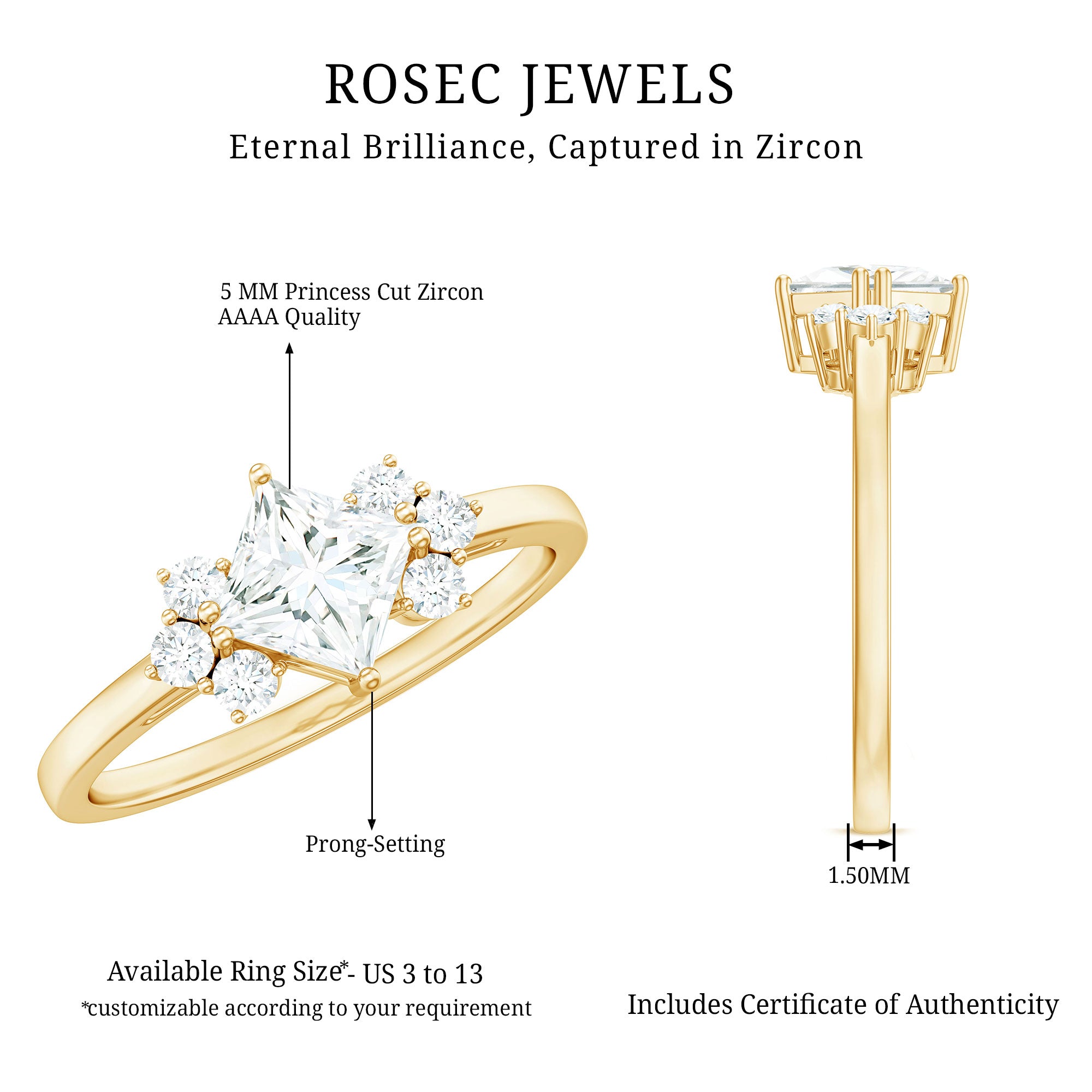 A true classic in every possible way, this is a kind of Engagement Ring embellished in Princess Cut Zircon set as solitaire in Prong Setting while the trio of round cut zircon on both the sides creating a sparkling look. This Simulated Diamond Ring is for Women beautifully composed in Gold. Make her day happier by presenting this enchanting CZ Trio Ring.