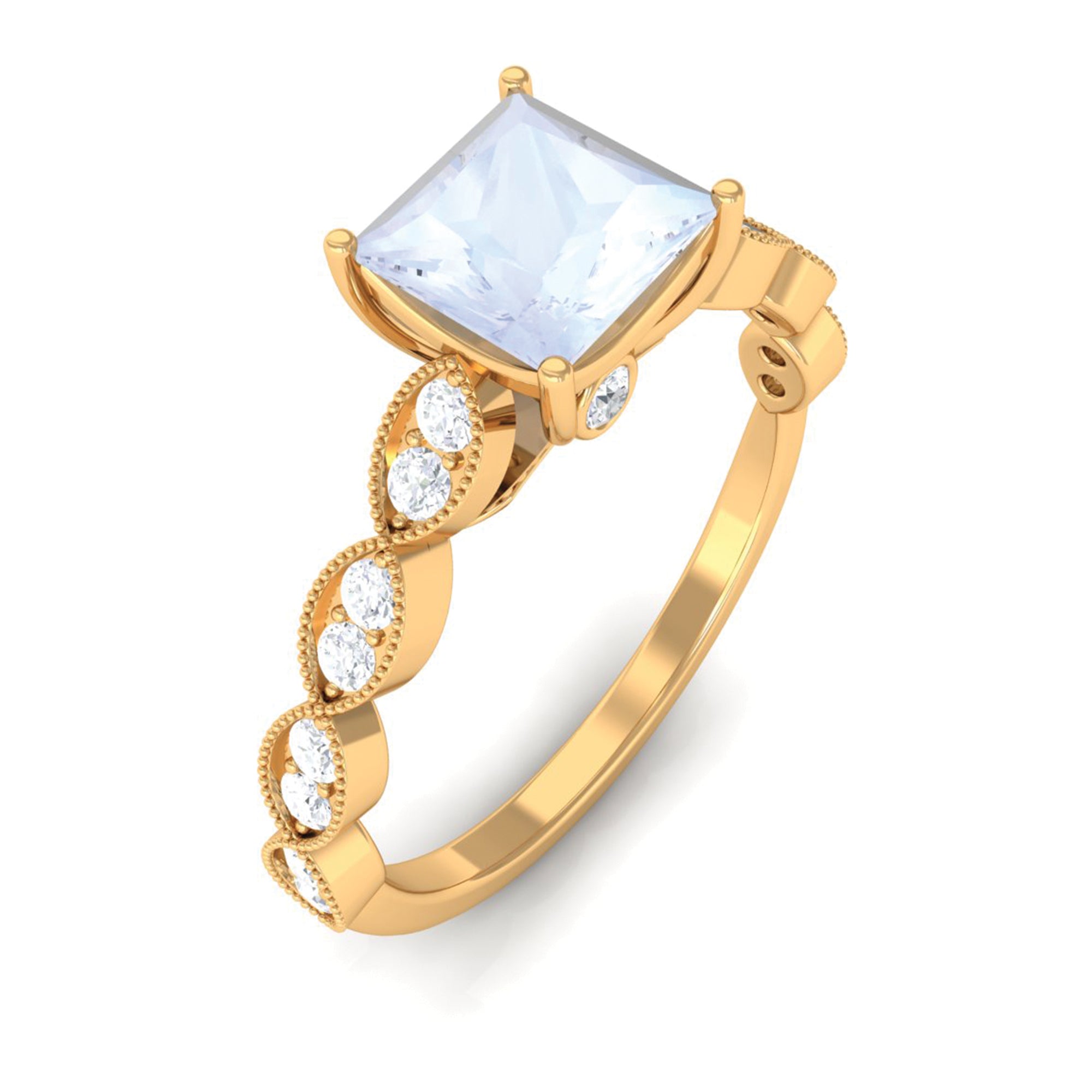 This stunning solitaire ring is a truly unique and eye-catching piece of jewelry. The center stone, a lustrous moonstone, is princess cut and set in prong setting, allowing the stones natural beauty to shine through. The Diamond side stones studded over the mesmerizing gold beaded shank, adds extra sparkle and brilliance to the piece, making it truly dazzling. This ring is perfect for those who appreciate unique and unconventional designs, while still appreciating classic elegance. The moonstone is a symbol of intuition and new beginnings, making it a meaningful choice for your special someone. This ring is a beautiful way to show your love and commitment to your partner.