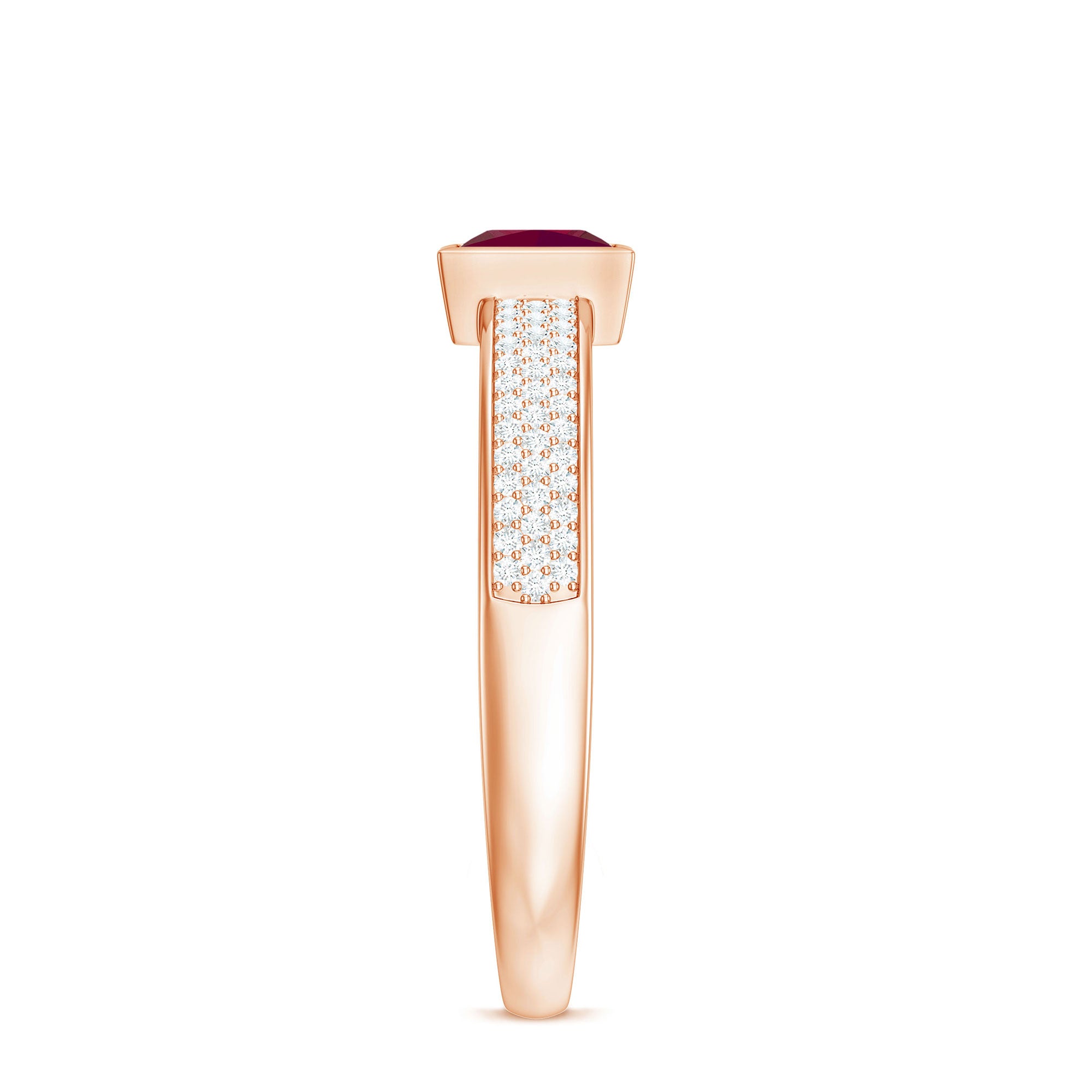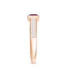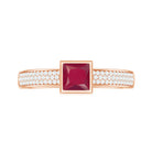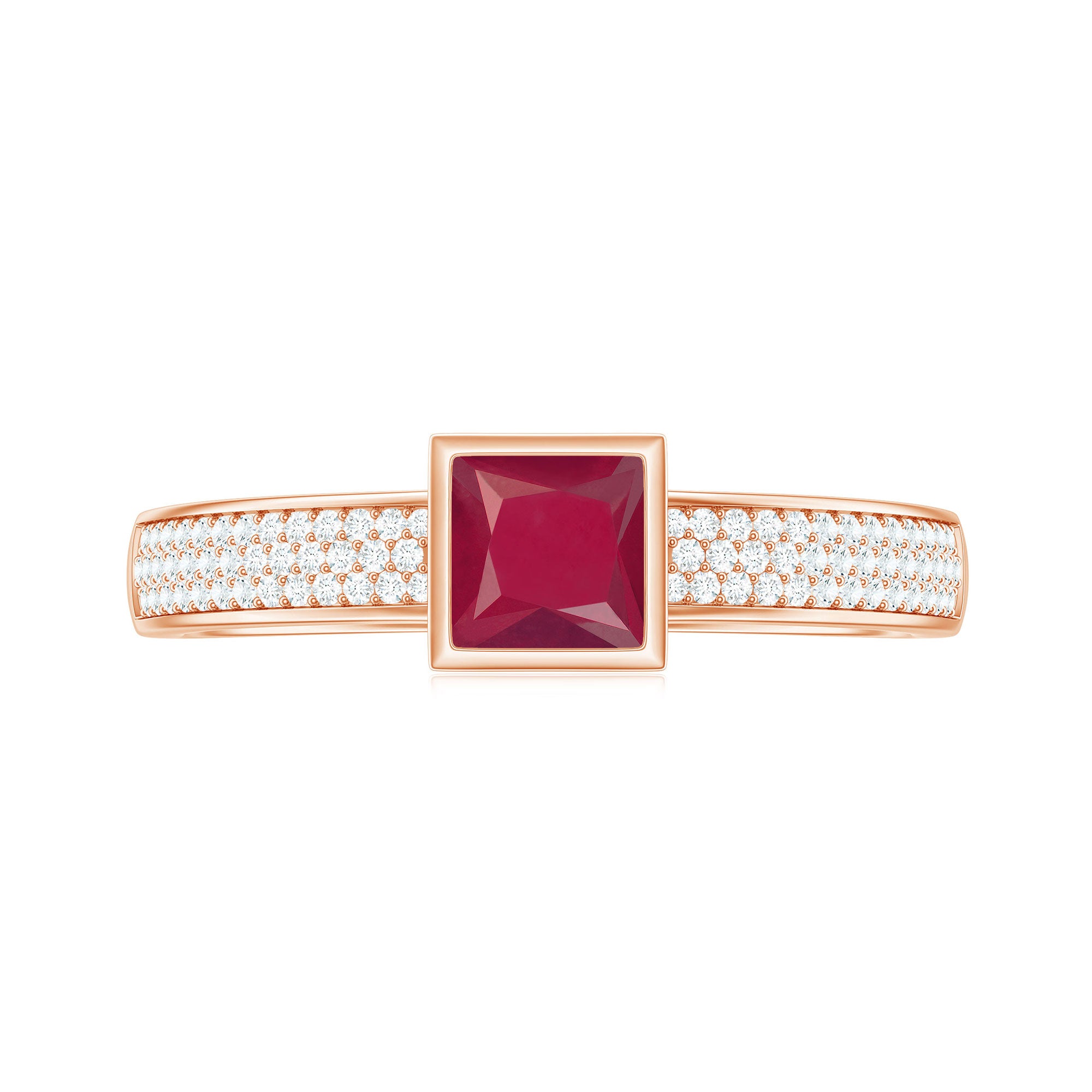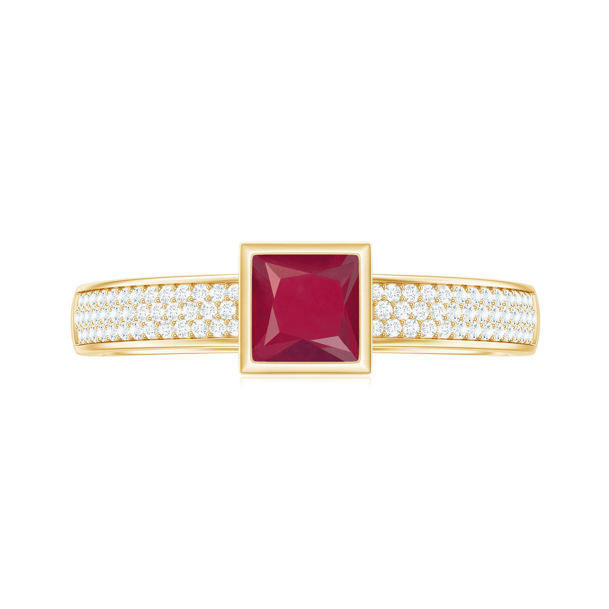 This Ruby Engagement Ring lends an air of grace and elegance to your special day. It embellished with Princess Cut Ruby in Bezel Setting with Diamond Side Stones in Pave Setting. This Ruby and Diamond Engagement Ring is beautifully crafted in Gold. Present this Ruby Gold Ring to her and make her feel like a princess.