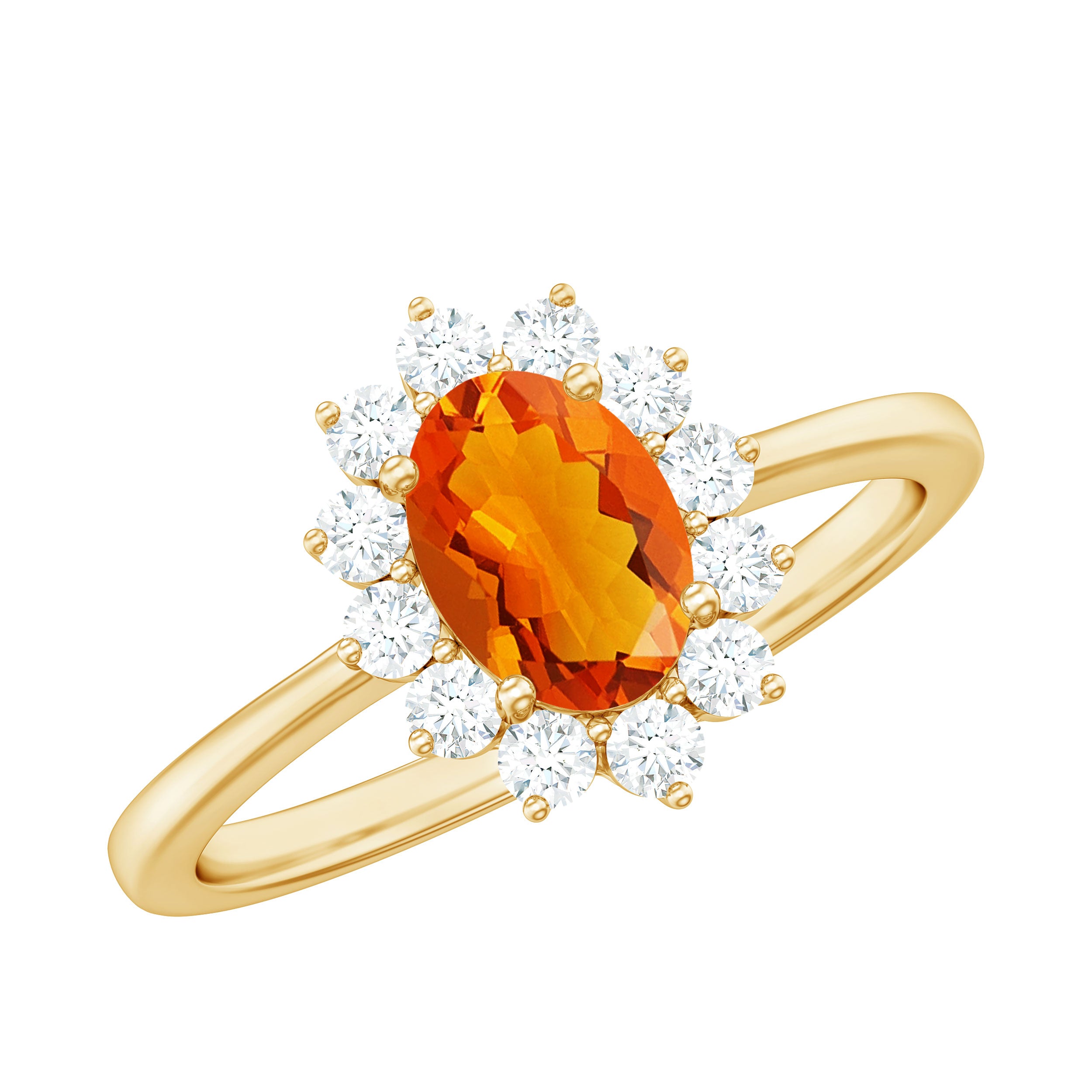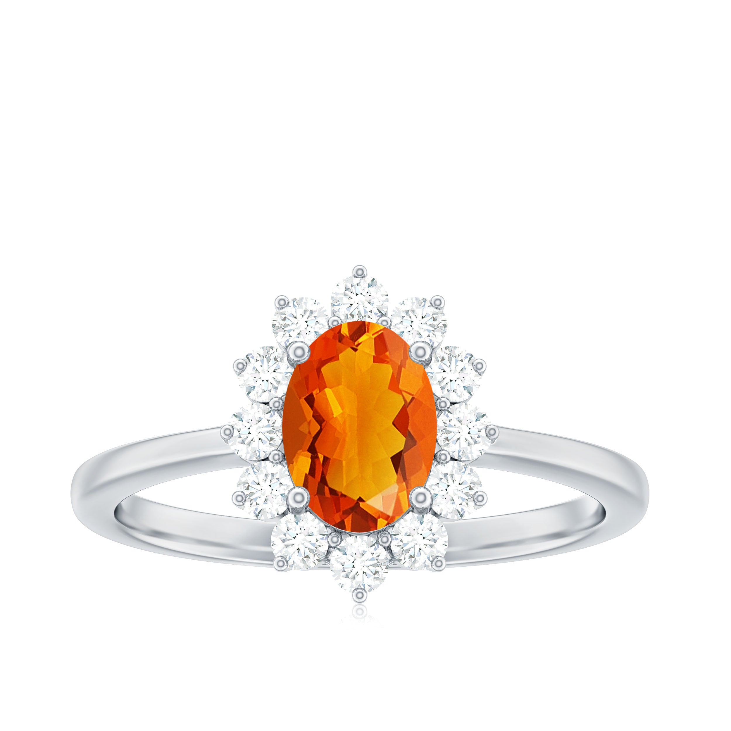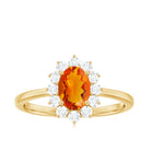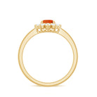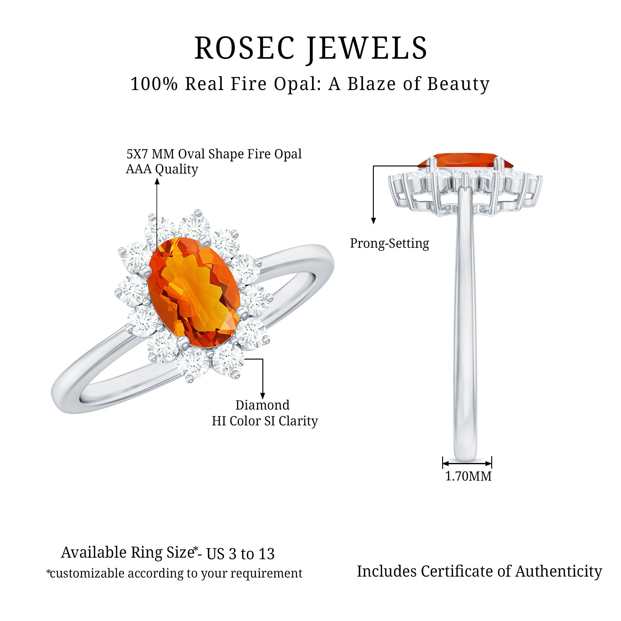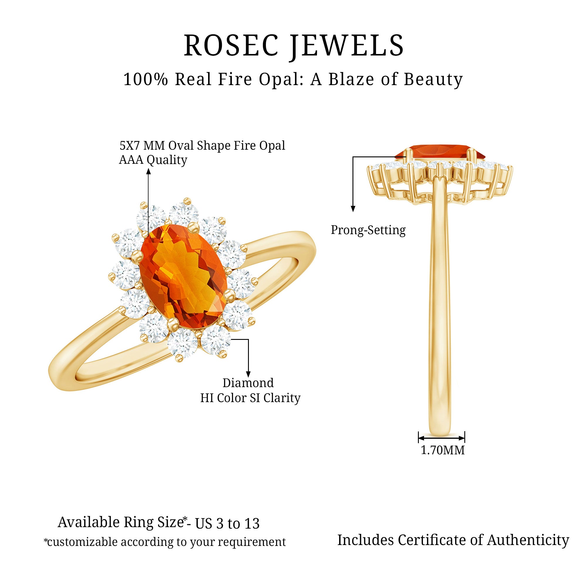 Propose to your beloved with the exquisite Fire Opal Ring and make her feel like a princess. This engagement ring is inspired by Princess Diana and features a 5X7 MM oval cut Fire Opal gemstone in a prong setting, surrounded by Diamond stones. With this natural Fire Opal ring, your love will always be with her, no matter where she goes. The total weight of the ring is 1 carat, and the gemstone has a AAA clarity rating. Rest assured, all our gemstones are certified and go through a rigorous quality check process.
