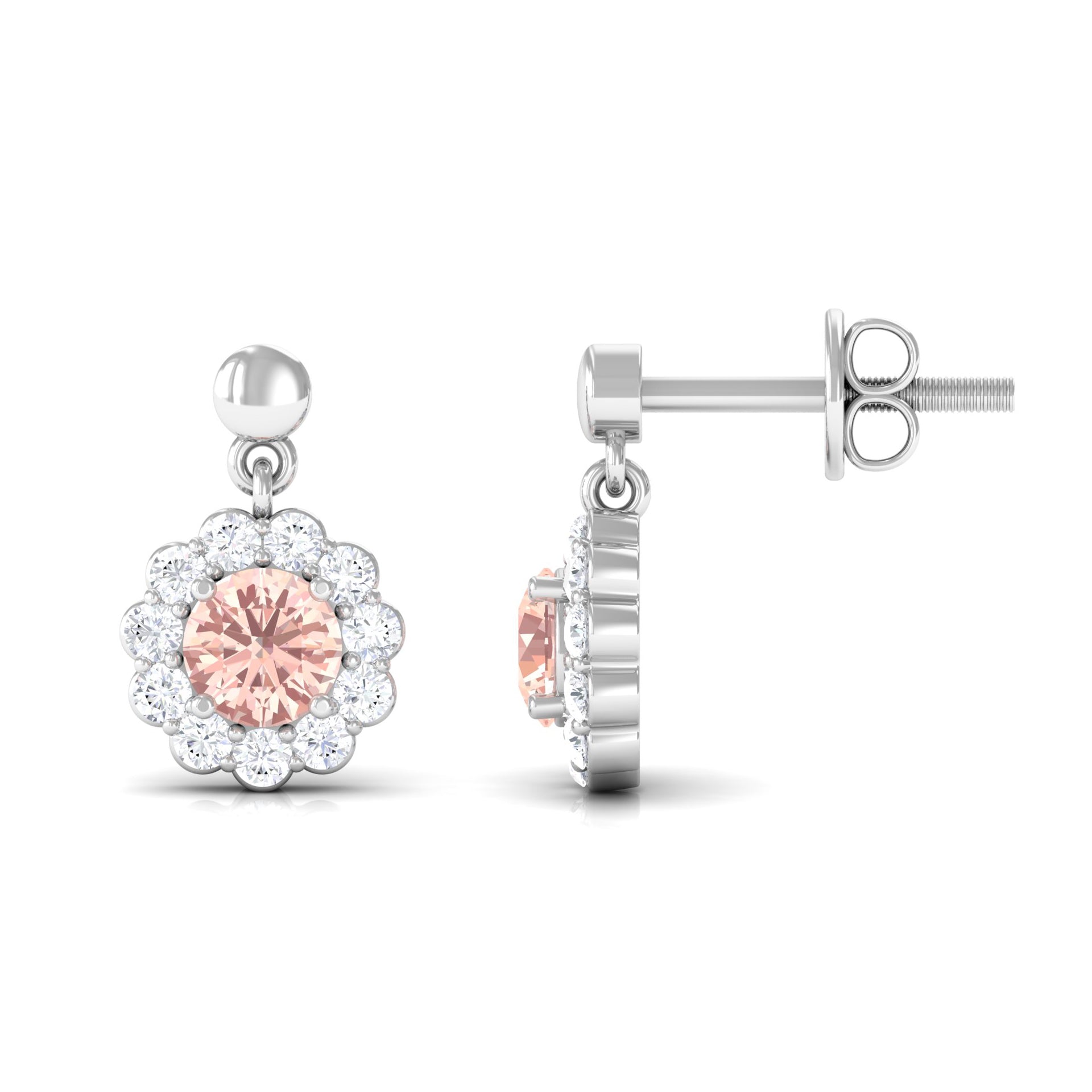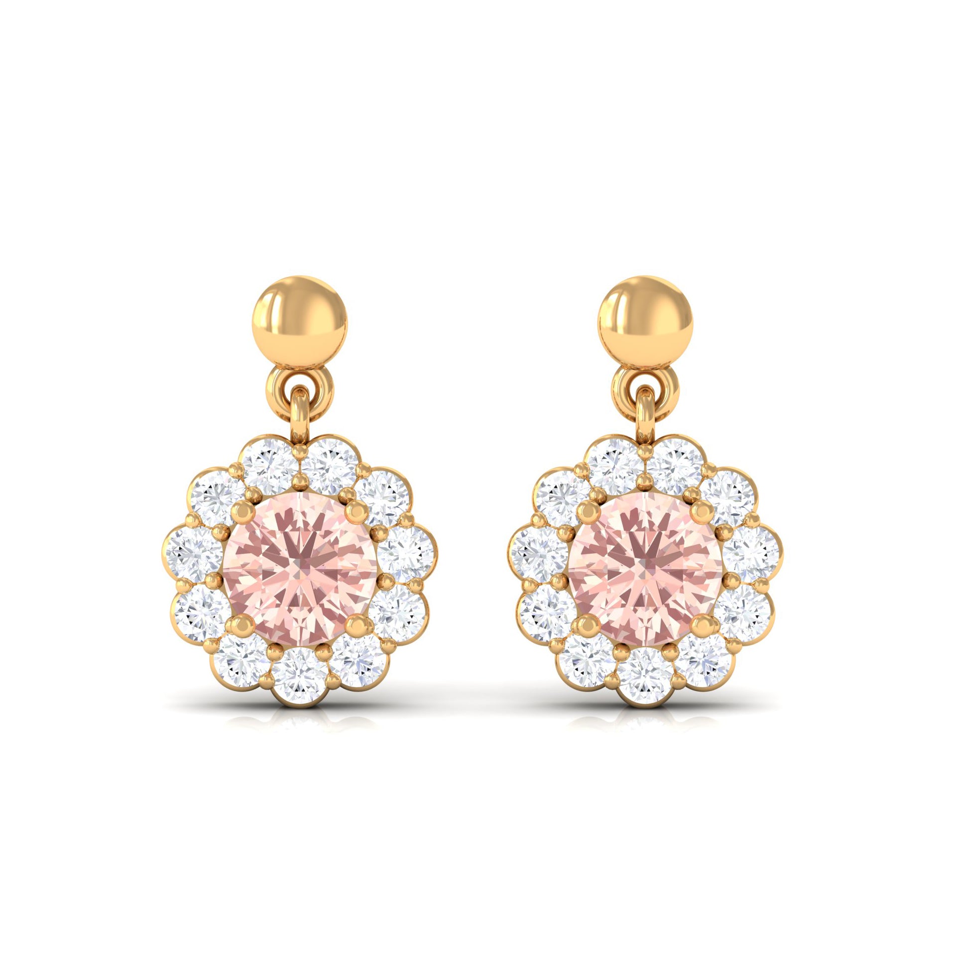 Complete your outfit with this elegantly designed Morganite Earrings. This Flower Drop Earrings is crafted with Gold and adorned with Round Shape Morganite with Diamond to make for a lovely choice for different occasions. These Halo Earrings and your love make her eyes glitter.