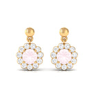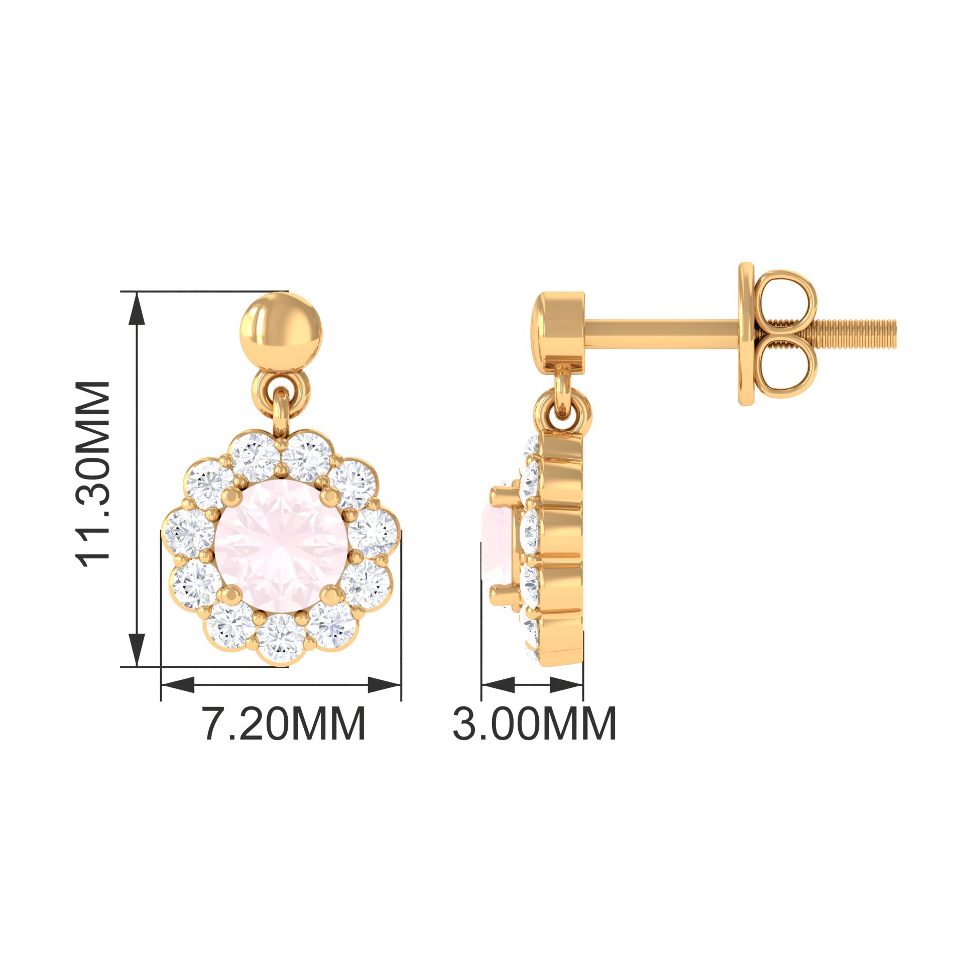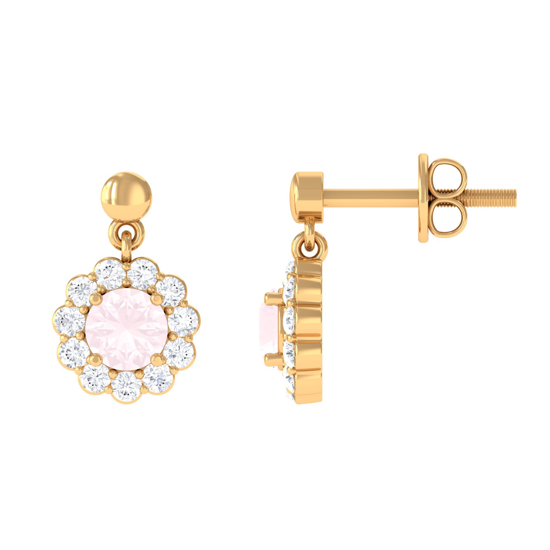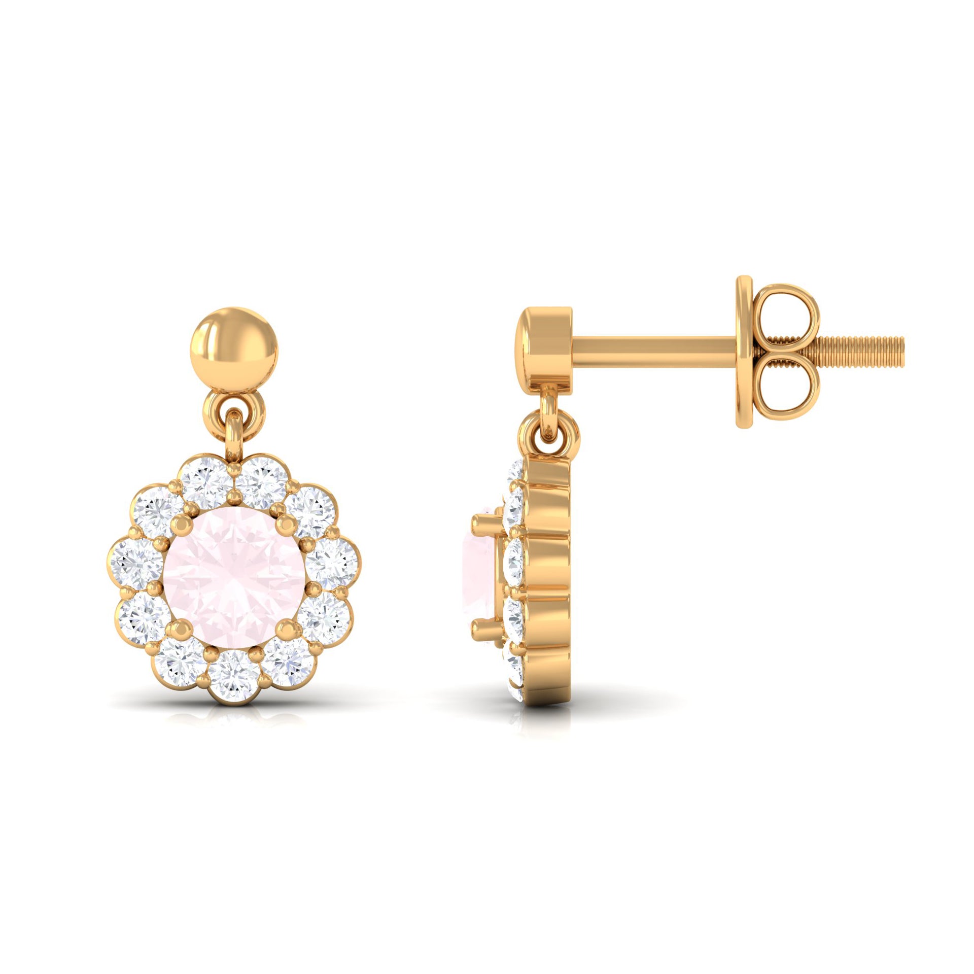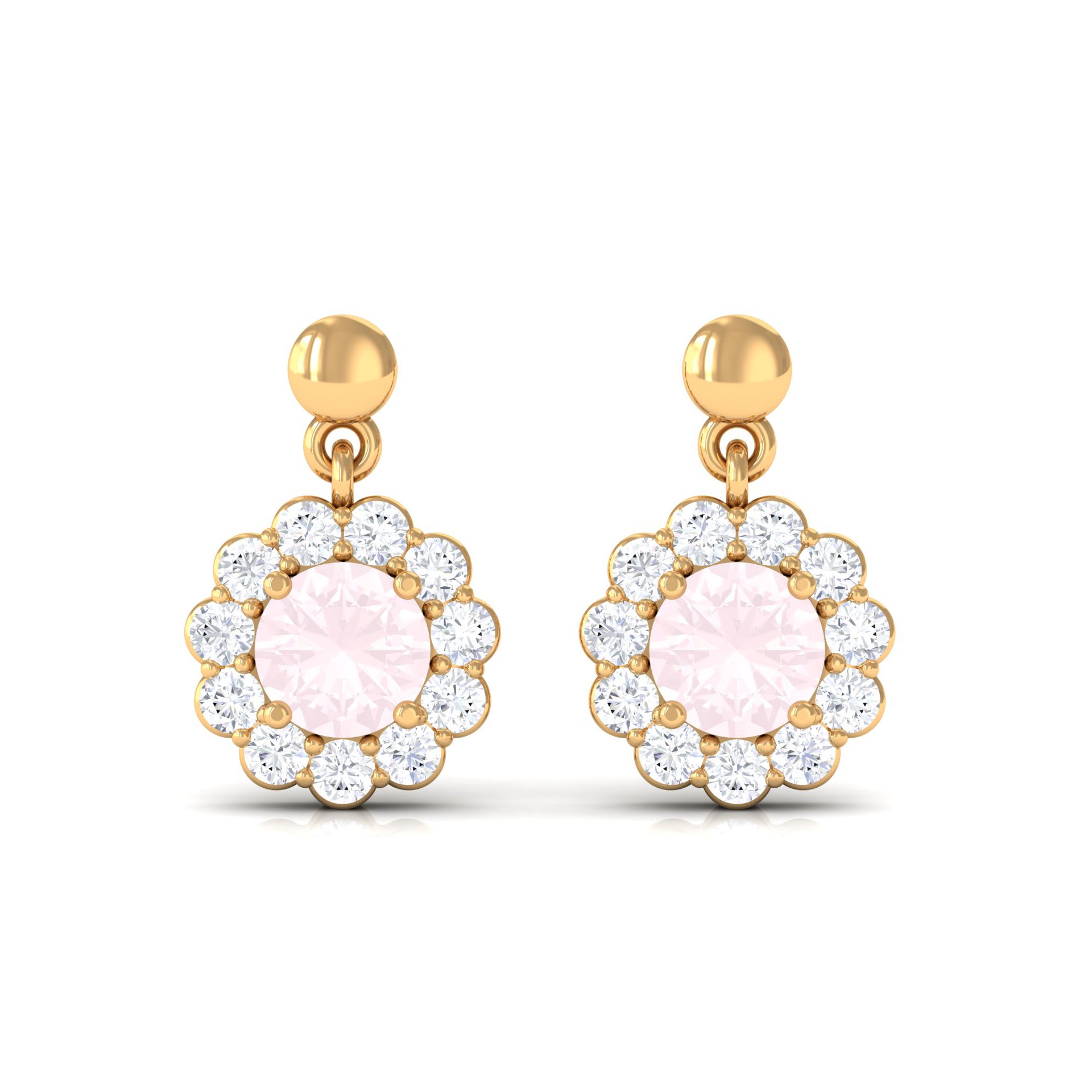 Complete your outfit with these elegantly designed Rose Quartz Earrings. These Flower Drop Earrings are crafted with Gold and adorned with Round Shape Rose Quartz with Diamond to make for a lovely choice for different occasions. These Halo Earrings and your love make her eyes glitter.