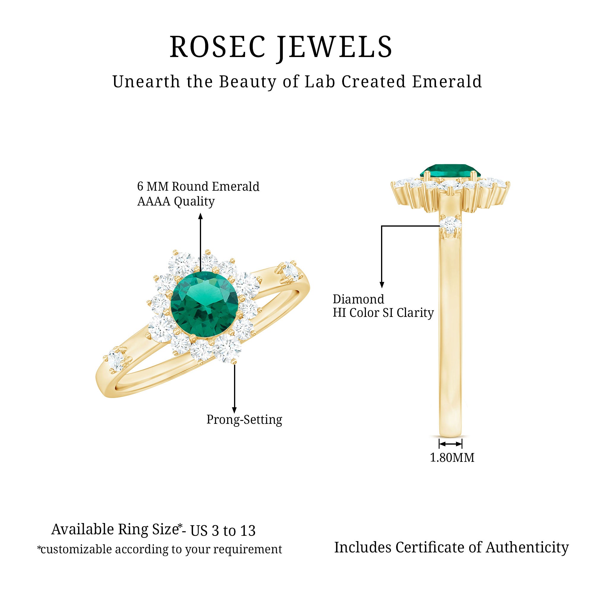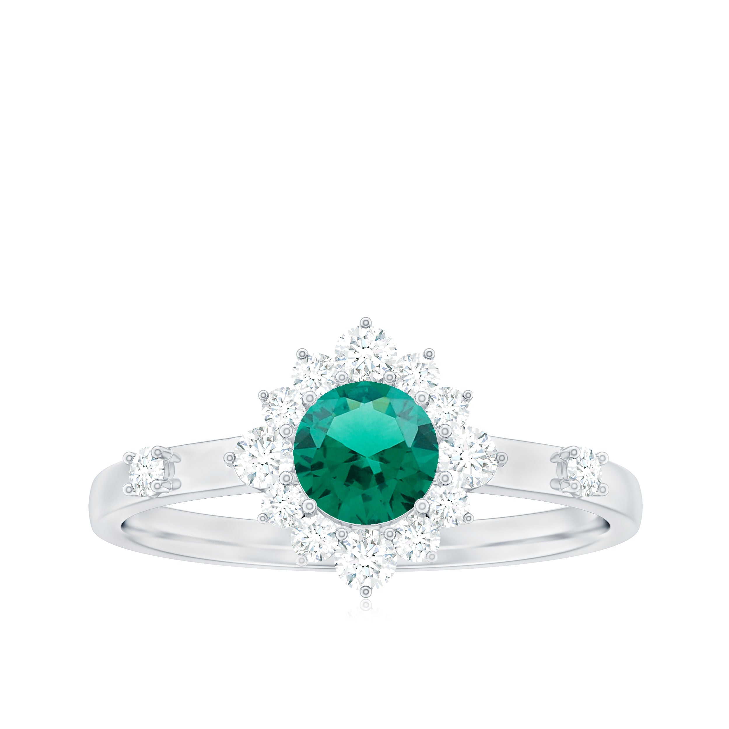 Timeless elegance meets fresh design in this Classic Engagement Ring with a twist. At its center is a 6 mm Round Shape Lab Created Emerald set in Prong Setting, rich in color, full of life and sustainably created for the modern appeal. Framed by a sparkling Diamond Halo, this centerpiece glows with effortless charm and sophistication. What sets this Lab Grown Emerald Ring apart is a carefully placed Diamond stone on either side of the Band, set just far enough from the center to create a balanced look. It is a subtle detail that makes a big impact, giving this Halo Engagement Ring with Emerald a graceful, contemporary edge. Perfect for the minimalist who still loves a touch of drama, this Lab Emerald Diamond Engagement Ring delivers all the sparkle without going over the top. Whether you are planning a proposal or marking a special moment, this Timeless Engagement Ring is perfect for the one who values beauty with meaning. Presented in a signature jewelry box, it is ready to be unboxed, adored, and worn every day.