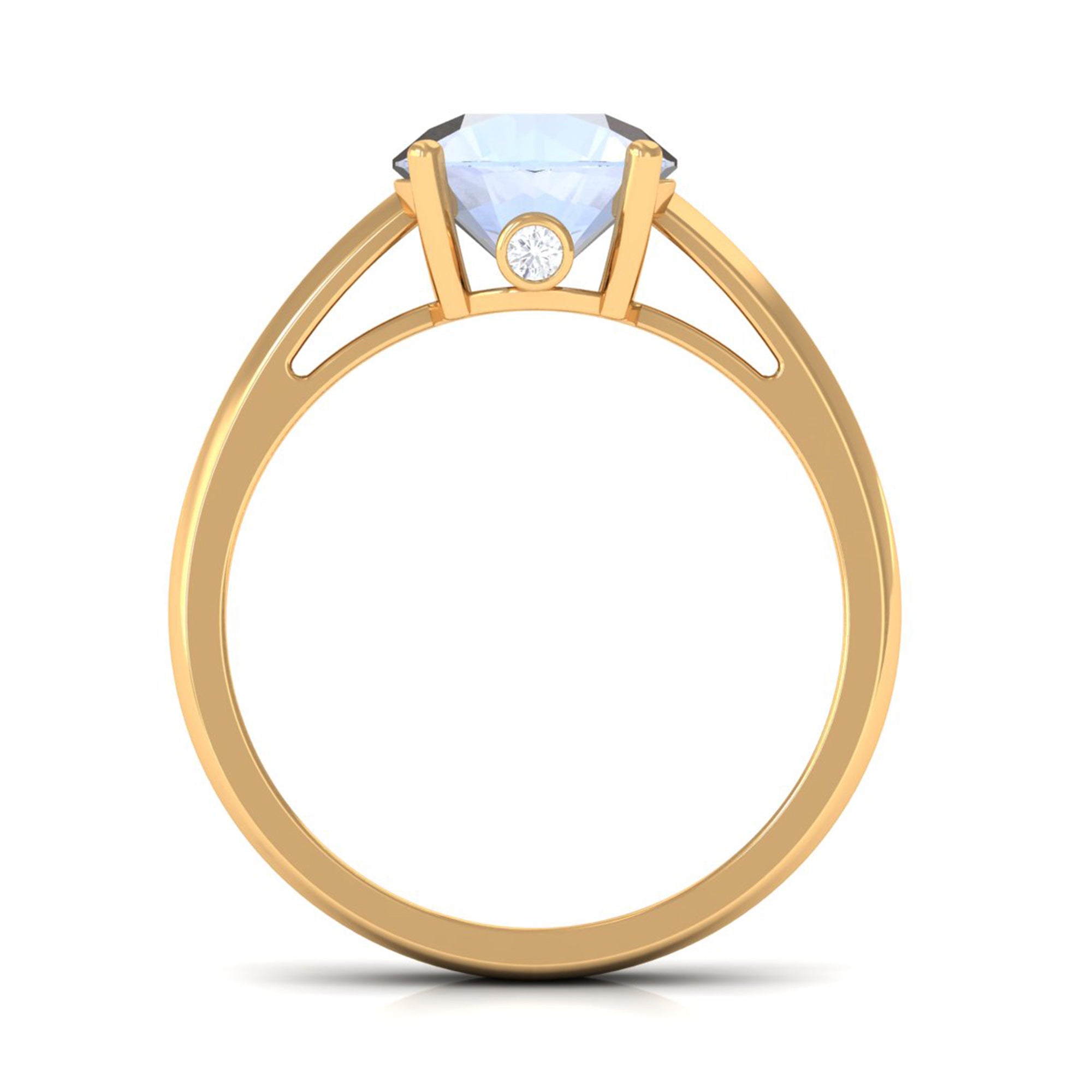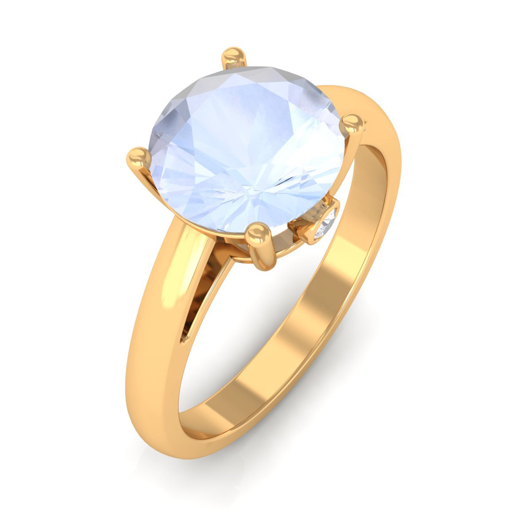 Elevate your style with a touch of shimmer by adorning this elegant Moonstone Solitaire Ring. The sleek band boasts a round-cut moonstone at the center, beautifully embellished with Diamond on the hidden shank. This gold ring is perfect for those looking to achieve a chic and classic look, adding a sophisticated touch to any outfit. Make a statement with this exquisite piece of jewelry.