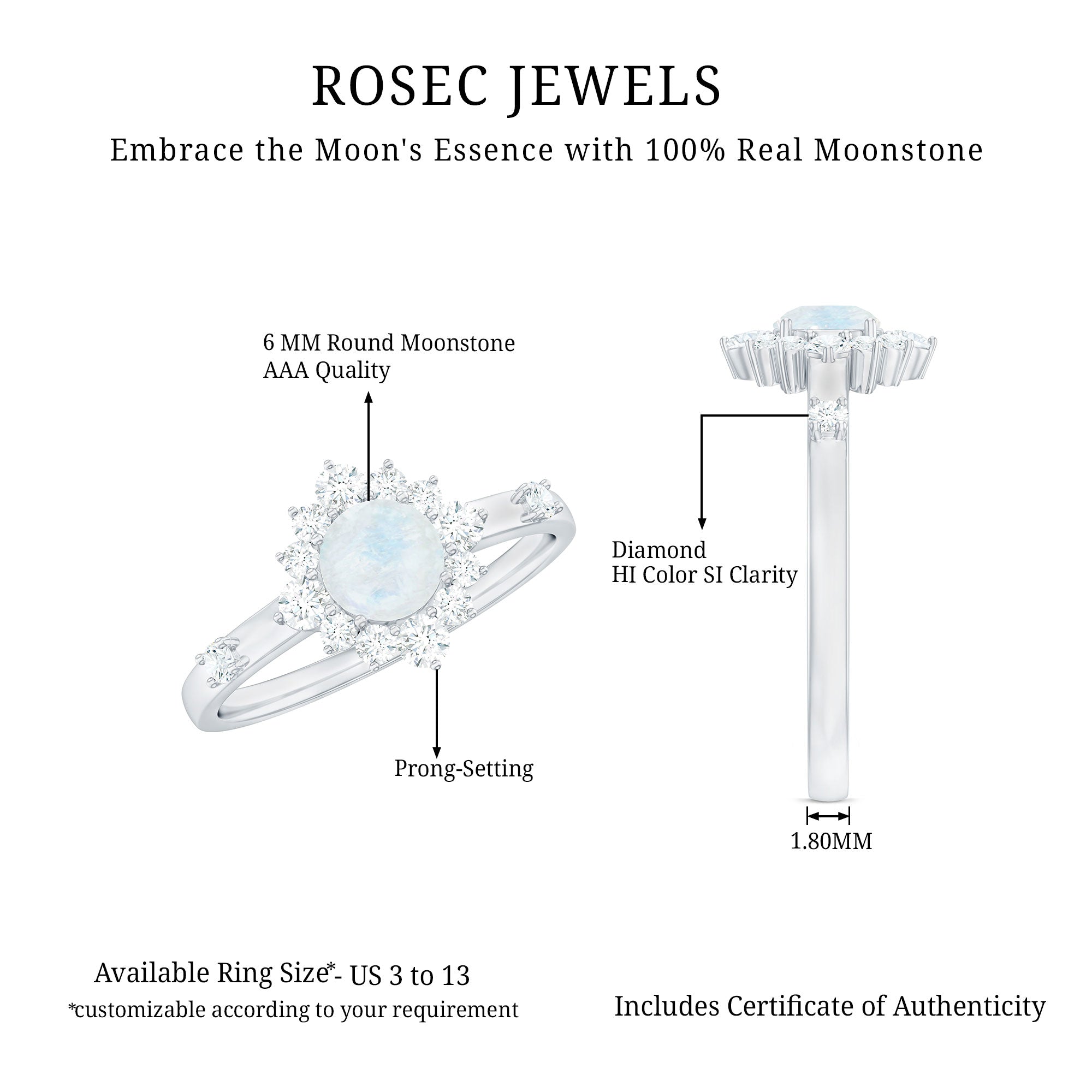 Capture your lasting love with this exquisite engagement ring, showcases a round moonstone center stone surrounded by a halo. This ring is an ideal choice for those who desire a unique and mystical engagement ring that will make a lasting impression. The combination of moonstone and Diamond stones makes this ring a truly breathtaking and unforgettable choice for any special occasion.