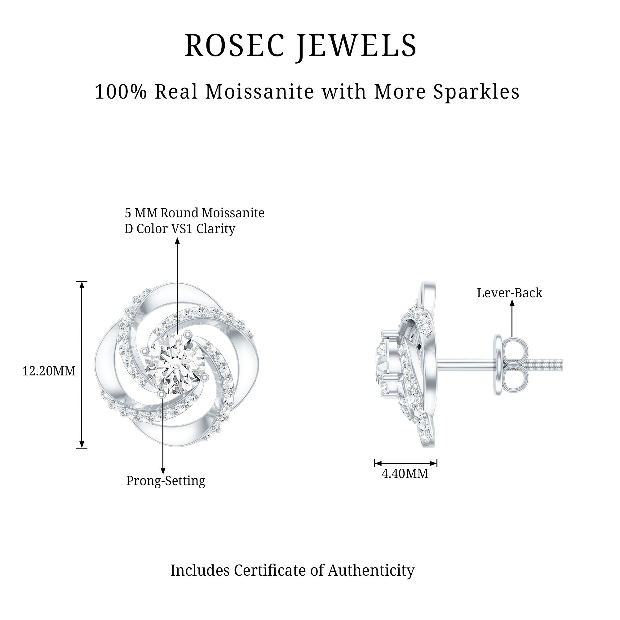 Get ready to steal hearts with these stunning Moissanite Swirl Earrings that are full of sparkle and charm. Designed to stand out, these beautiful stud earrings feature a 5 MM round cut moissanite at the center, secured in prong setting. What makes these Moissanite Stud Earrings extra special is the graceful swirl pattern that wraps around the center stone. The spiral is decorated with tiny round gemstones, adding more sparkle and giving the earrings a stylish and slightly playful touch. These Round Moissanite Earrings are perfect for both everyday wear and special occasions. Whether you are dressing up for a party, heading to a dinner, or simply adding something pretty to your daily outfit, these 1 Carat Moissanite Earrings fit effortlessly with any look. They are designed with secure screw back closures, so you can wear them comfortably all day and night without worrying about them slipping off. They also come beautifully packed in a jewelry box and include a certificate of authenticity, giving you extra confidence in your purchase. If you are searching for a meaningful gift, these Swirl Studs are a wonderful choice for birthdays, anniversaries, weddings, or just because. For your mom, sister, wife, daughter, or best friend - a sparkling pair like this always says, You are truly special.