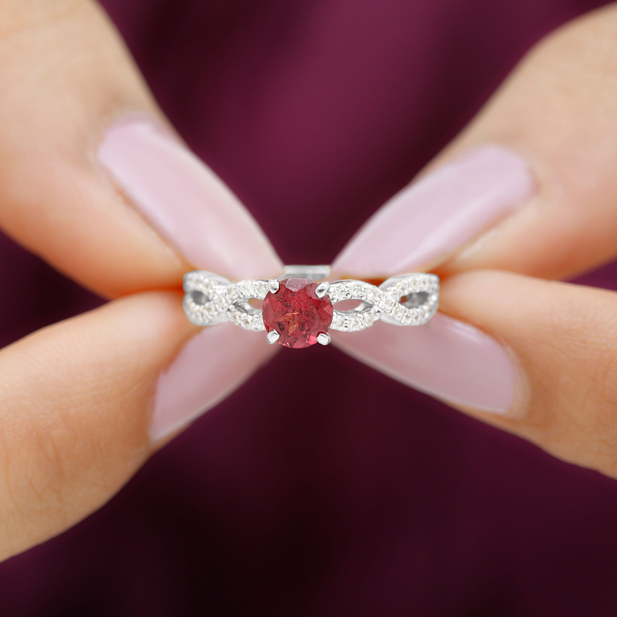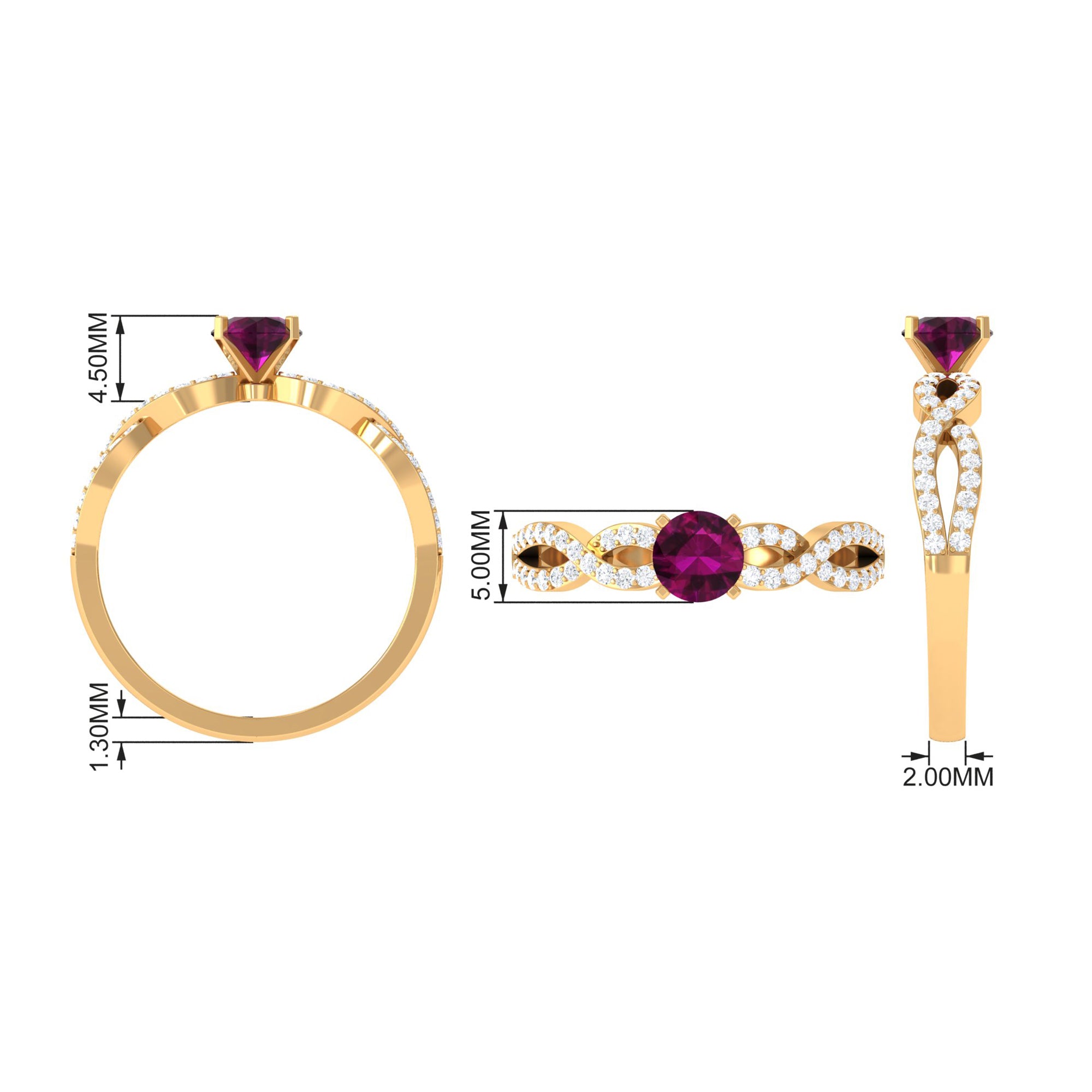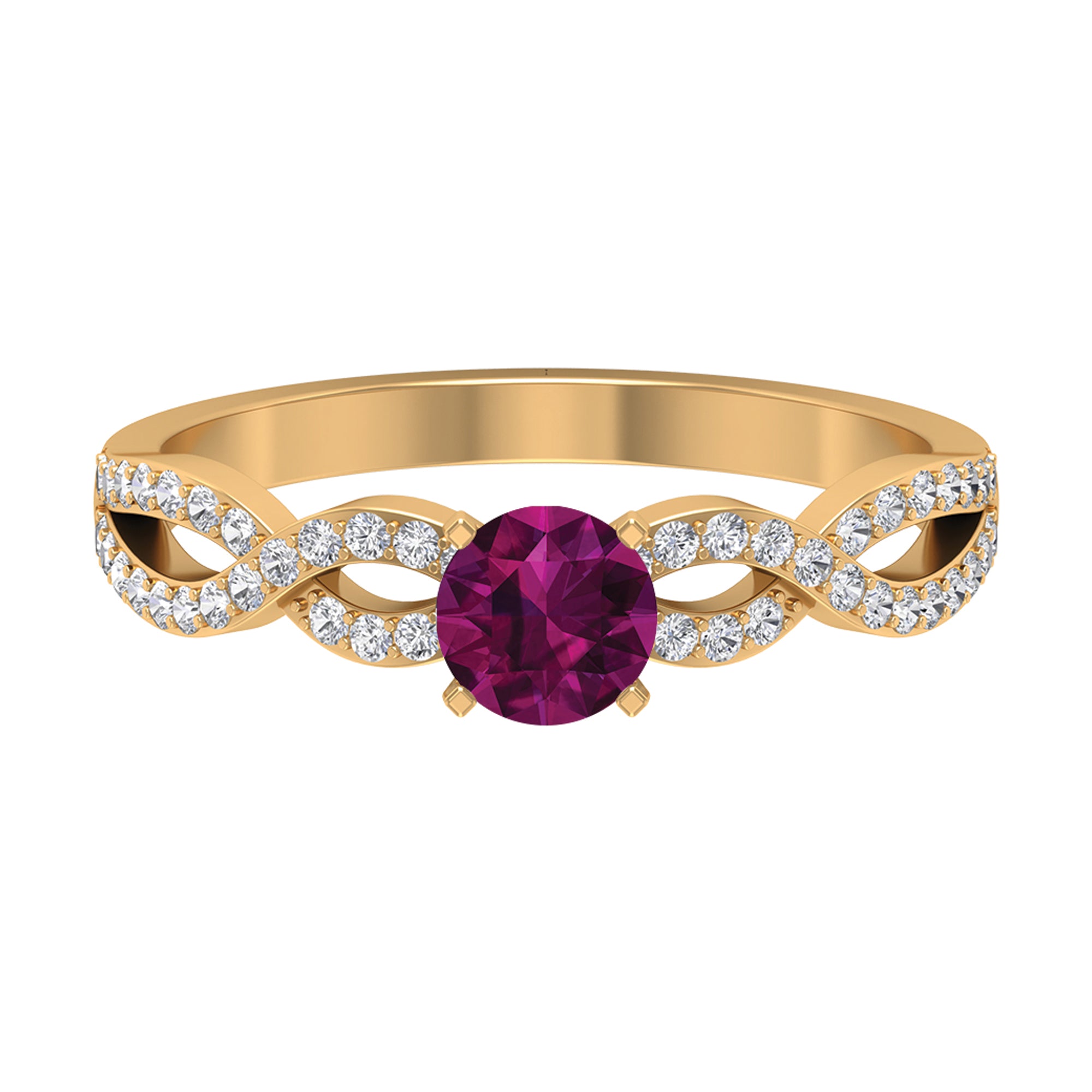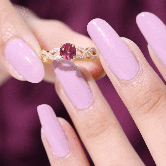 Express your love with this lovely Criss Cross Ring with Round Shape Rhodolite set as a solitaire adorn this Solid Gold with Diamond Side Stones in Crossover Shank to make for a charming present for your beloved on Valentines day.