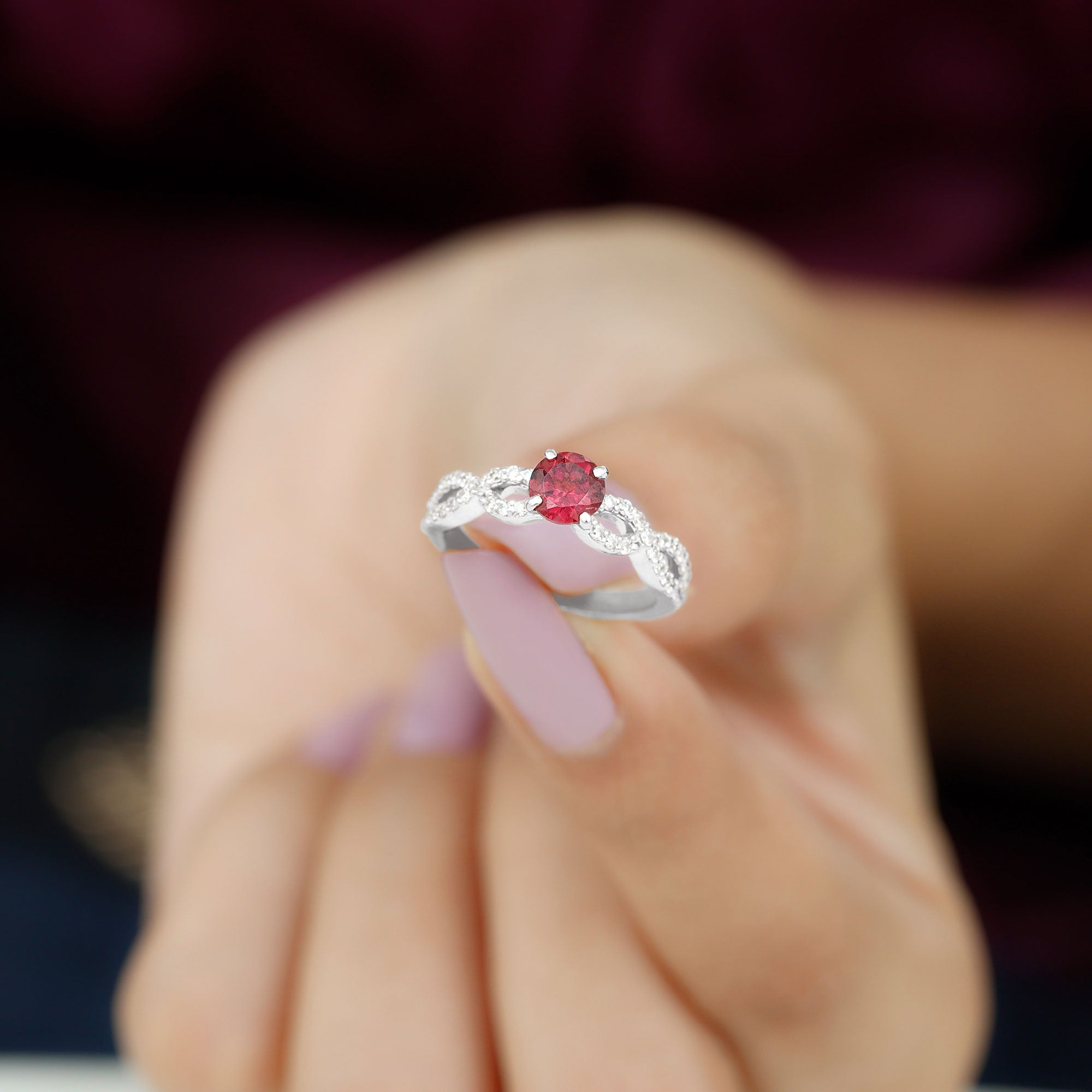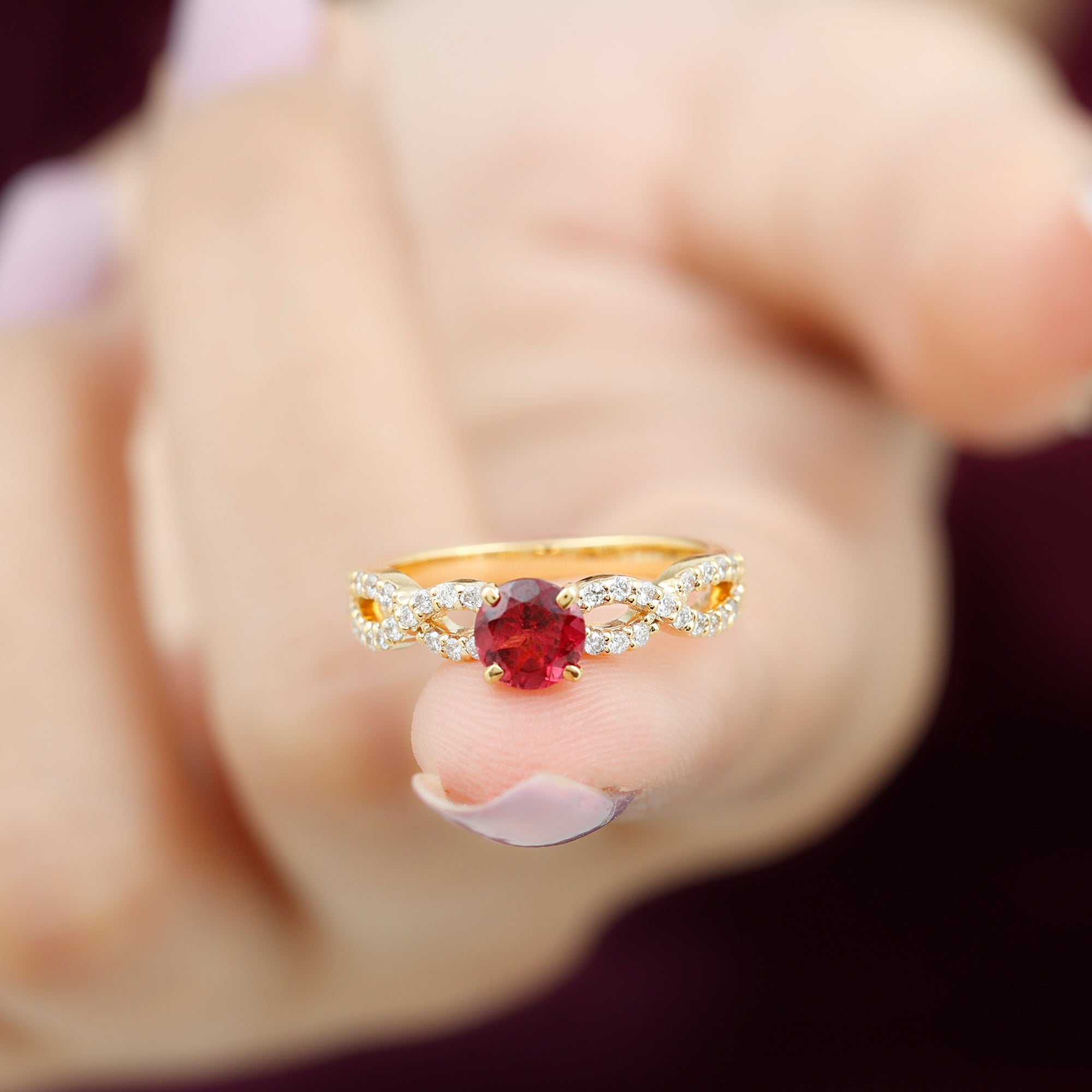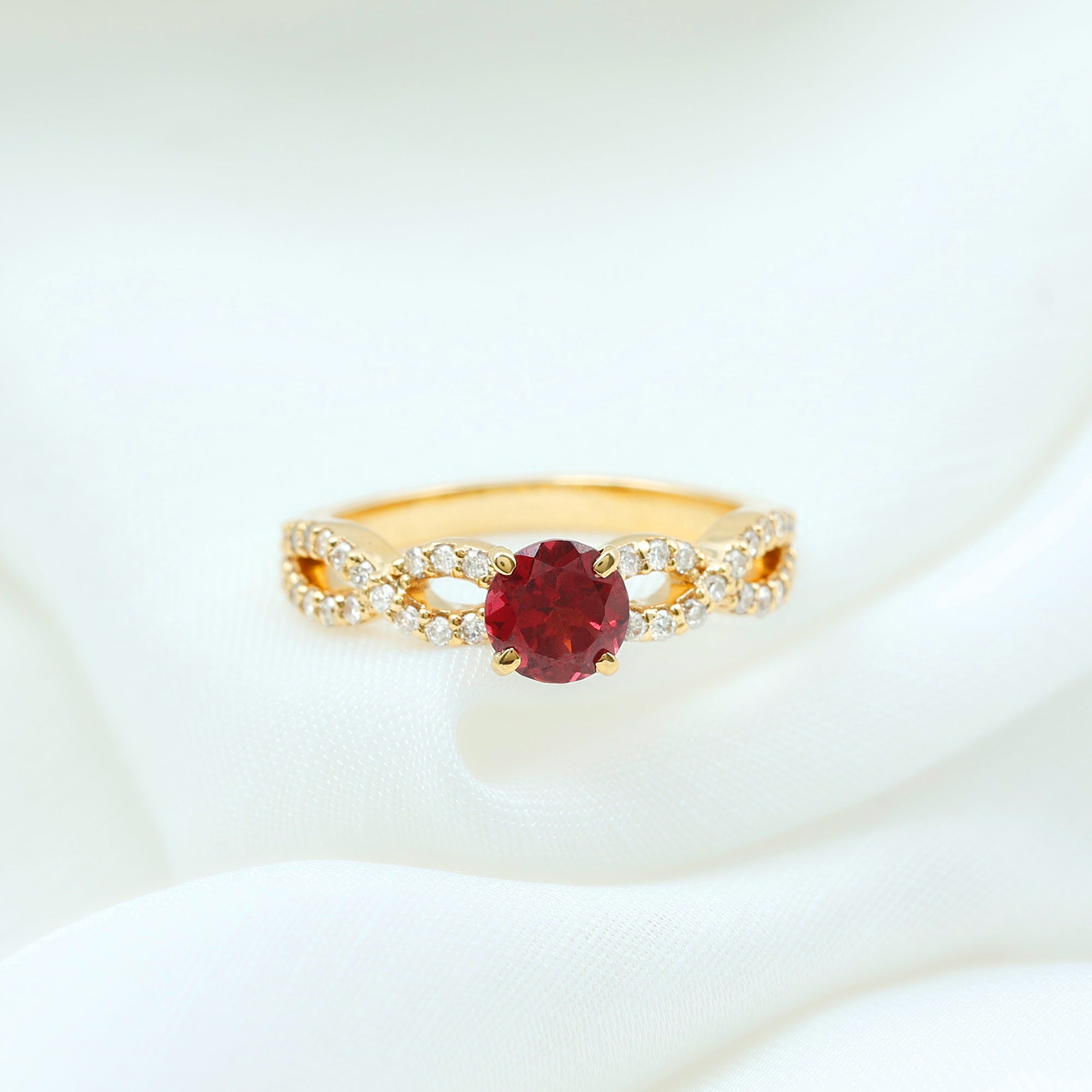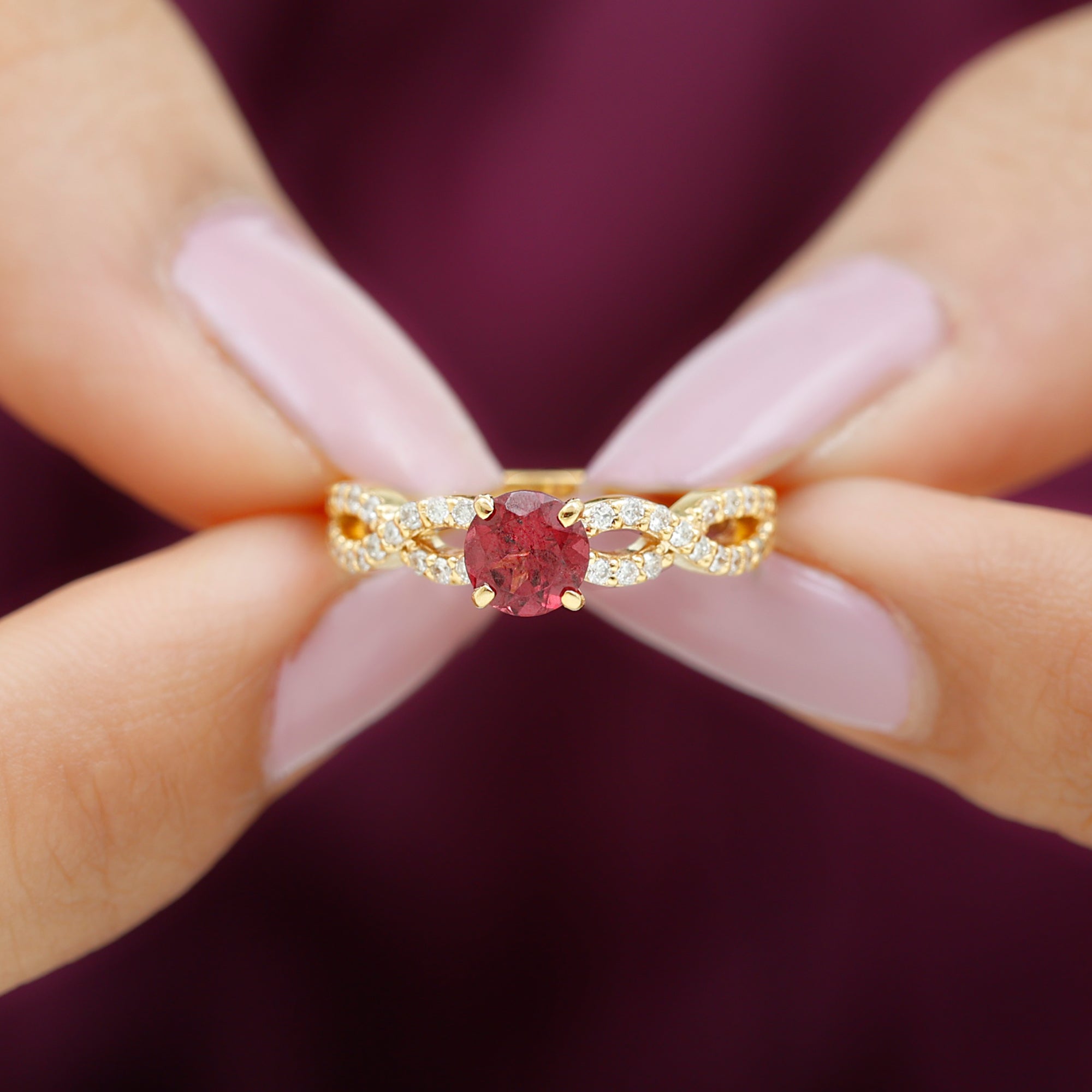 Express your love with this lovely Criss Cross Ring with Round Shape Rhodolite set as a solitaire adorn this Solid Gold with Diamond Side Stones in Crossover Shank to make for a charming present for your beloved on Valentines day.