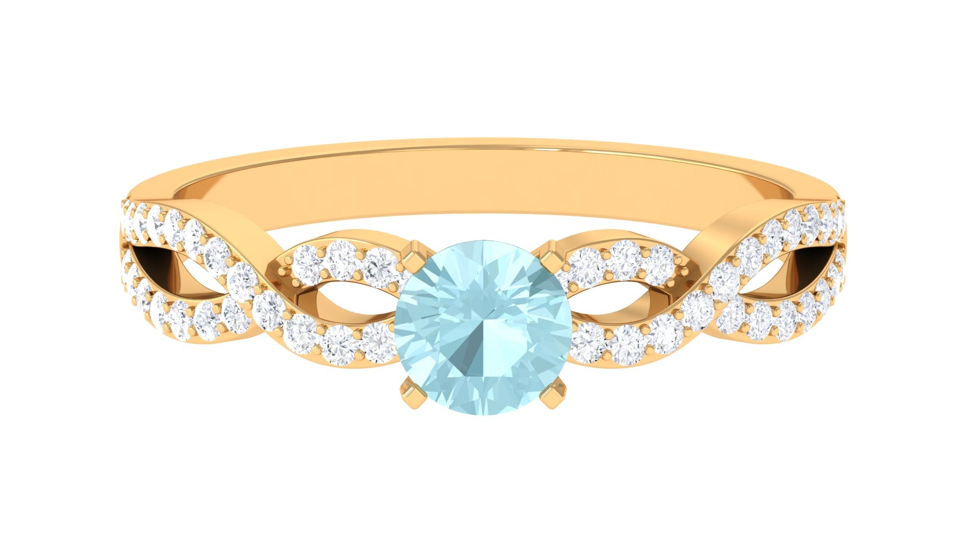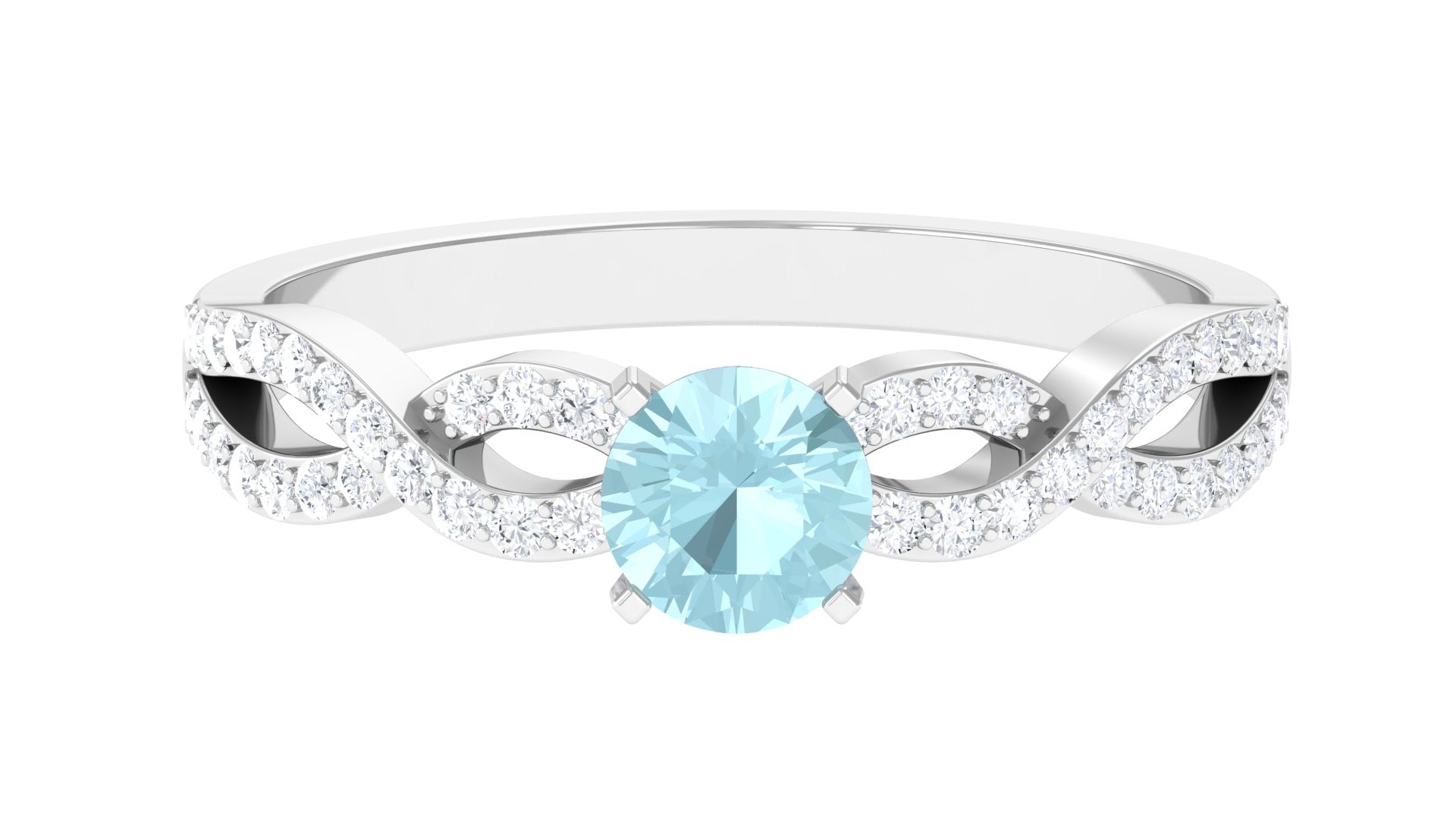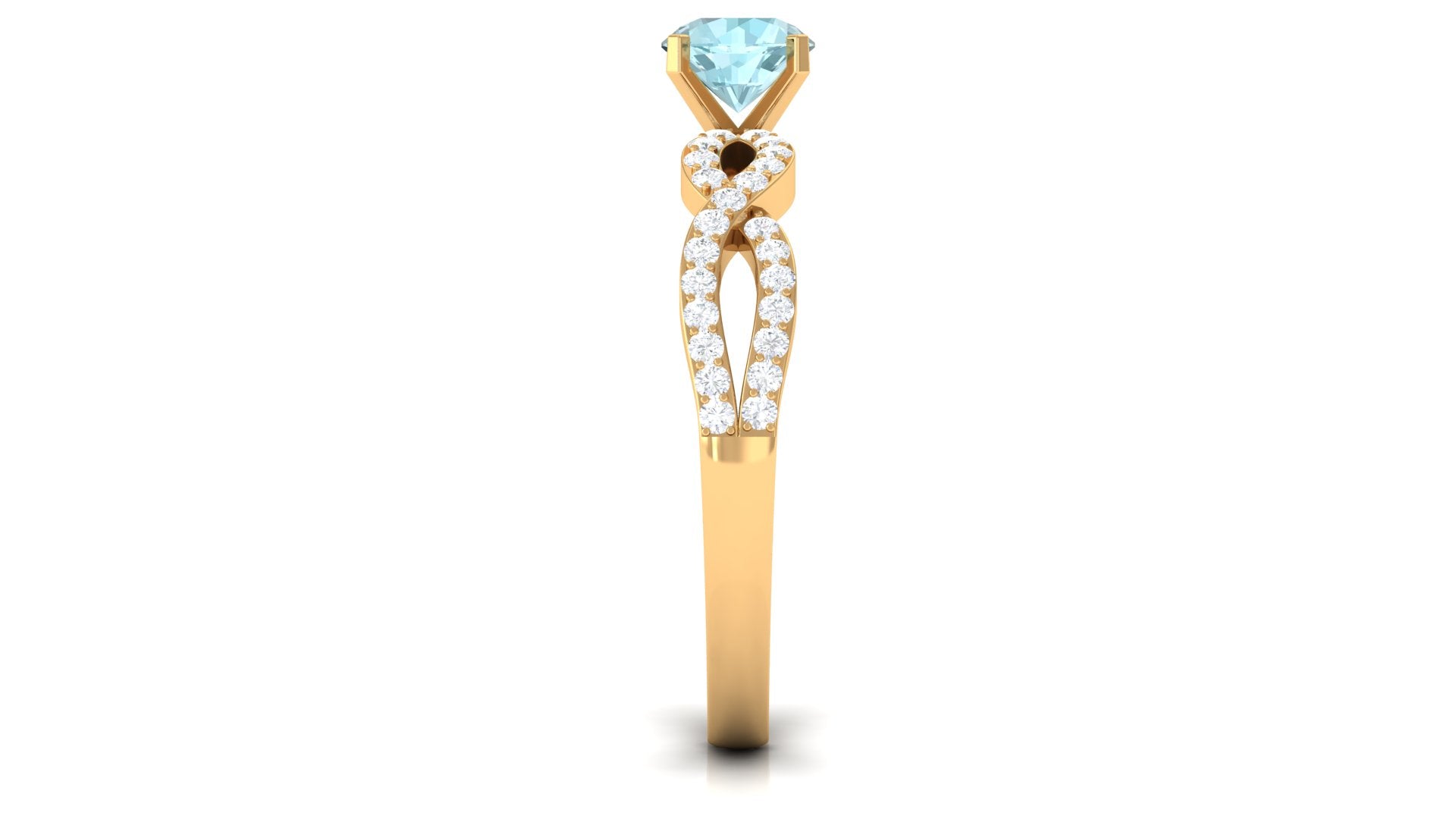 Express your love with this lovely Criss Cross Ring with Round Shape Sky Blue Topaz set as a solitaire adorn this Solid Gold with Diamond Side Stones in Crossover Shank to make for a charming present for your beloved on Valentines day.