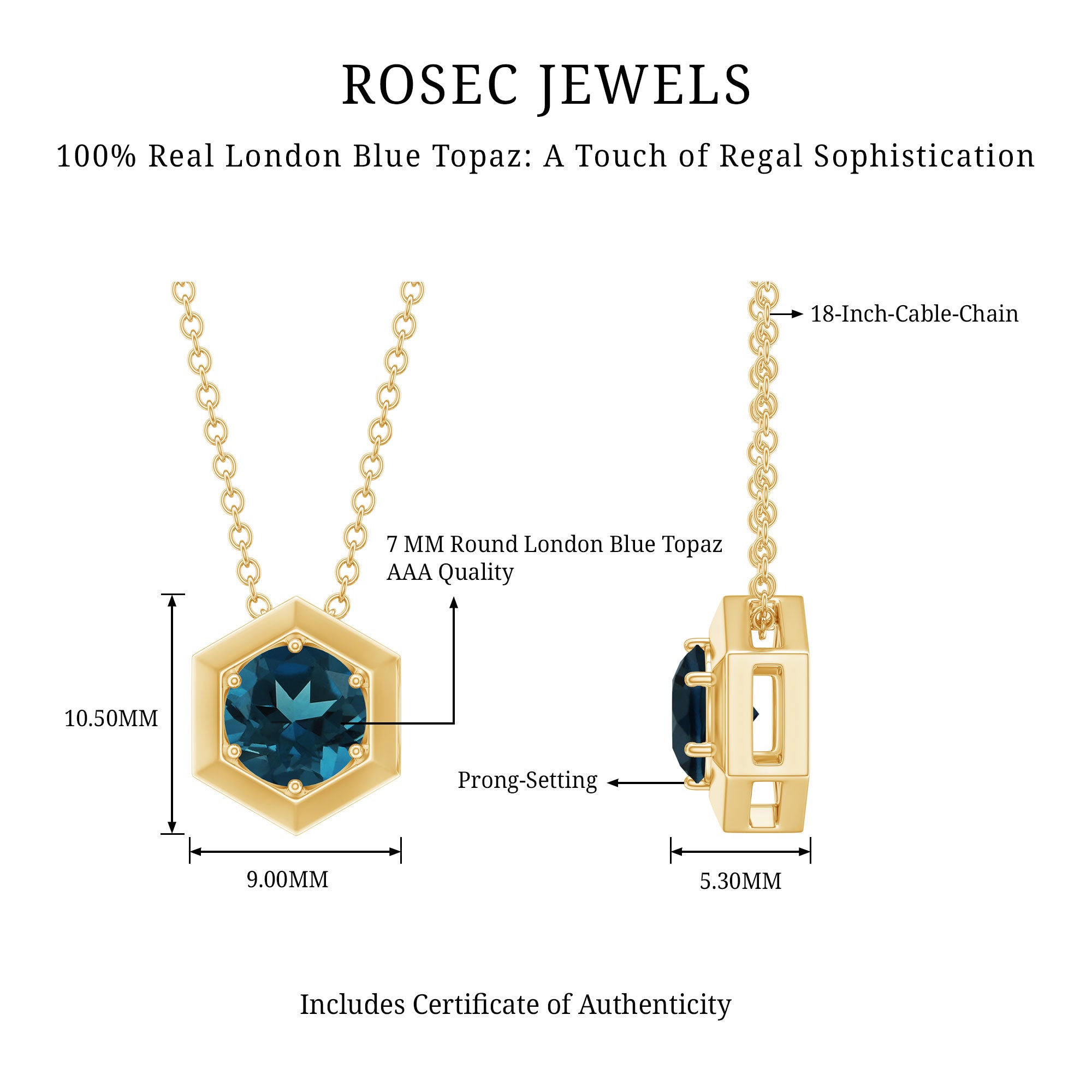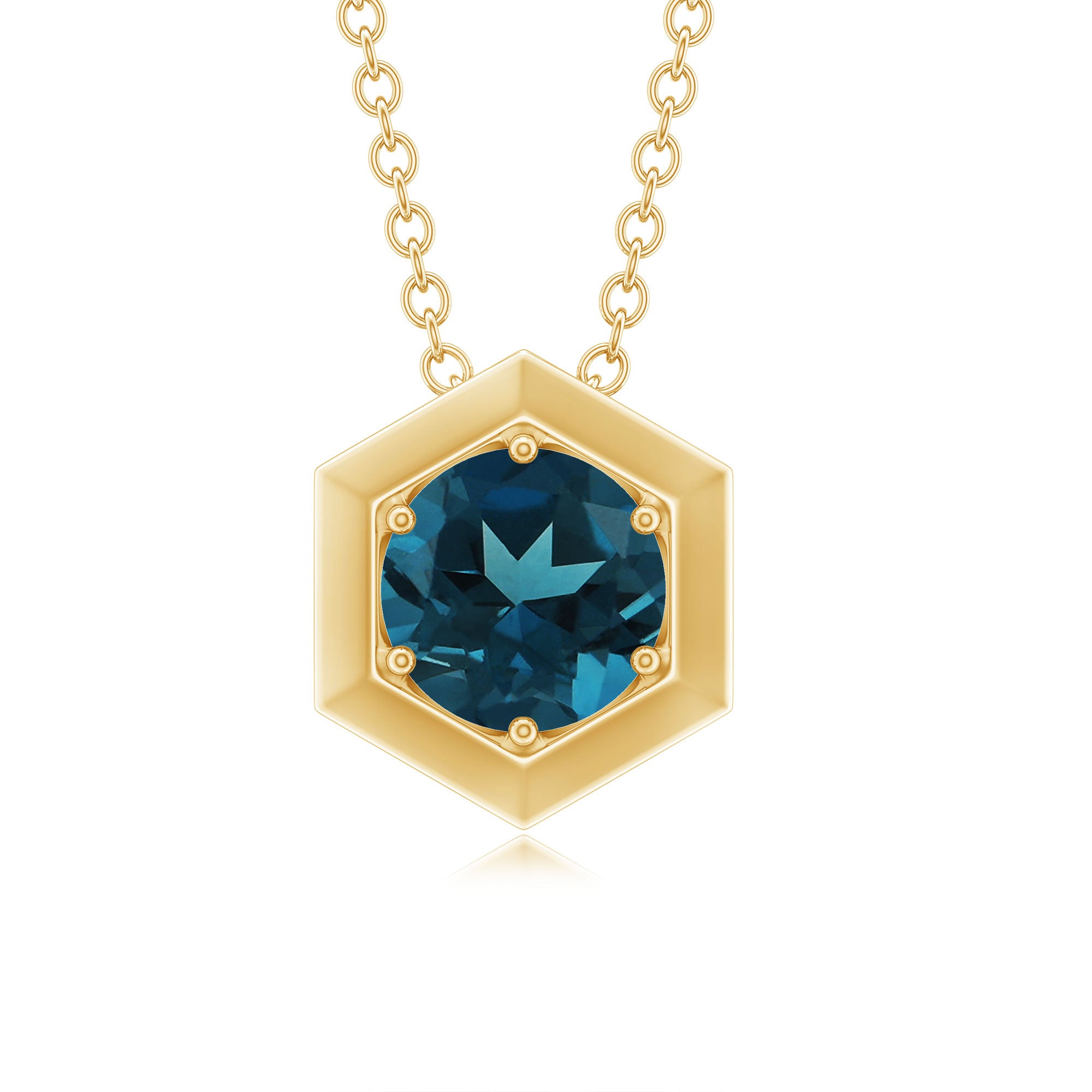 Beautiful and affordable, the Hexagon Necklace features Round Cut London Blue Topaz set in Prong Setting and adorned in 14K gold.