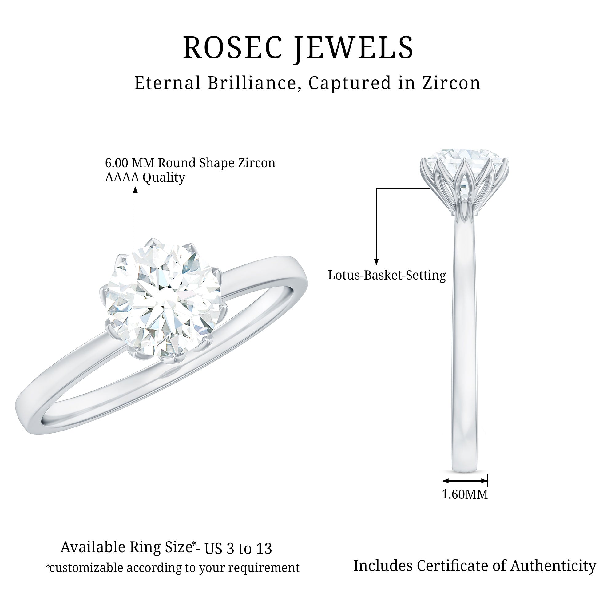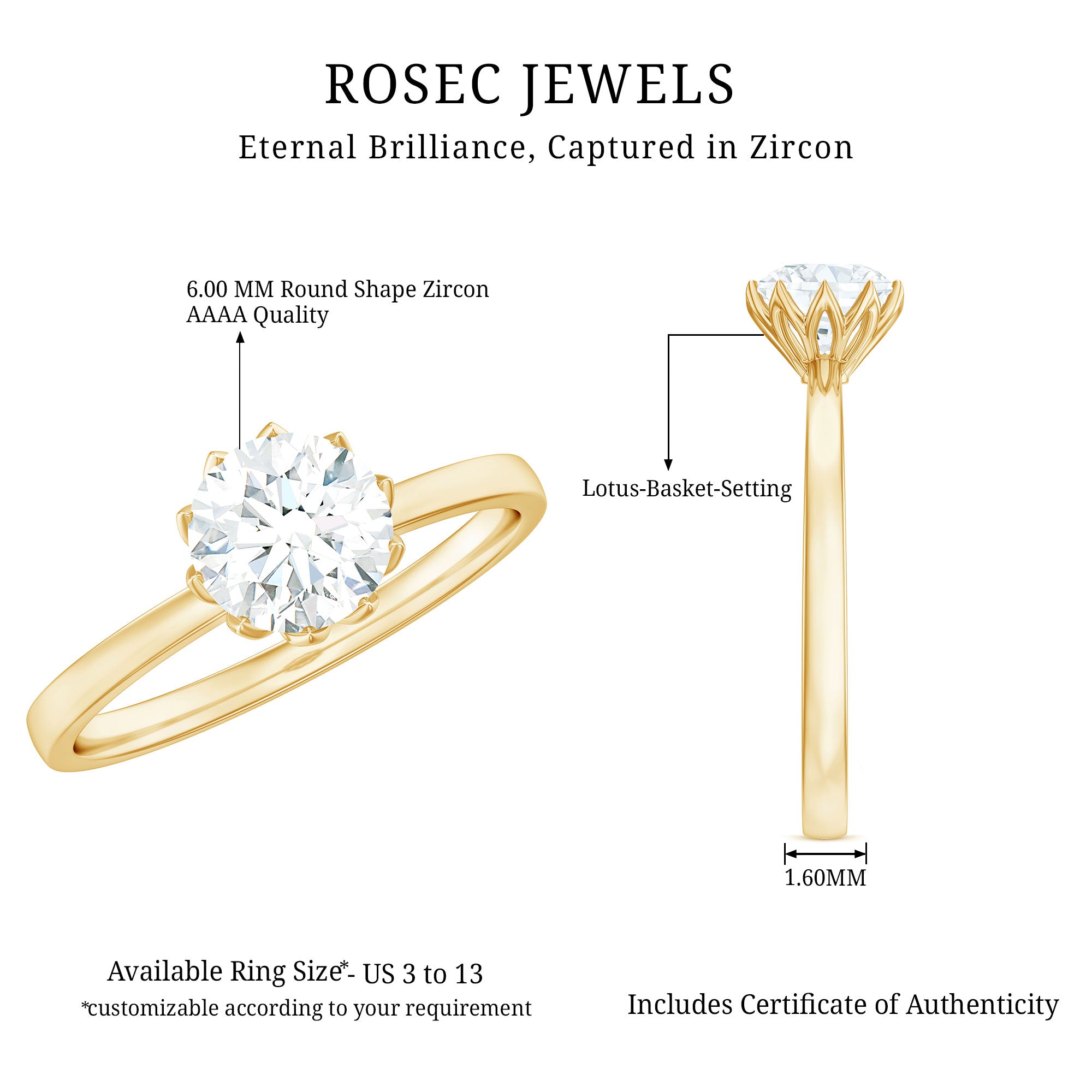This elegant solitaire engagement ring showcases a round shape zircon in a lotus basket setting, which creates a graceful and feminine look. The simulated diamond has excellent clarity and a stunning brilliance that sparkles in any light. With its classic yet unique design, this ring is a perfect choice for someone who wants a timeless and sophisticated engagement ring that exudes beauty and elegance.
