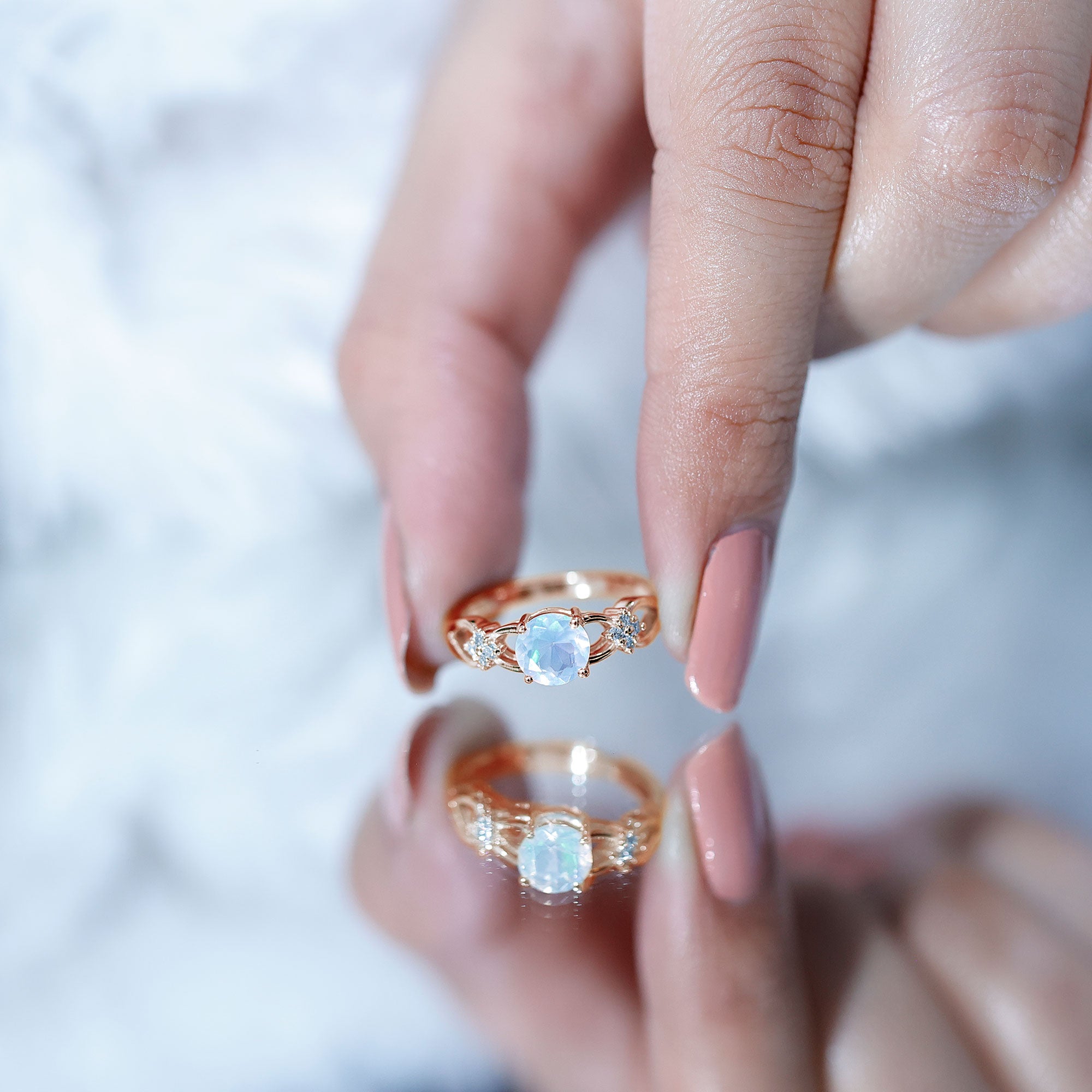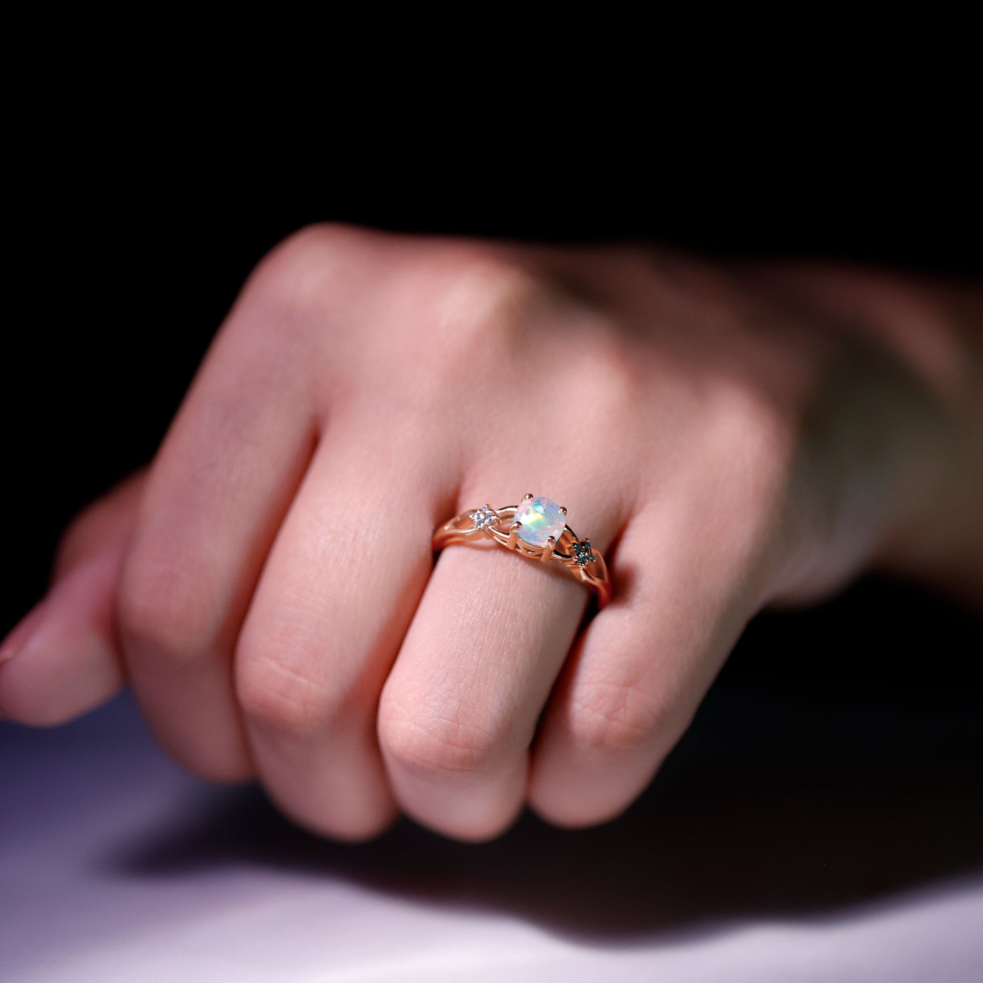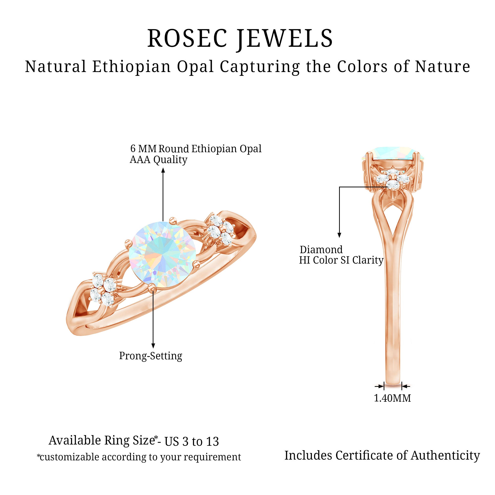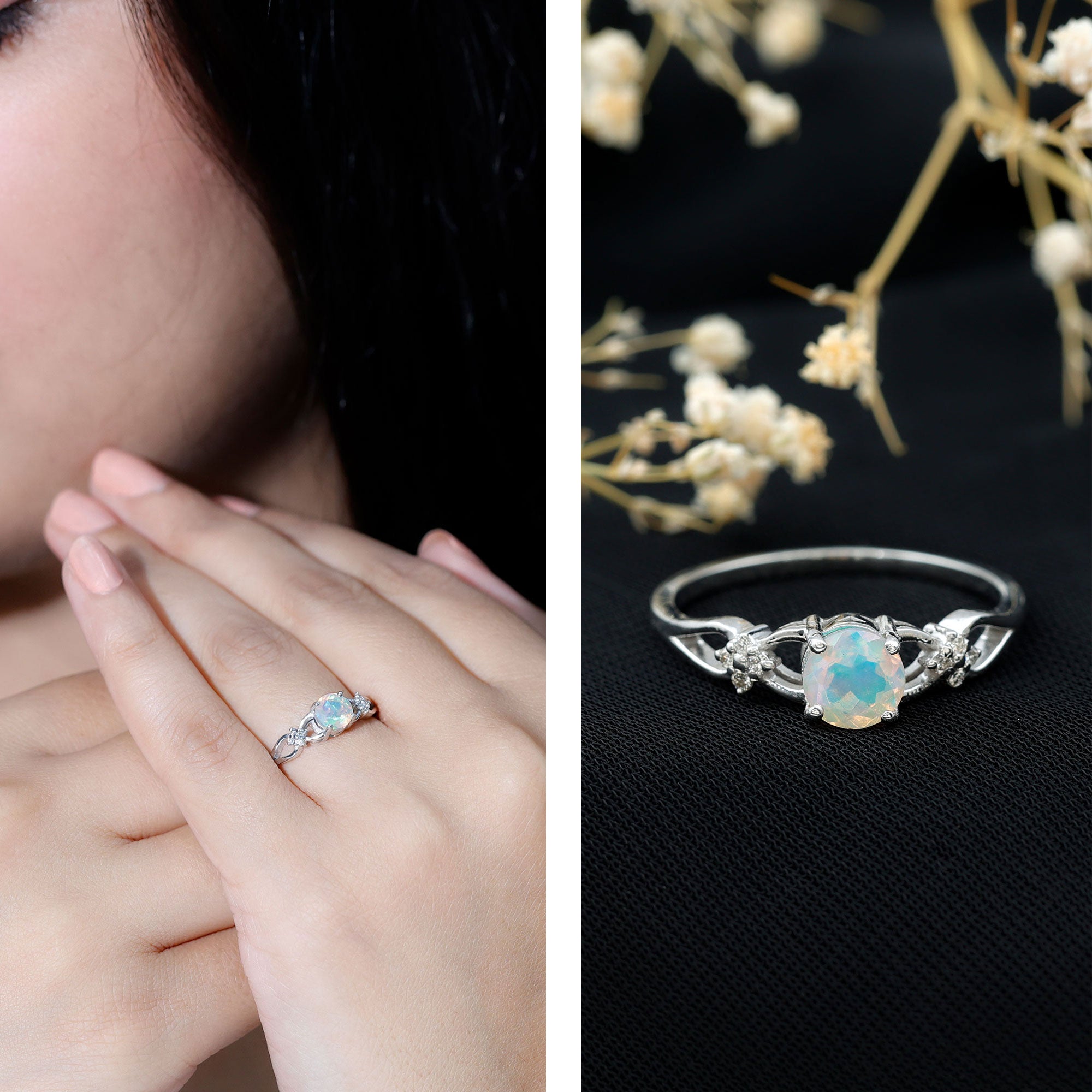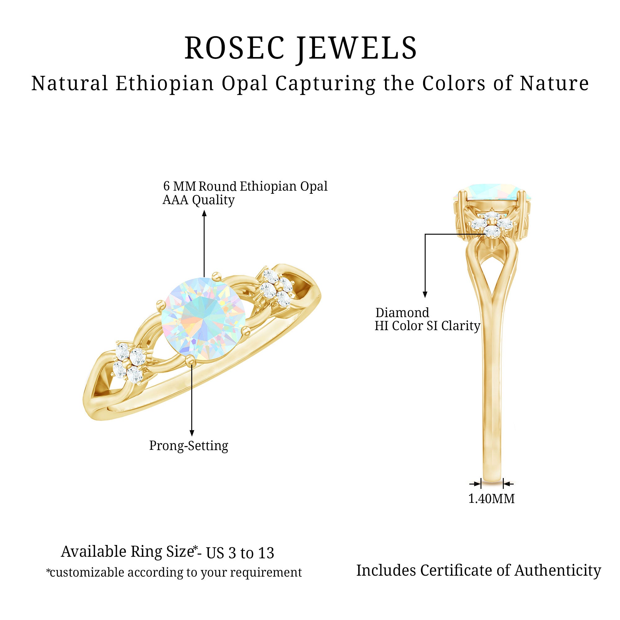 Unveil a love as enchanting as nature itself with this Ethiopian Opal Engagement Ring, a design where elegance blooms in every detail. At the center is a captivating 6 mm Round Shape Ethiopian Opal set in 4 Prong Setting. The unique Crossover Band wraps gracefully around the finger, creating a flowing design that speaks of connection and unity. On each side, delicate Diamond stones frame a flower pattern that blossoms like tiny love stories, sparkling reminders of growth, beauty and the blooming journey you are about to begin. This Opal Diamond Engagement Ring is a poetic expression of a love that is ever-evolving and full of wonder. Designed for the free spirit with a romantic heart, this Crossover Ring merges natural charm with timeless sophistication. Available in a range of ring sizes to ensure the perfect fit and thoughtfully packaged in an elegant jewelry box, this Nature Inspired Engagement Ring is proposal-ready and destined to be treasured. This Opalescent Ring is a breathtaking symbol of your forever beginning.