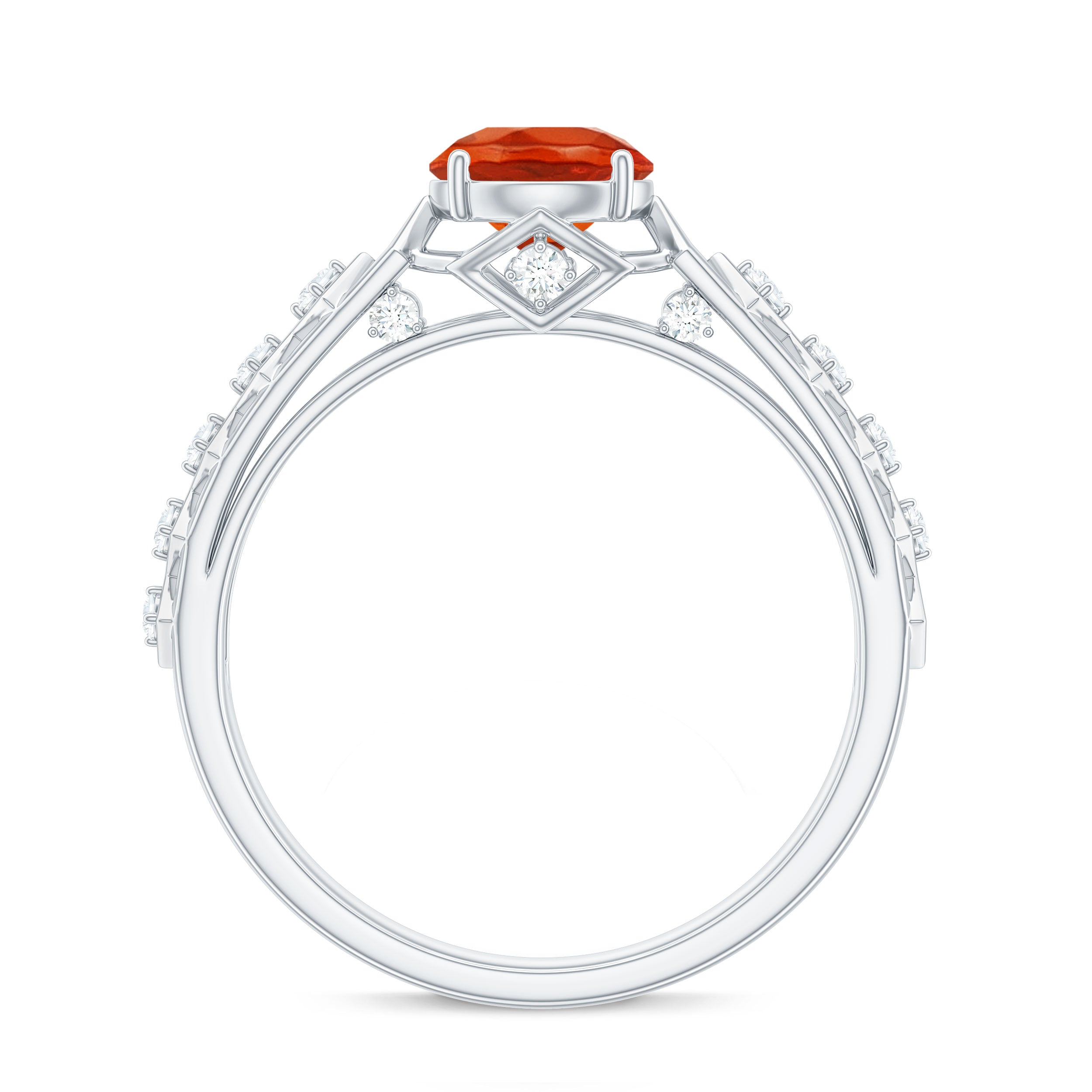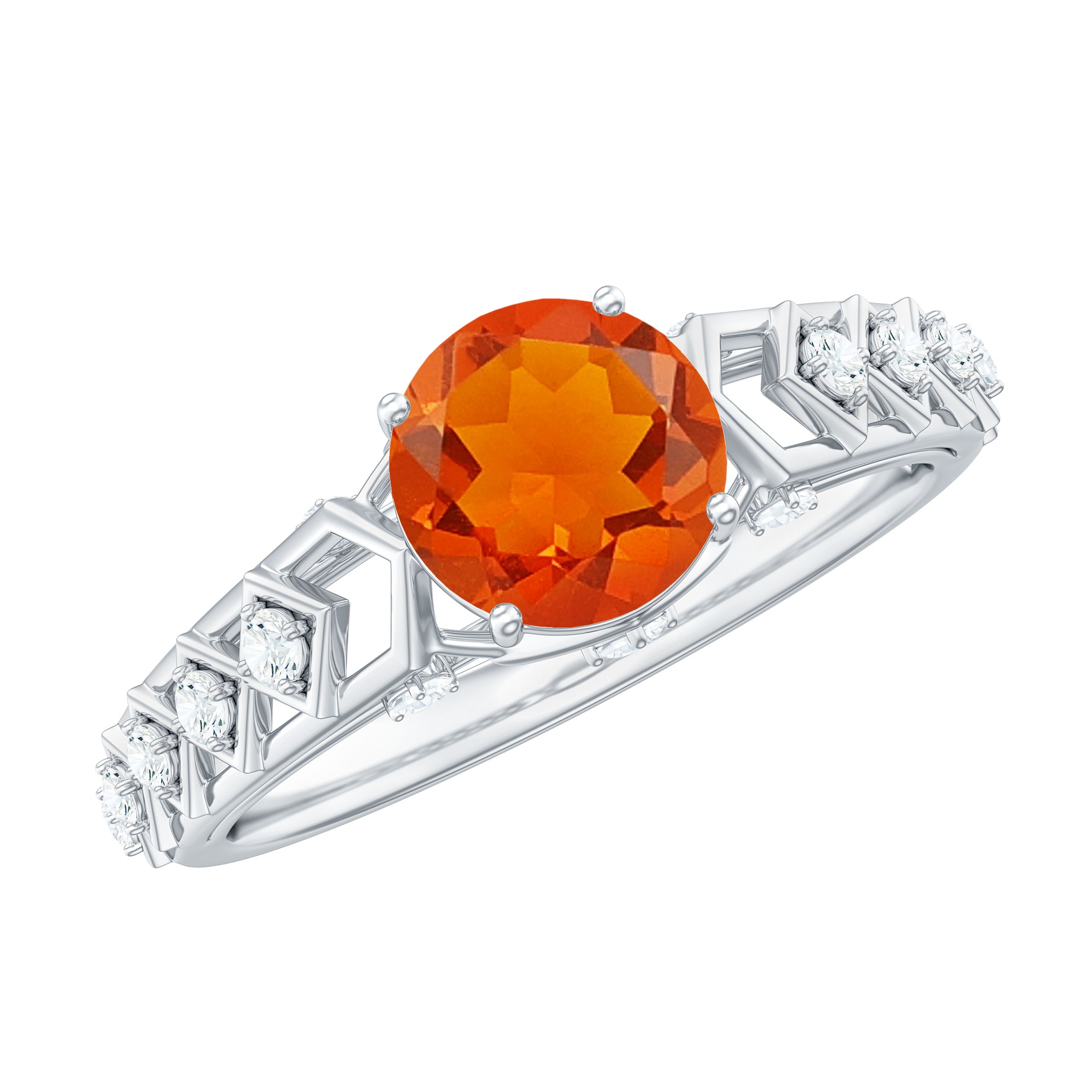 Sparkle with this stunning Fire Opal Ring. Featuring a Round Shape Fire Opal in a prong setting, shank is decorated by golden cutwork and Diamond accents, it is crafted in gold to create a luxurious and elegant look. Perfect for adding a touch of sophistication to any outfit.