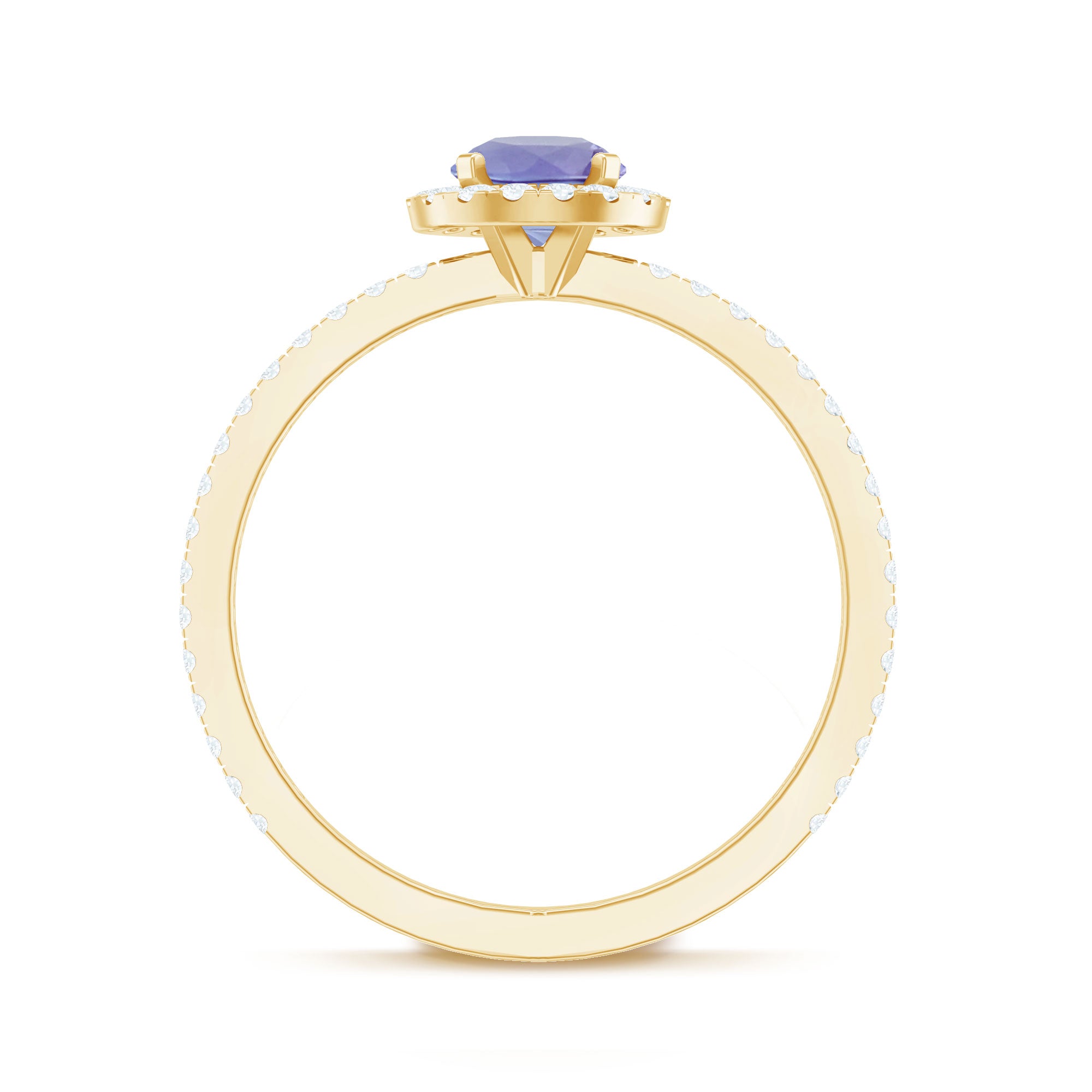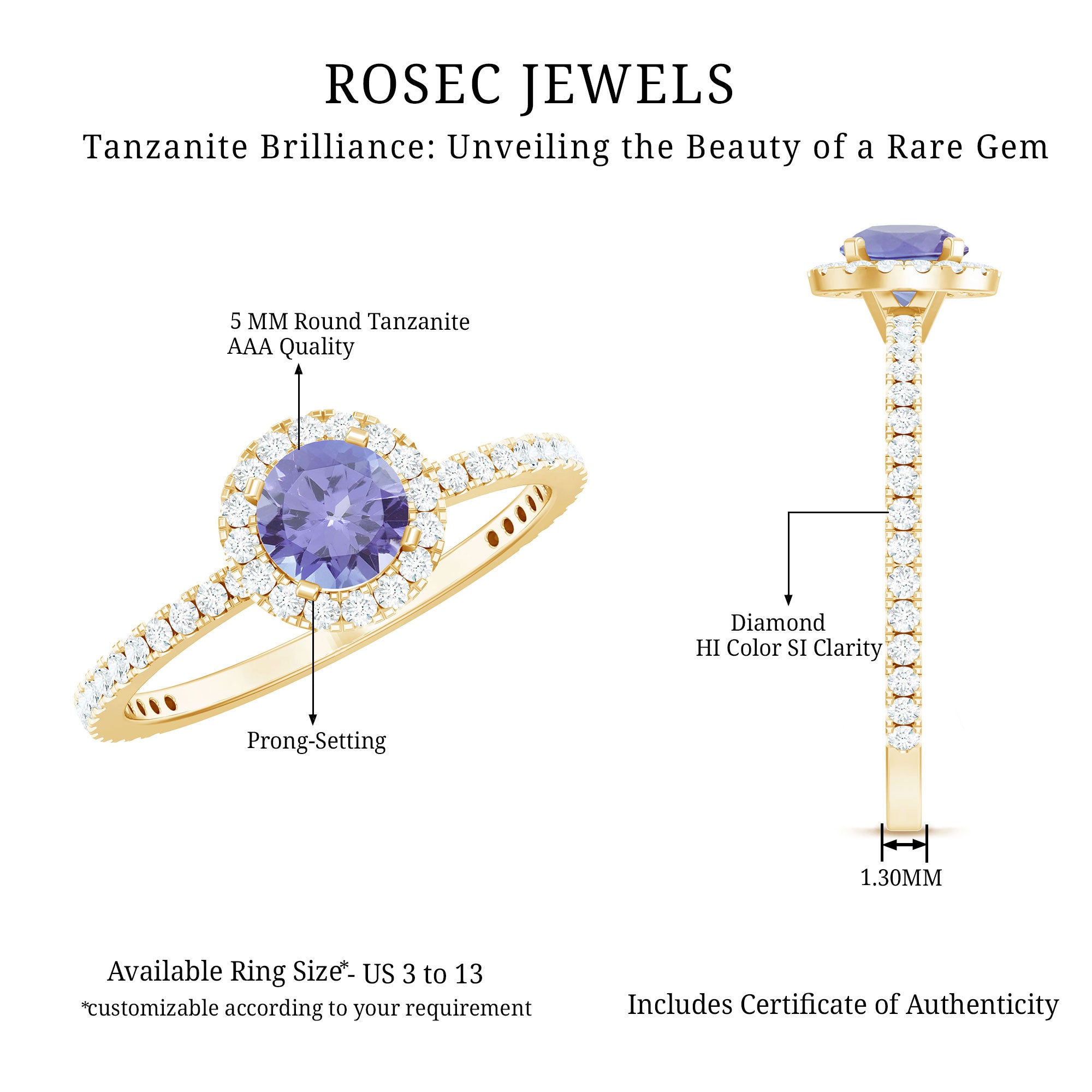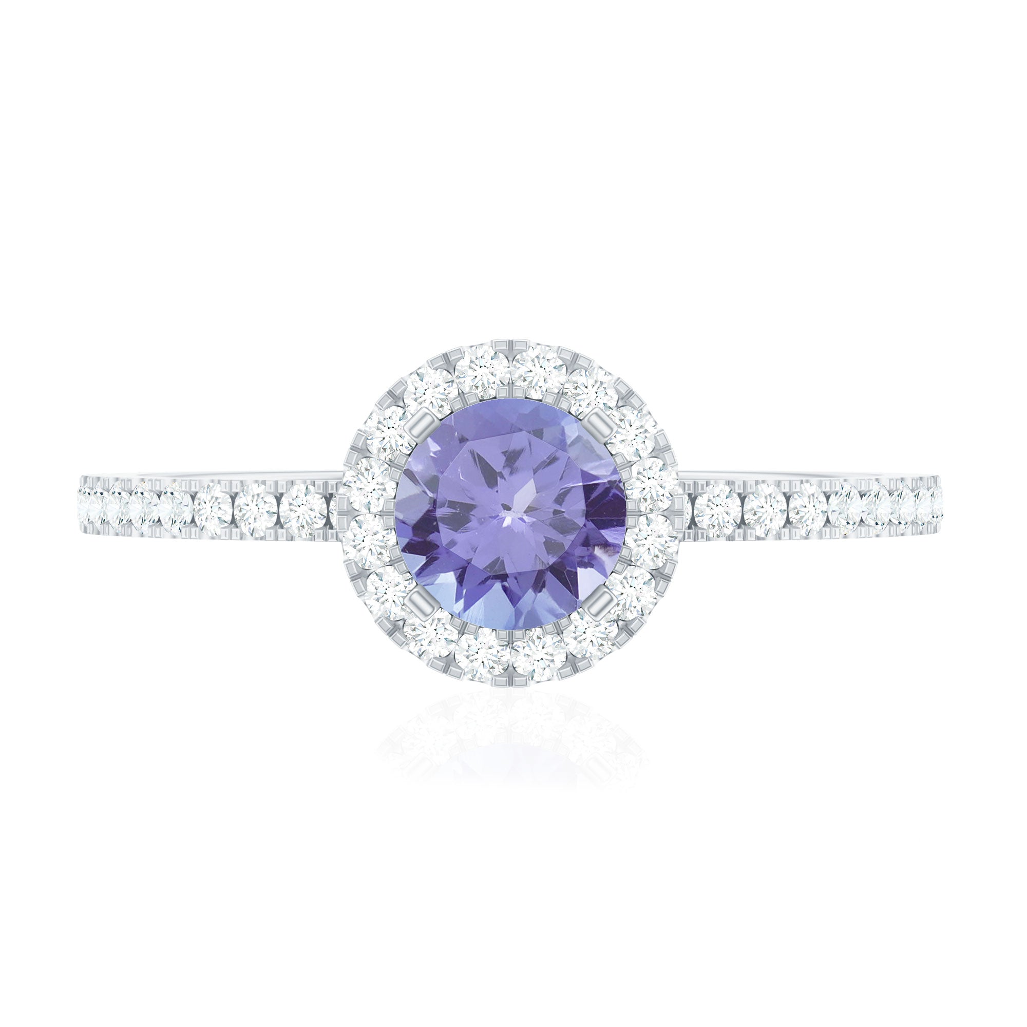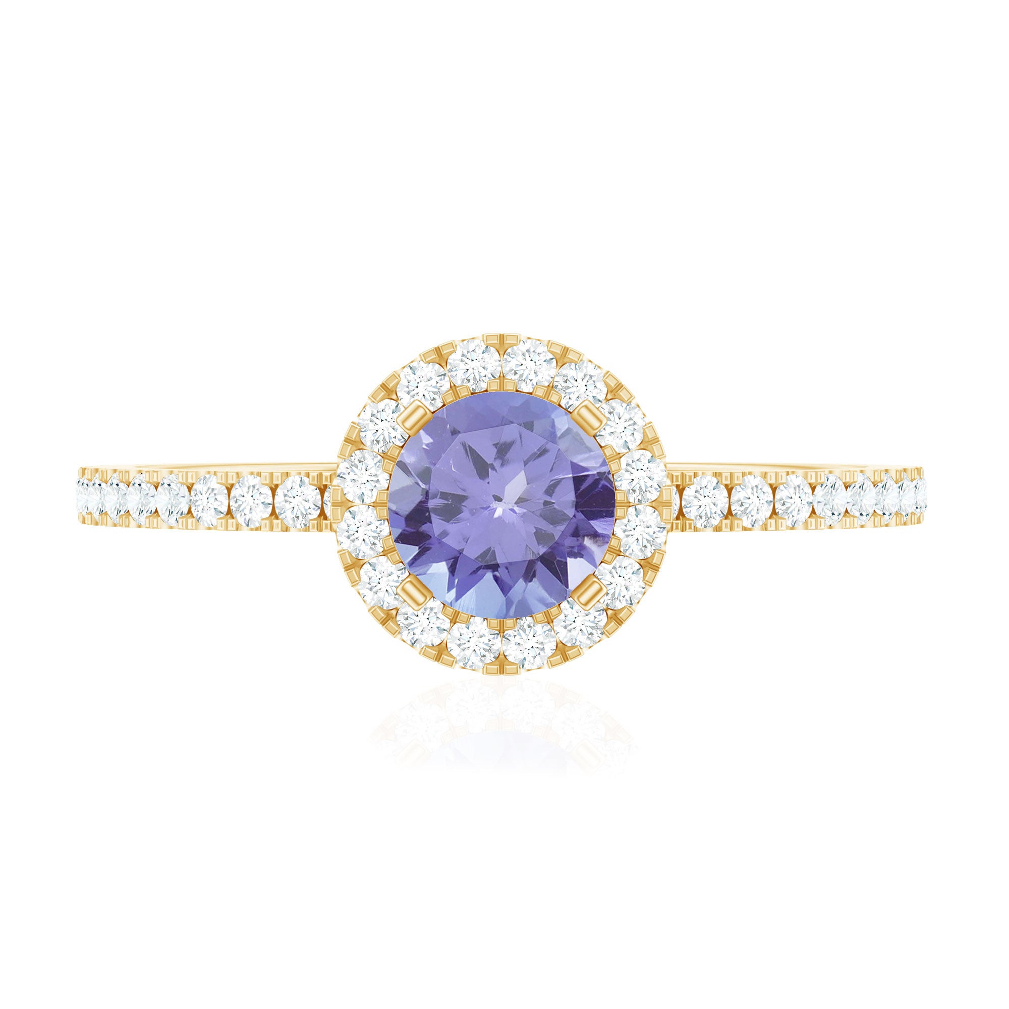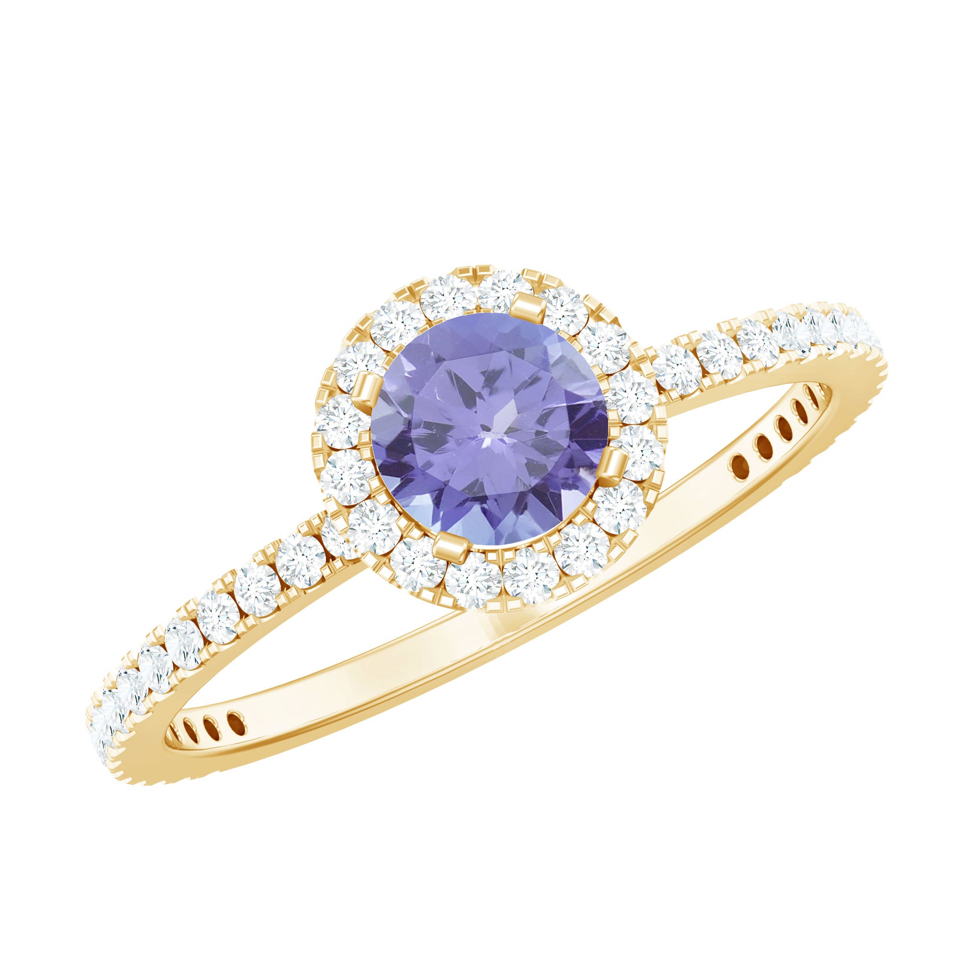 Style this Solitaire Ring with precious simplicity. This Engagement Ring is adorned with Round Shape Tanzanite Gemstone set in a Prong Setting with Diamond Halo and beautifully crafted in Solid Gold Metal