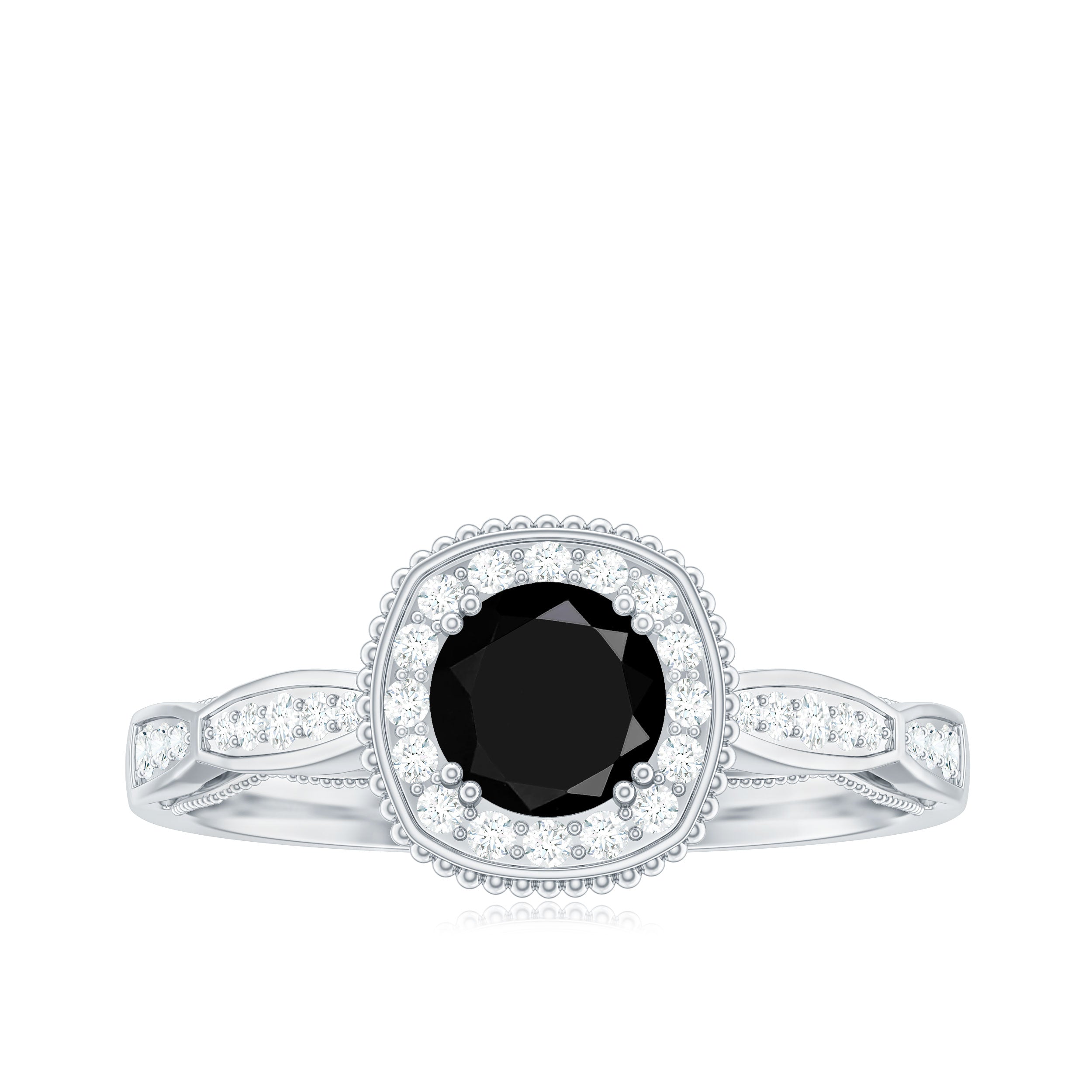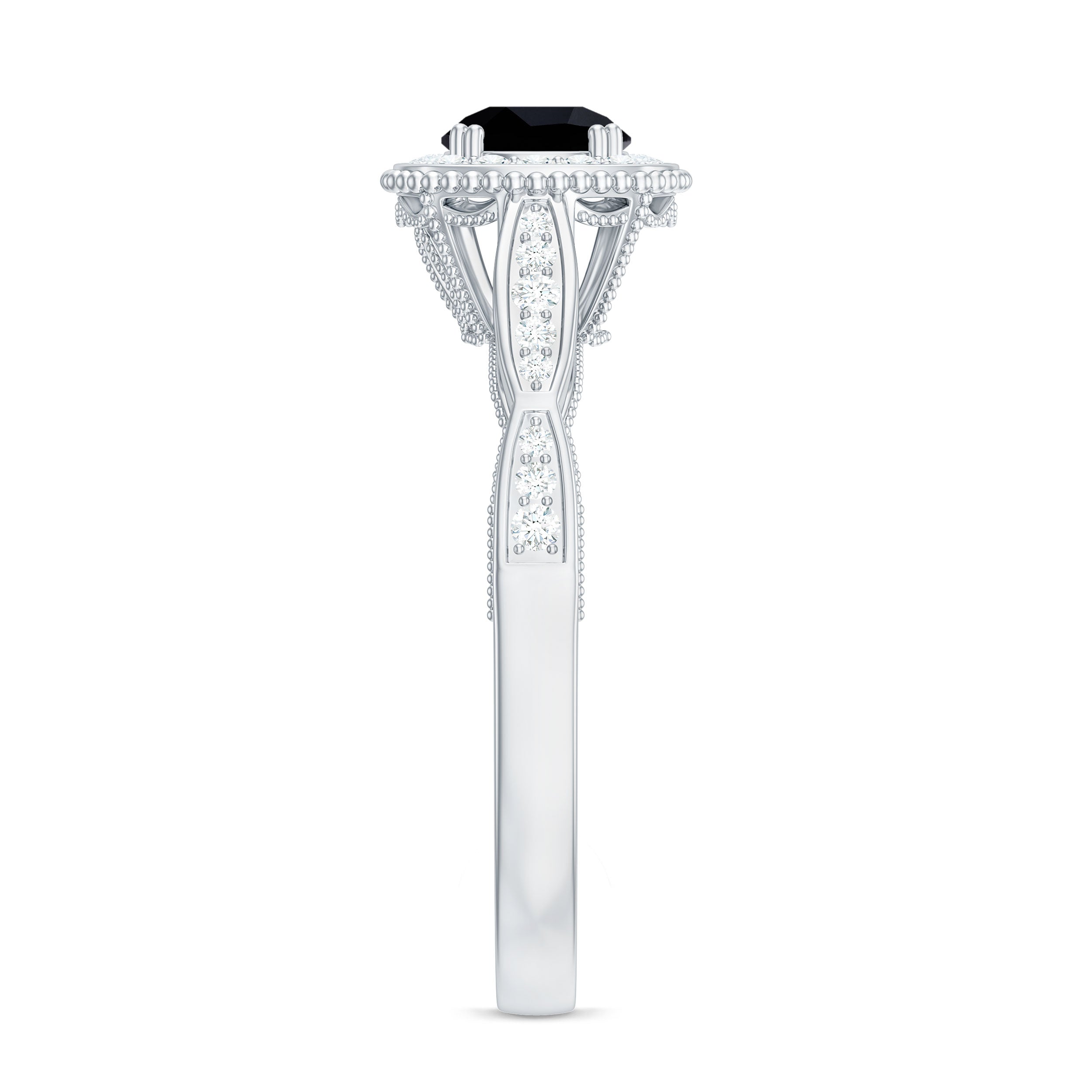 The littering Halo Engagement Ring features delicate Surface Prong Set Diamond Halo that encircle the center Round Shape Black Diamond with a designer shank, and adorn the band with Milgrain Detail. The Antique Design makes this ring light and feminine for a truly special look. Adorn yourself with our perfect black diamond and Diamond Engagement Ring on your big day.