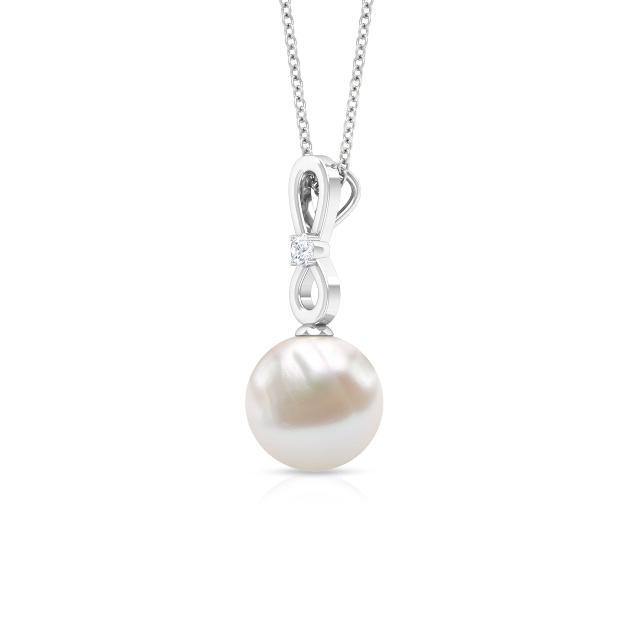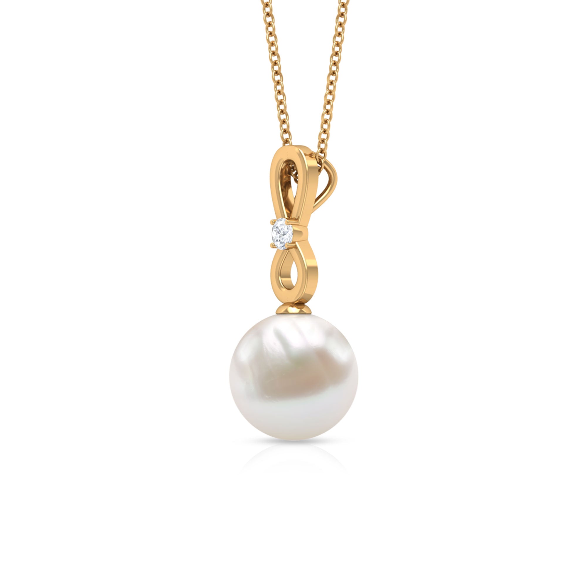 The Solitaire Pendant is fitted with 10 MM Round Shape Freshwater Pearl in Bead Setting with Round Diamond uniquely arranged in Prong Setting on Solid Gold crafted Infinity Symbol. The Infinity Pendant Necklace is a perfect piece for your lovely spouse.