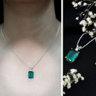 This Lab Grown Emerald Pendant is the perfect complement to the look for the special day. The pendant is crafted with 14K White Gold Plated Silver and features a 10X14 MM Emerald Cut Synthetic Emerald securely placed in Prong Setting. This Solitaire Pendant beholds an adorable shine of AAAA Quality Synthetic Emerald that is topped with a smaller Moissanite, which amplifies the look of the pendant. This Emerald Cut Pendant is accentuated with a Rabbit Ear Bail and dangles in classic cable chain, which beautifully decorates the Neckline. The pendant will be delivered to you in a premium quality velvet pouch with a certificate of authenticity.