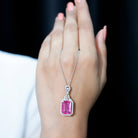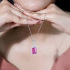 This Lab Grown Pink Sapphire Necklace is all about its breathtaking color and shine. Made from White Gold Plated Silver, this Emerald Cut Necklace represents love and eternal connections, making it a truly meaningful piece of jewelry for someone dear to you. This Pendant features a 10X14 MM Emerald cut Lab Grown Pink Sapphire securely held in Prong Setting, encircled by a halo and a cluster of round brilliant cut Moissanite gemstones. It serves as a classic and striking accessory, embodying elegance with its remarkable brilliance and vibrant color that sparkles with every flicker of light. Hanging from a simple yet durable chain, this Wedding Necklace for Bride is both versatile and stunning, resting beautifully on your neckline. For brides in search of something romantic, feminine, and uniquely elegant, this Bridal Necklace is the perfect choice for those who appreciate the geometric and art deco style pendant.