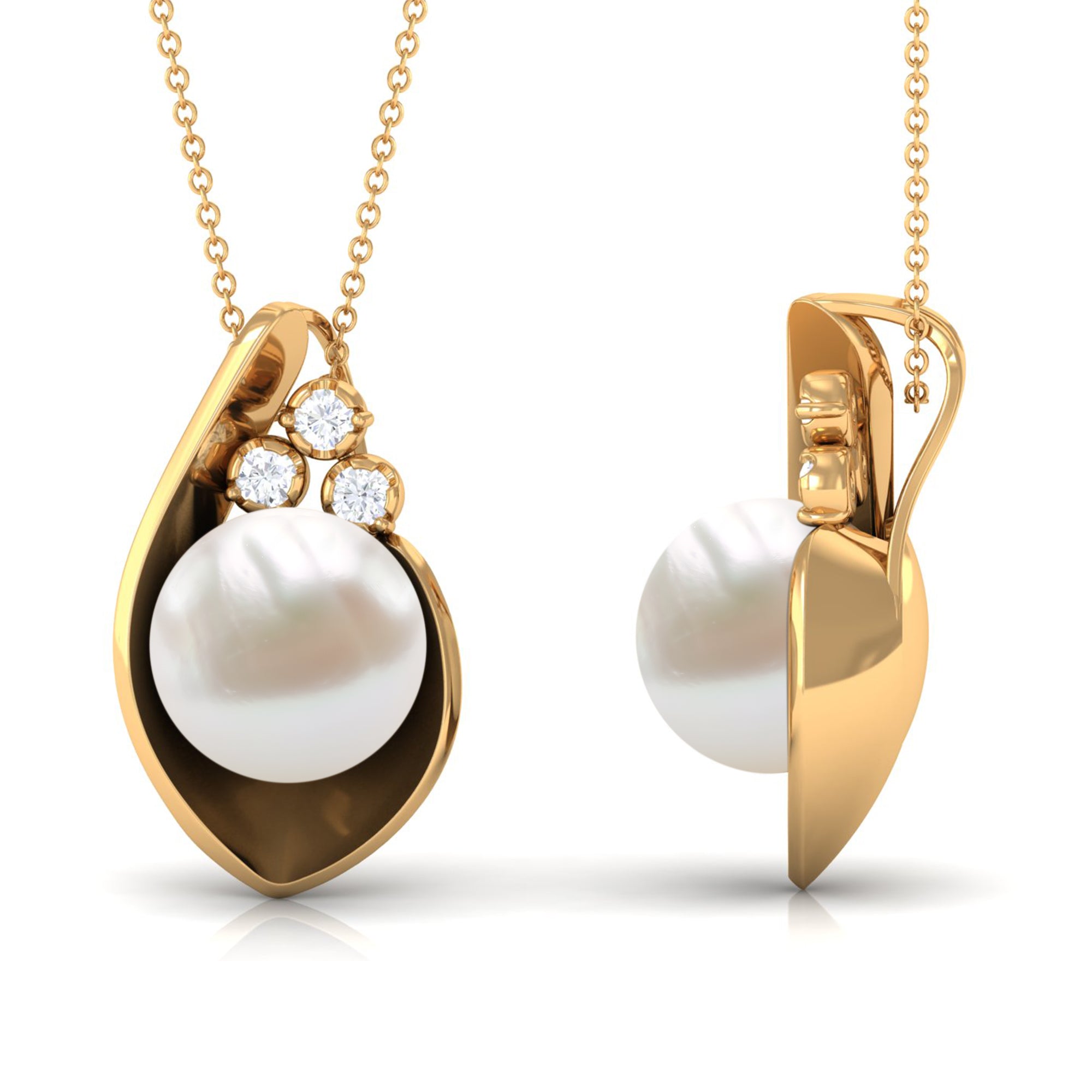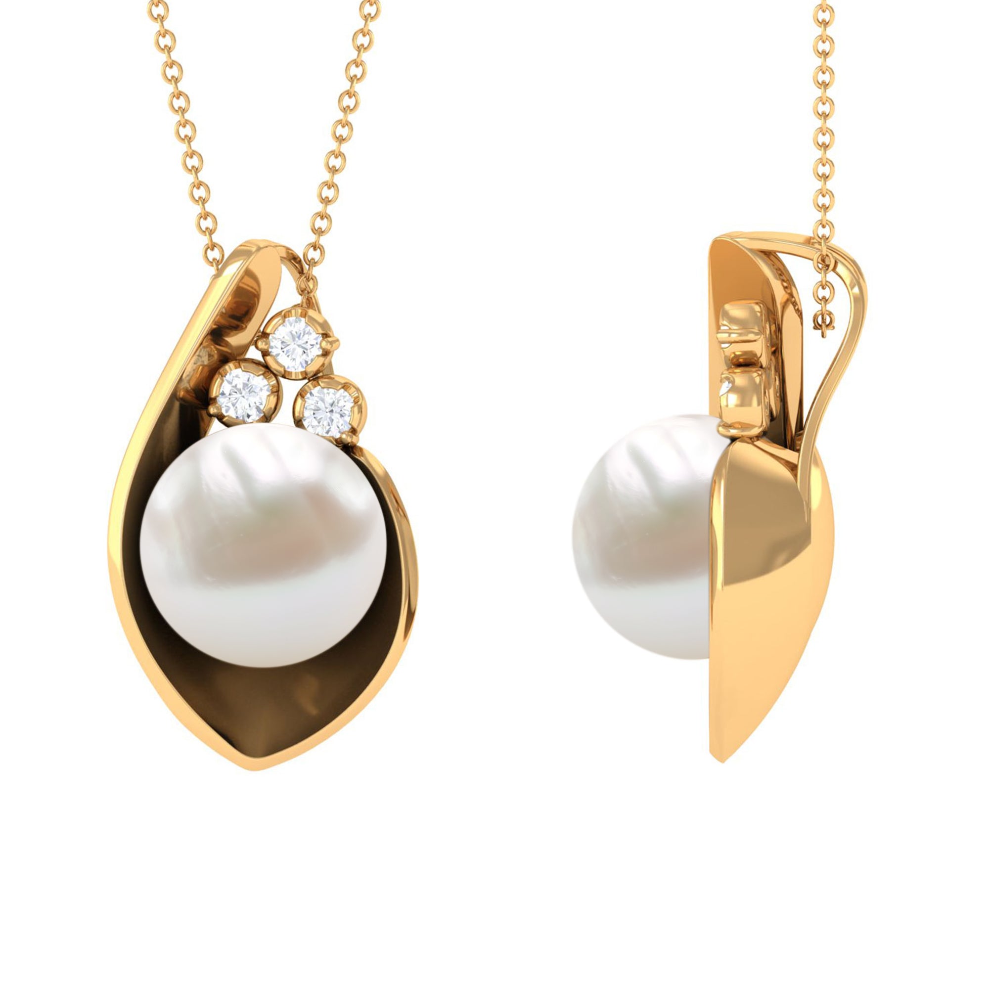 Experience the timeless elegance of pearls and the brilliance of Diamond with this stunning Pearl Pendant Necklace. It features a 12 MM freshwater pearl along with the sparkling Diamond trio on top. The freshwater pearl is half covered in a shell making it a more eye-catching necklace that is sure to get attention. This Pearl Diamond Necklace is perfect for women who appreciate beauty with uniqueness.