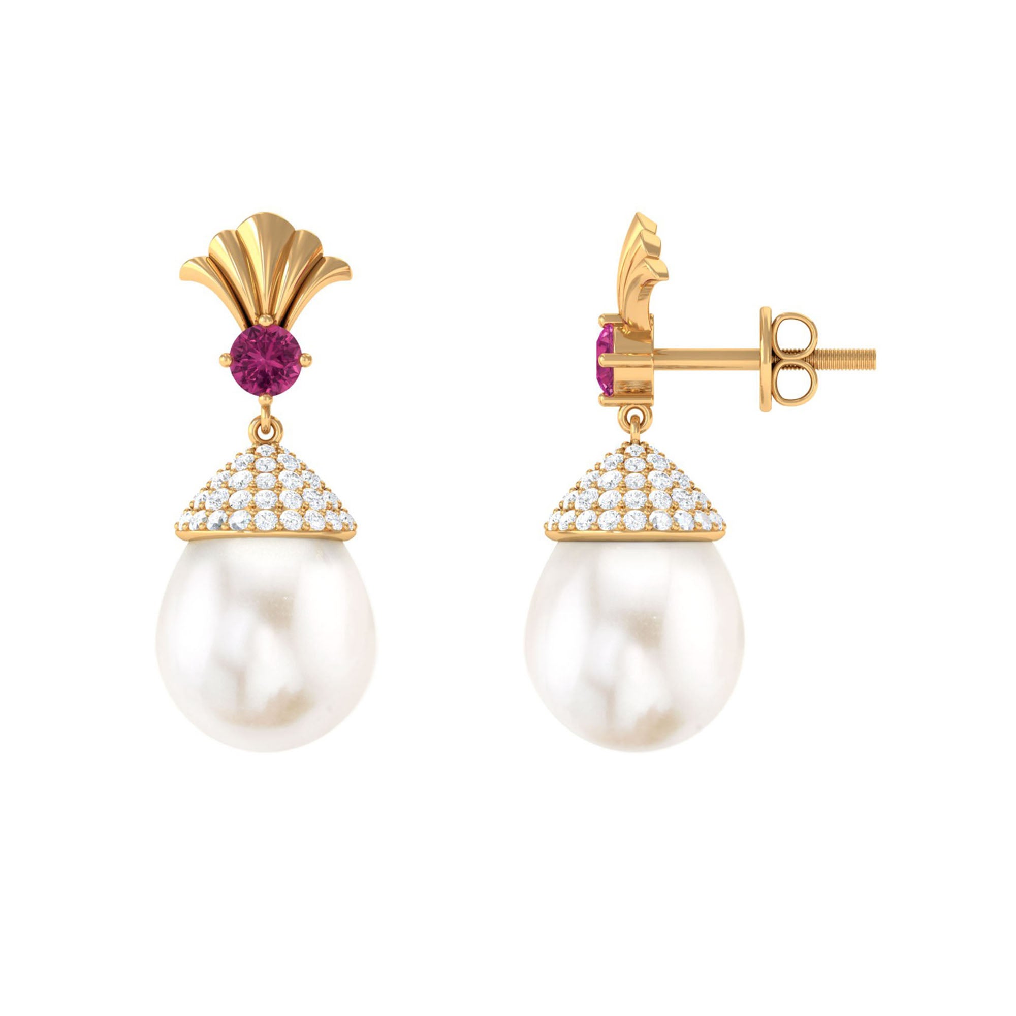 13 CT Freshwater Pearl Drop Earrings with Moissanite and Pink Tourmaline