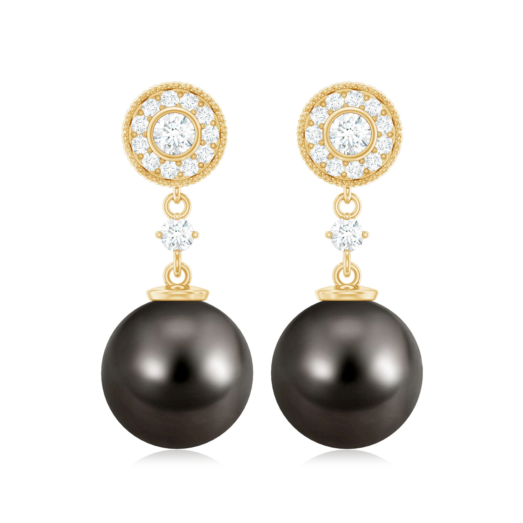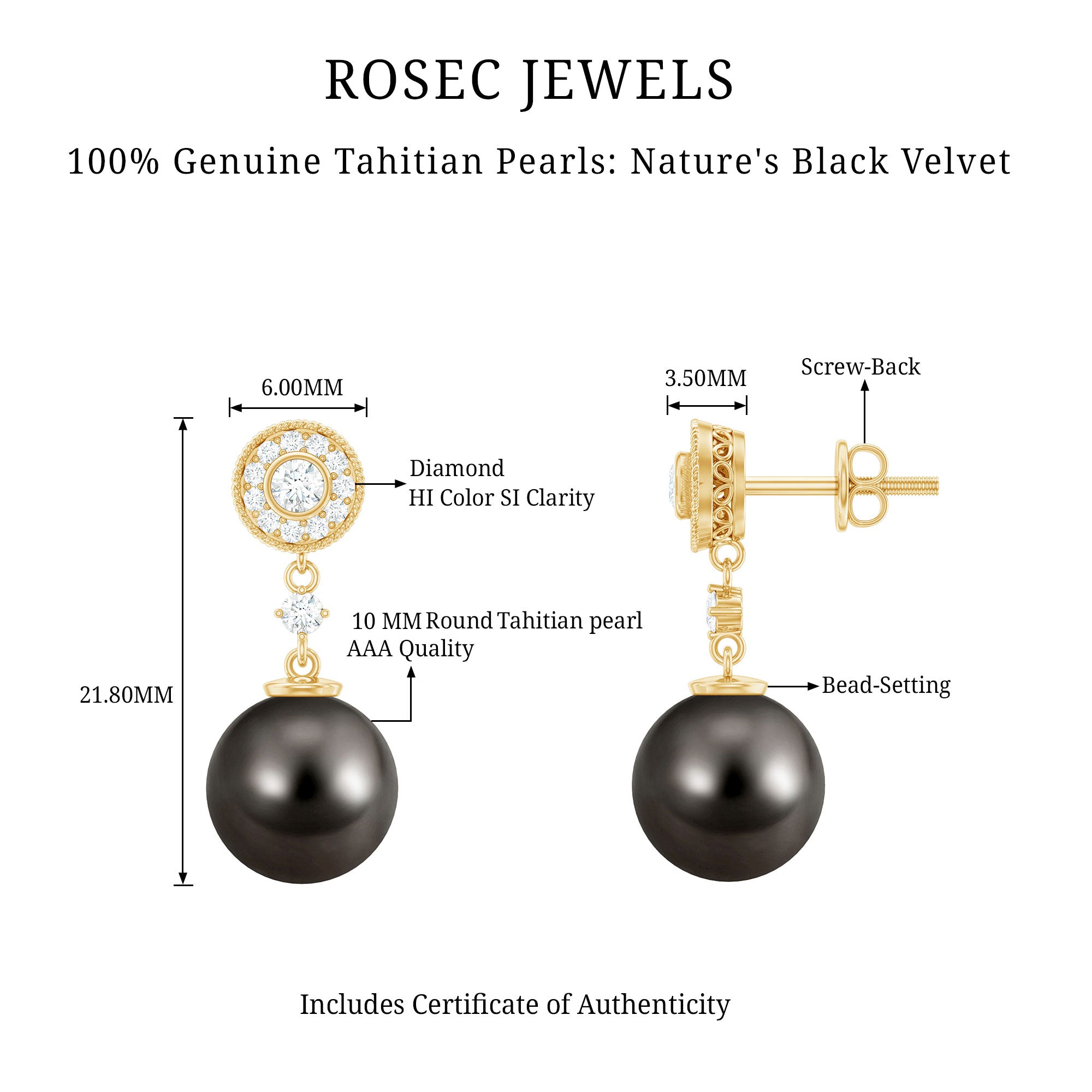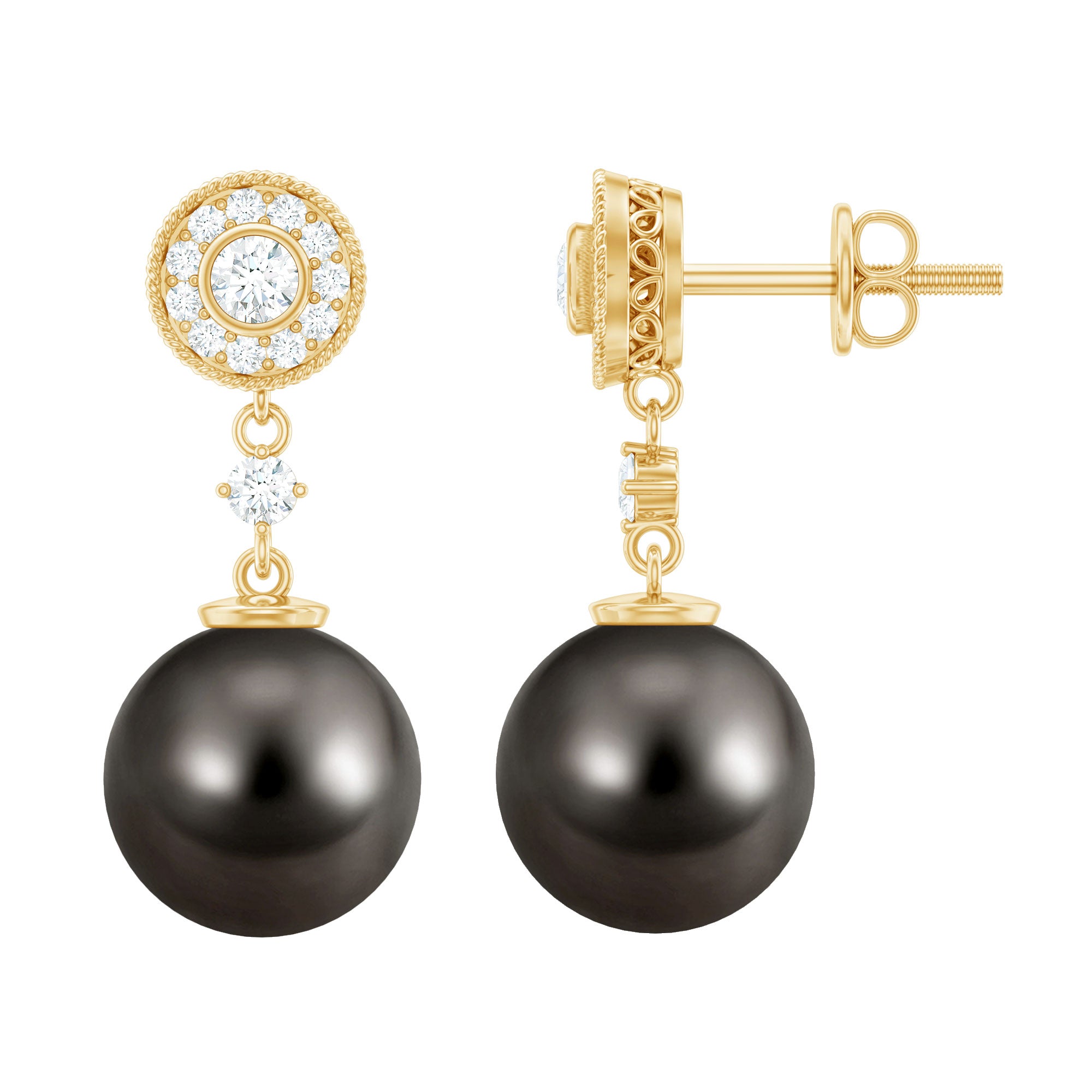 Crafted with a vintage-inspired design, this gorgeous dangle drop earring features a round Diamond set in a classic prong setting, with a lustrous Tahitian pearl as its striking drop. The beaded detailing adds an extra touch of beauty to this exquisite piece. Made of gold, these vintage dangle earrings are a true treasure to be cherished.