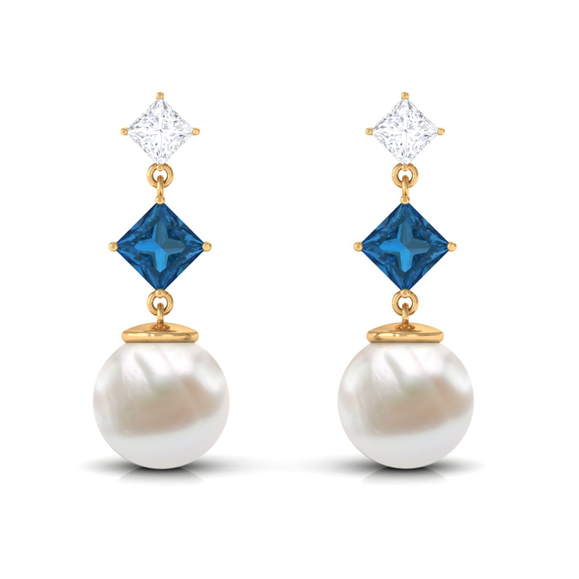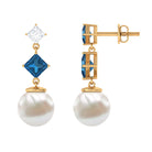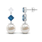 16.5 CT Freshwater Pearl and London Blue Topaz Dangle Drop Earrings with Moissanite