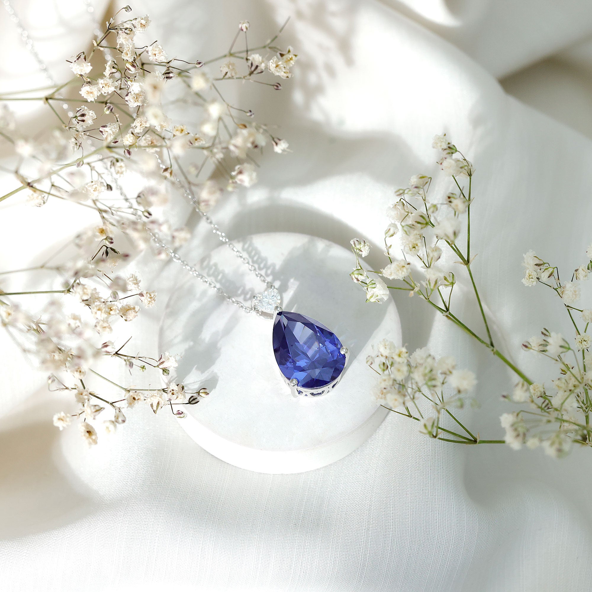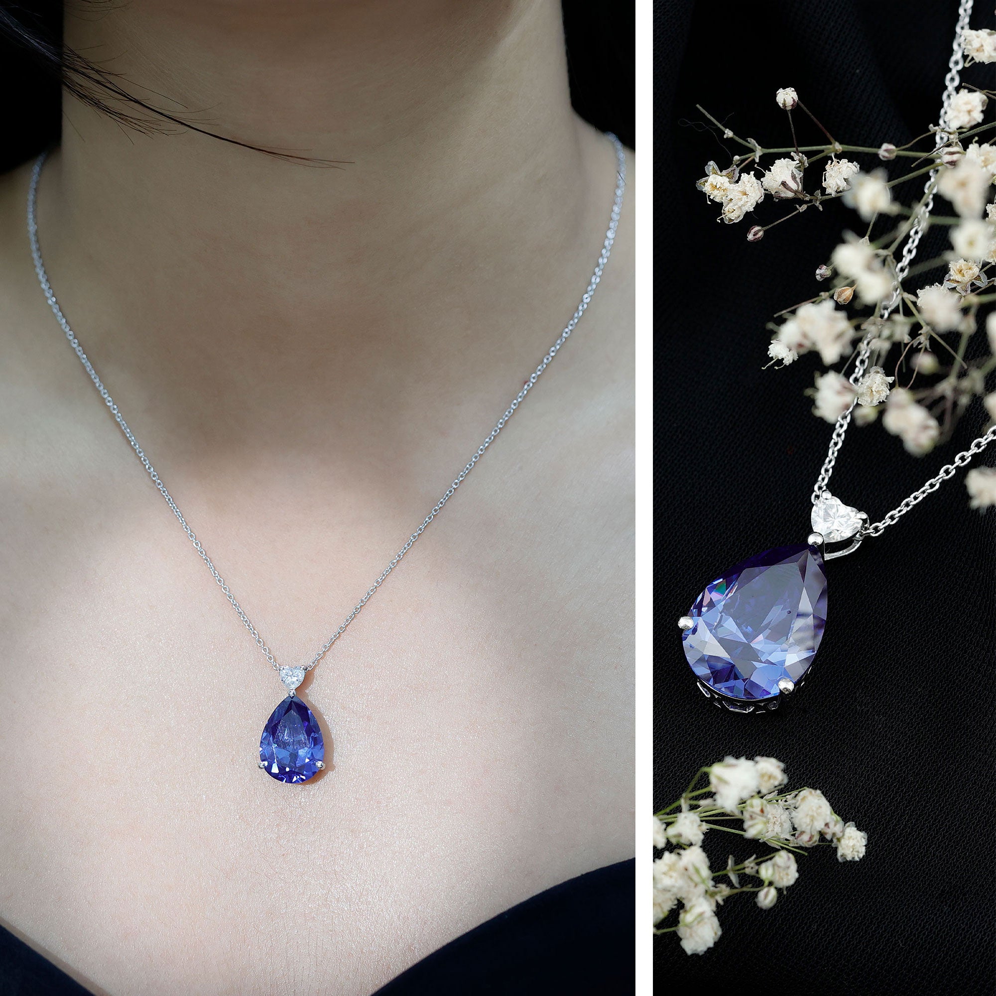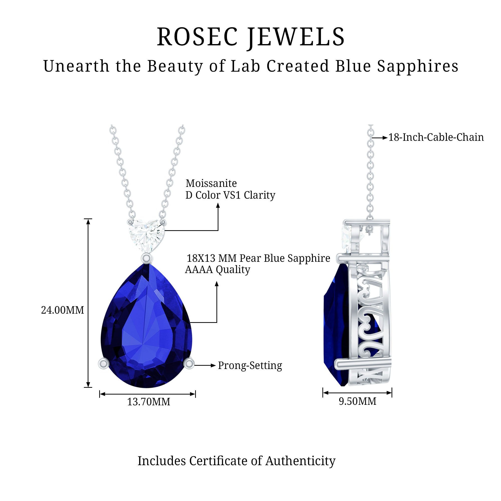 Complete your look with this Lab Grown Sapphire Pendant, precisely handcrafted with 14K White Gold Plated Silver. The pendant features an 18X13 MM Pear Shape Lab cultured Blue Sapphire topped with 5 MM Heart Shape Moissanite, adding a romantic charm to the design. The Statement Pendant Necklace has luxurious shimmer of AAAA quality lab Blue Sapphire, which automatically attracts everyone towards the wearer, and D-VS1 quality White Moissanite accentuates the rich blue color. This Teardrop Necklace beholds a royal aura, which makes it perfect to be worn on the special day. A cable chain is there holding the Pendant, so you can wear it comfortably and can layer with another stacking necklace. This Pear Shaped Necklace will be shipped to you in Premium packaging with a certificate of authenticity.