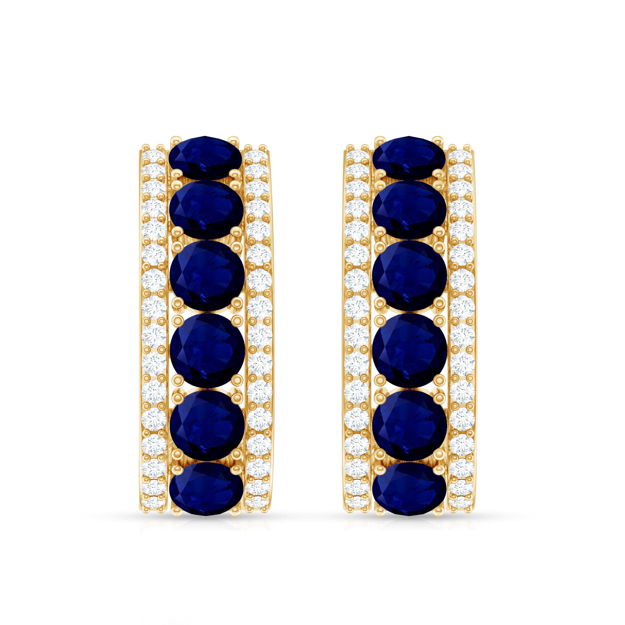 Genuine Round Shape Blue Sapphire is enhancing the beauty of Blue Sapphire and Diamond Hoop Earring. Sparkling Round Brilliant Diamond stones are set in prong setting around the gemstones to add more sparkle.