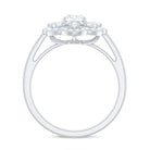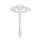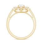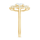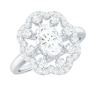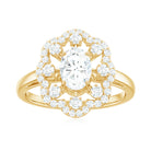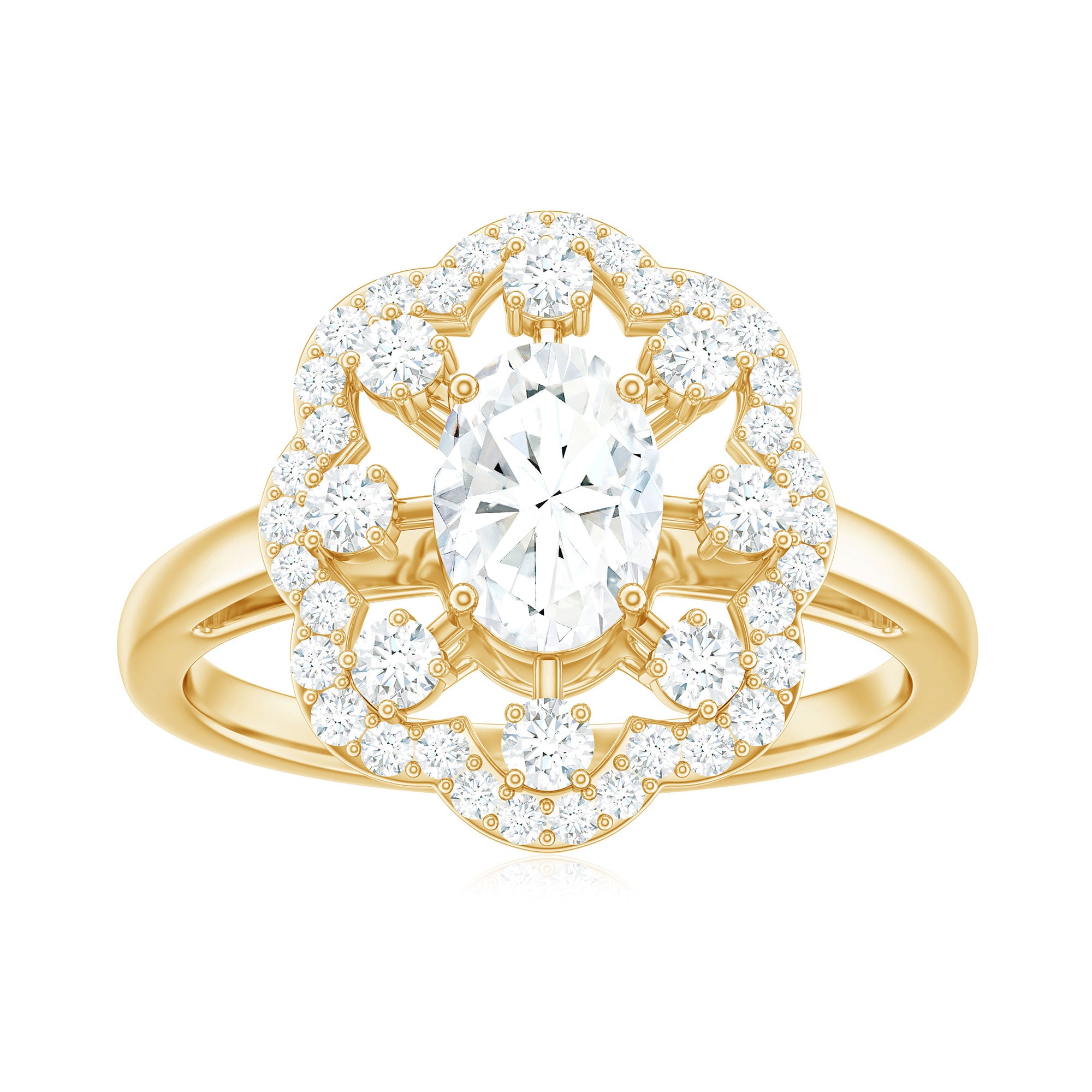 A Forever One Oval Cut Zircon gem glamorously updates this classic Zircon Engagement Ring. Set in gleaming Gold, a sea of simulated diamond accent gems encircle the center stone and make a Vintage Inspired Engagement Ring, brilliantly paving the way to everlasting love.