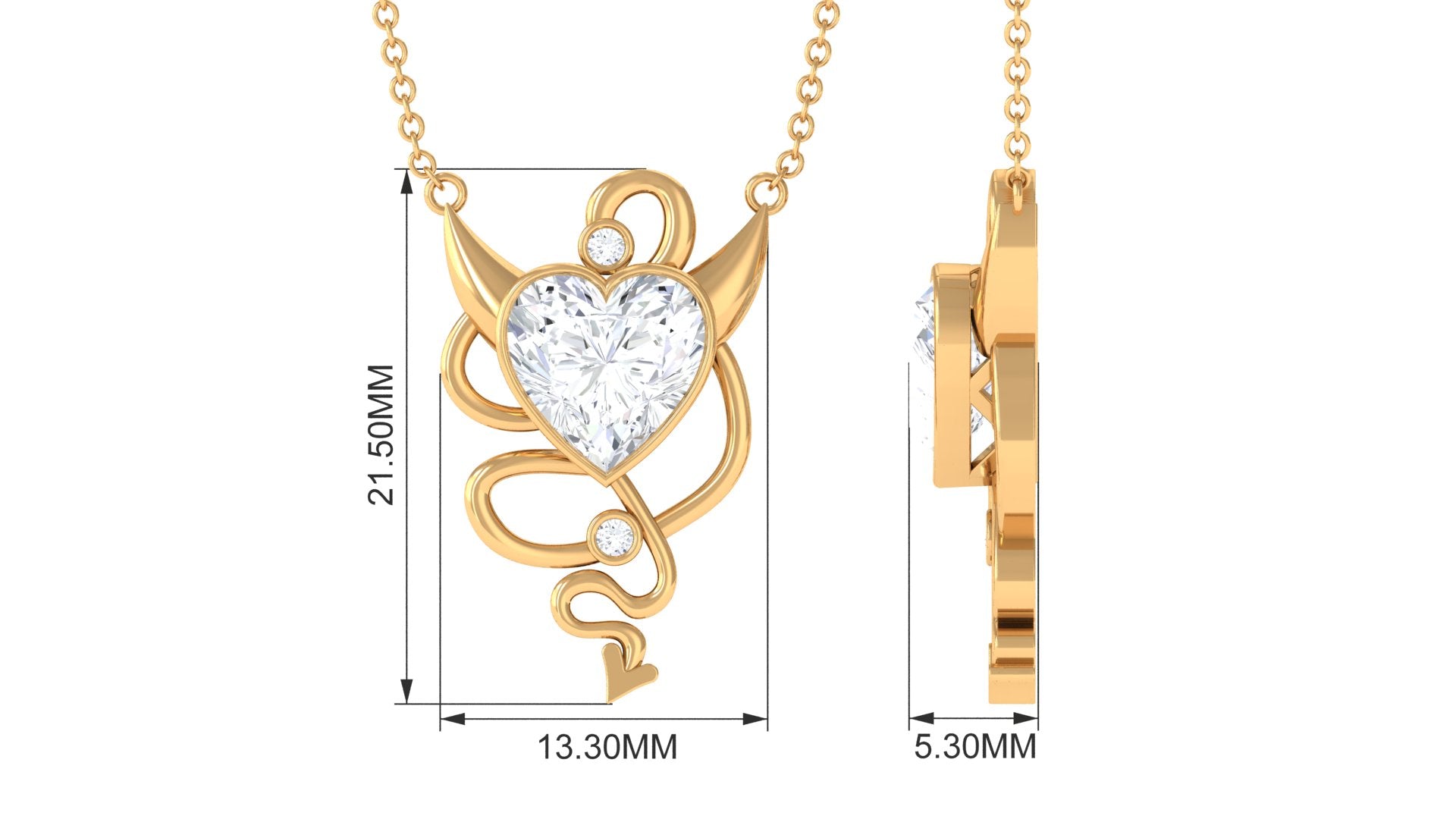 If youre looking for the perfect piece of jewelry to wear with your office attire, the Moissanite Devil Pendant is a great choice. This stunning pendant necklace features heart and round shaped Moissanite gemstones, totaling 2.25 Carats and set in a beautiful bezel setting on a gold pendant necklace. The pendant boasts D-VS1 quality and all of our gemstones are certified and undergo strict quality checks. Adorn yourself with this elegant Moissanite Devil Pendant Necklace and enjoy its beauty.