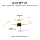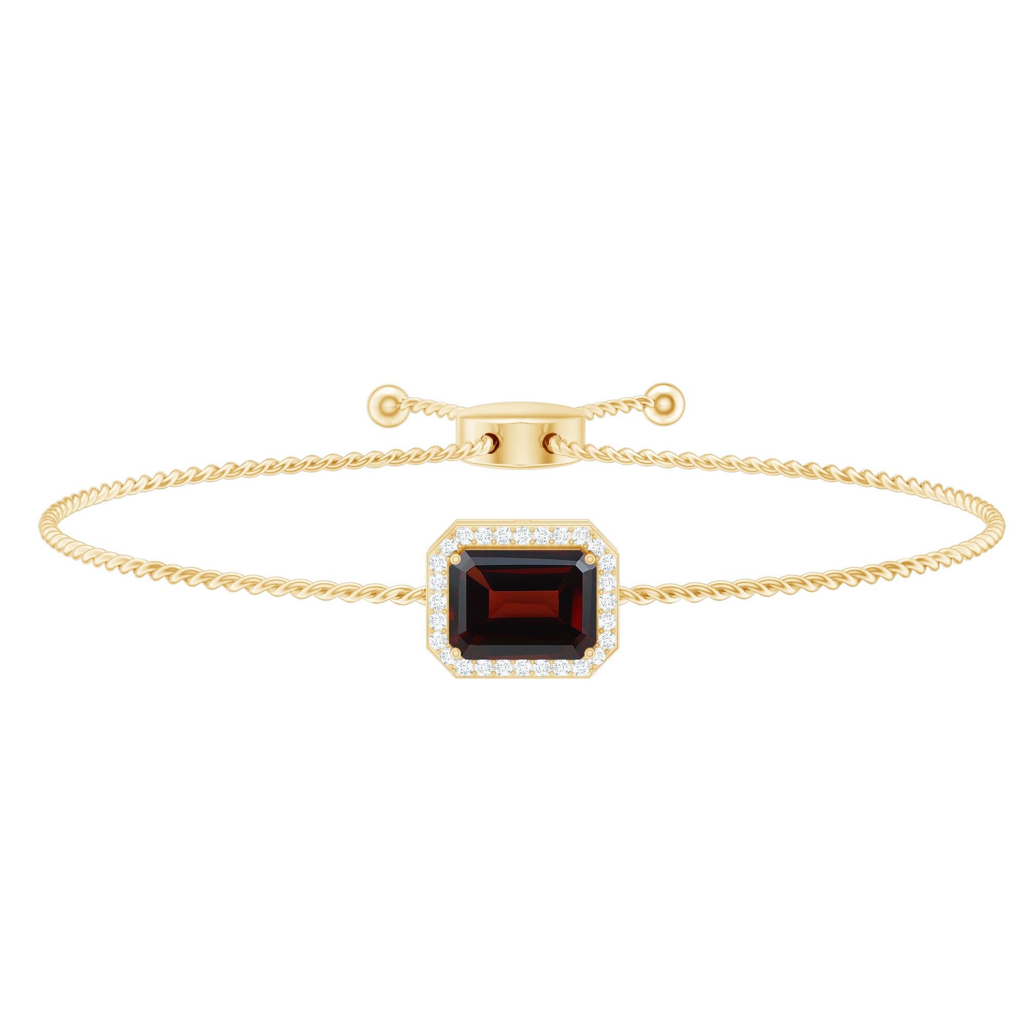 Enhance your personal style with our Halo Chain Bracelet, which features a striking contrast. The emerald-cut Garnet is elegantly secured in a prong setting, encircled by delicate round diamonds that form a captivating halo. The secure closures at both ends provide safety and allow for easy adjustments. The enchanting dark reddish hue and timeless brilliance of the diamonds are guaranteed to draw everyones attention and place you in the limelight. Indulge yourself or present it as a gift to a loved one, as it serves as a charming birthday or anniversary present. This Garnet Bracelet, with its exceptional design, embodies a fusion of understated elegance and breathtaking beauty. Emphasizing exquisite luxury, this Bolo Chain Bracelet could be the ideal gift for weddings, anniversaries, or any special occasion for someone dear to you. Additionally, Garnet is linked to the January birthstone, making it a thoughtful gift for her.