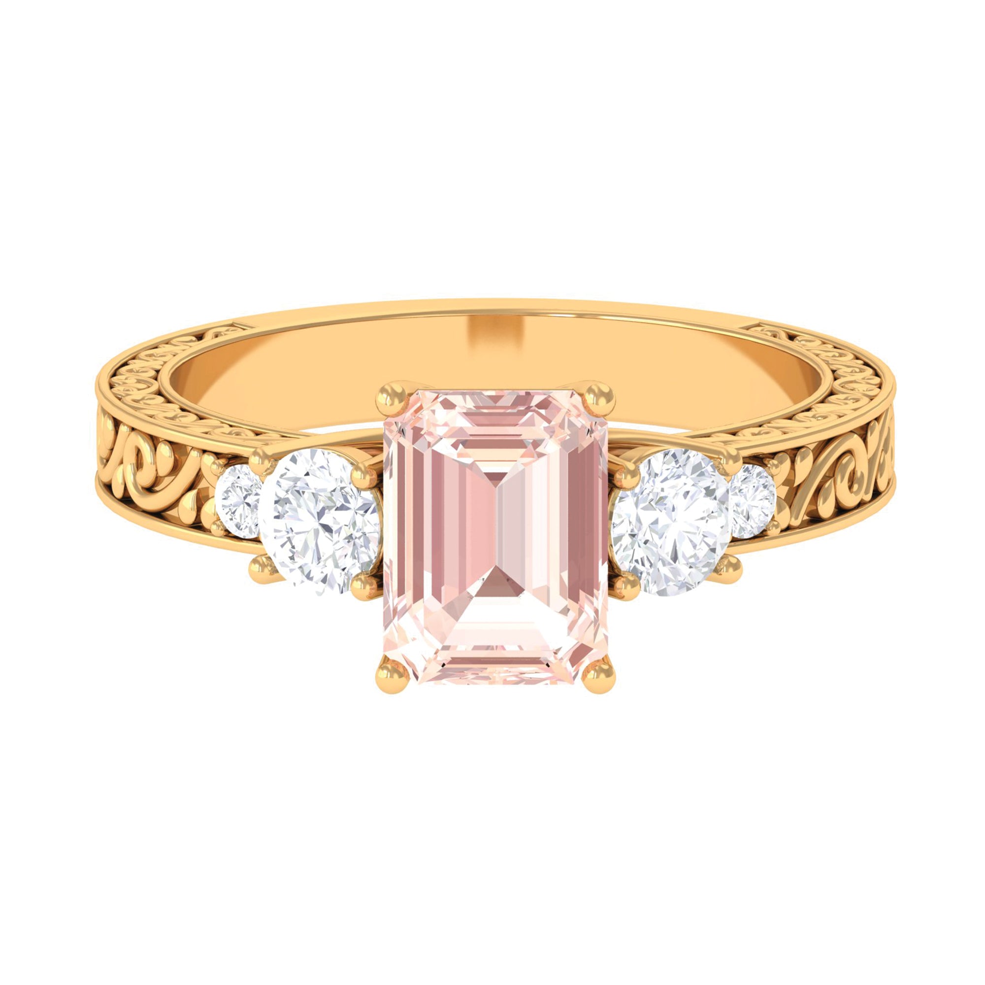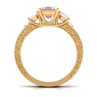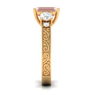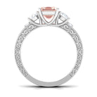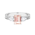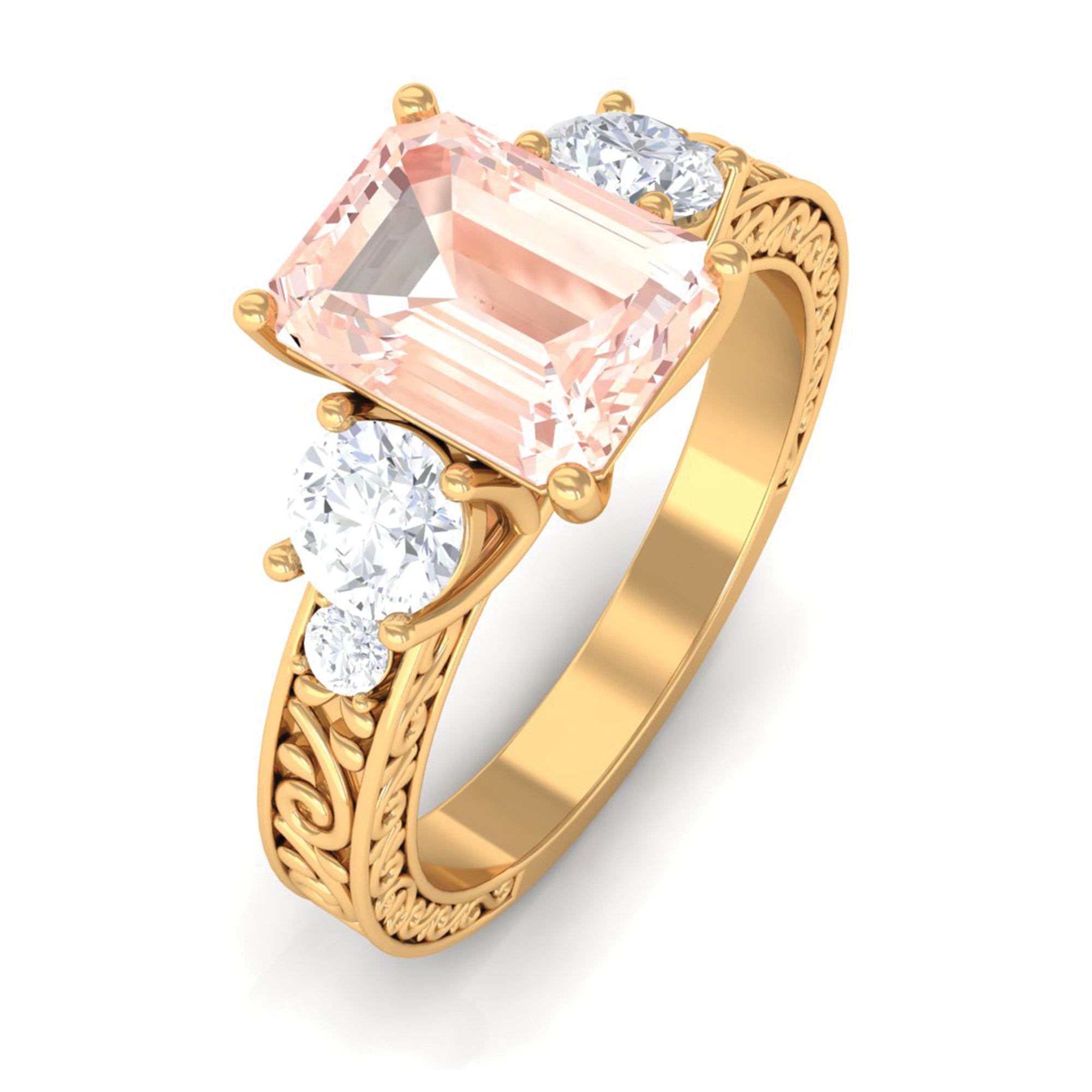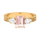 Freshen up your look with this Morganite 3 Stone Ring. It features with Octagon Cut Morganite and Moissanite in Prong setting on Moissanite Ring. Crafted in Solid Gold on Engraved Ring. Gift your loved one this dazzling Moissanite Anniversary Rings to feel her at the top of the sky.