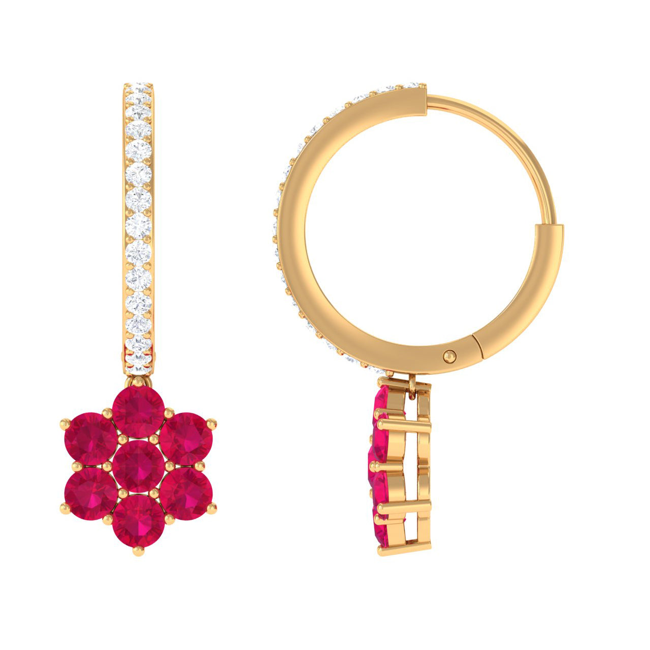 Look fresh like a flower when you flaunt these Drop Dangle Hoop Earrings embellished with Round Cut Ruby flower with Moissanite accent adding to the look of these Hoop Earrings.