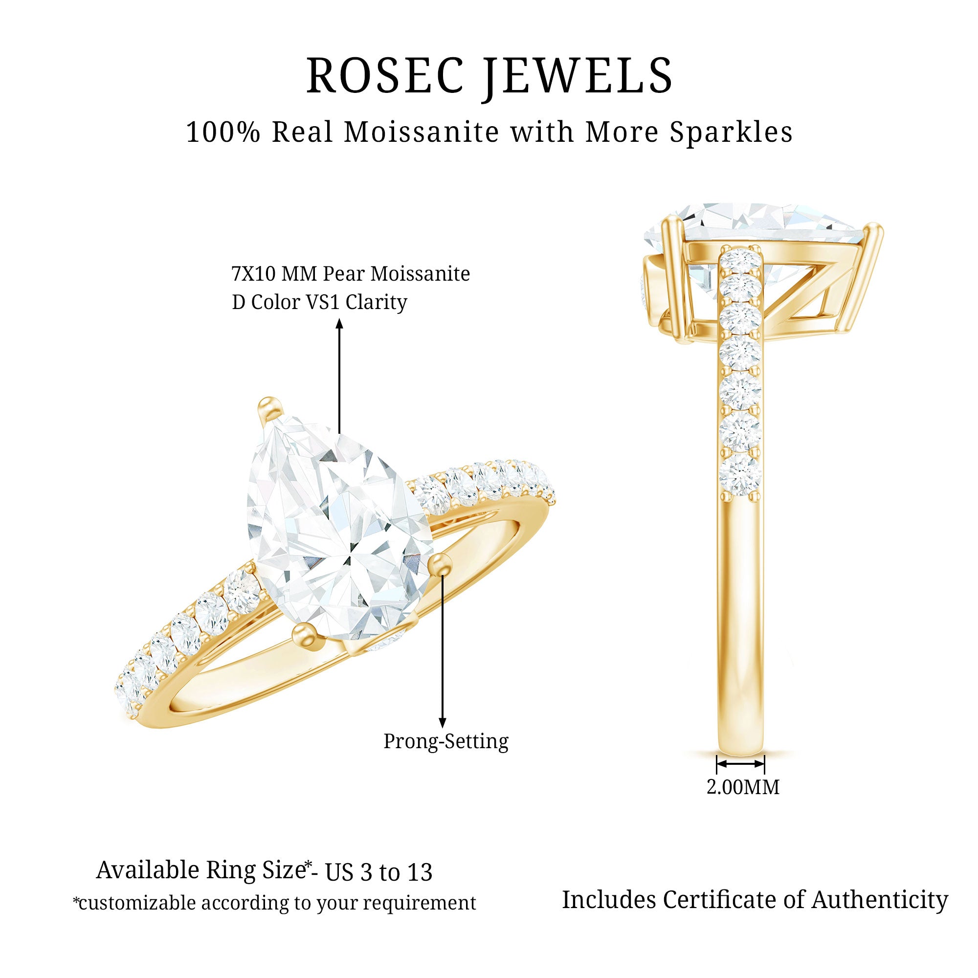 This Pear Moissanite Engagement Ring perfectly combines classic charm with modern sophistication. At its heart lies a breathtaking 7X10 MM pear shaped moissanite, securely held in a prong setting. The D-VS1 quality center stone shines brilliantly with every movement, making it the highlight of the Solitaire Engagement Ring. The band is adorned with a row of moissanite stones, providing a subtle sparkle that complements the center gem without overshadowing it. A thoughtful detail is the peek-a-boo moissanite tucked beneath the center stone, adding a delicate surprise. The pear-shaped center, along with the side stones, creates an elegant flow in the Teardrop Engagement Ring that flatters the finger from all angles. This Pear Shaped Engagement Ring comes beautifully packaged, ready to celebrate one of life’s most unforgettable moments. With various ring sizes, metal choices, and finishes available, it can be tailored to showcase your unique style.