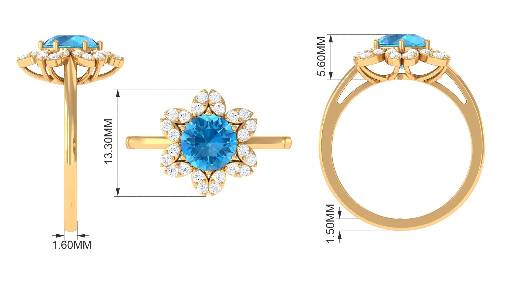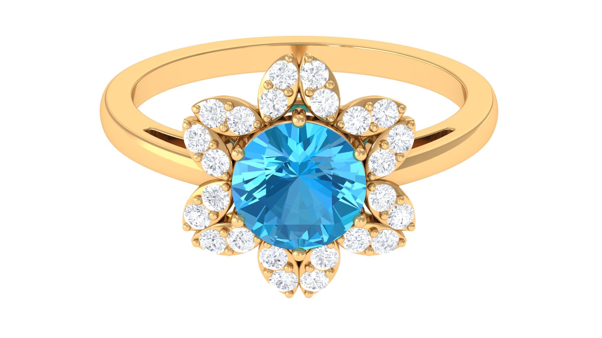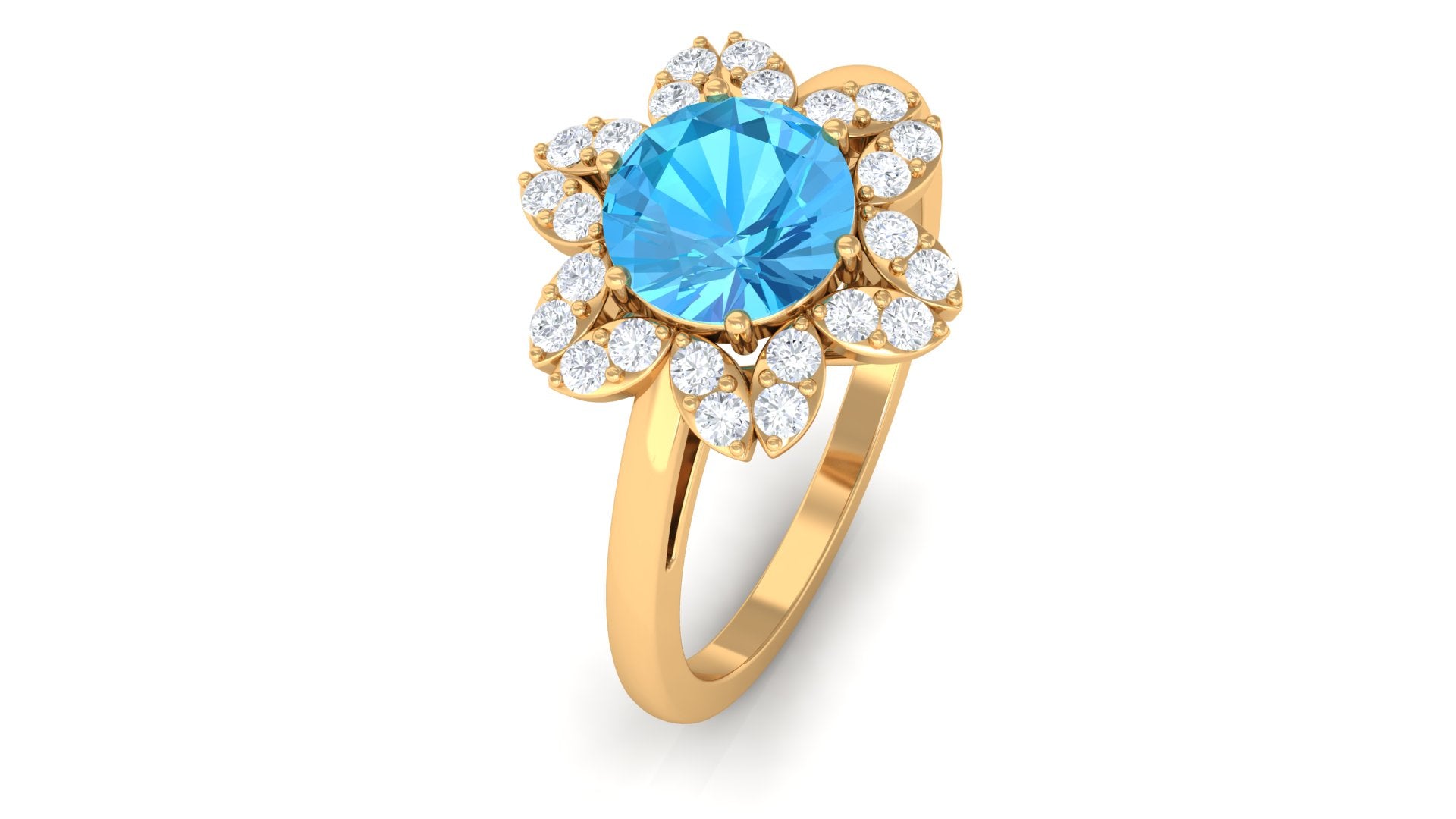 Adorn yourself in the delicate elegance of our Floral Ring, designed to make you bloom like a flower. This exquisite piece features a captivating Round Shape Swiss Blue Topaz, securely cradled in a 6 Prong Setting. The bloom is further enhanced by a brilliant Round Shape Diamond Halo, adding a touch of timeless sparkle. Meticulously crafted, this ring symbolizes the beauty of growth and the radiance that unfolds with every precious moment. The vibrant blue of the Swiss Blue Topaz captures the essence of tranquility, while the surrounding Diamond stones illuminate the piece with an everlasting brilliance. Embrace the enchantment of natures beauty and the promise of enduring elegance with this captivating floral-inspired ring.