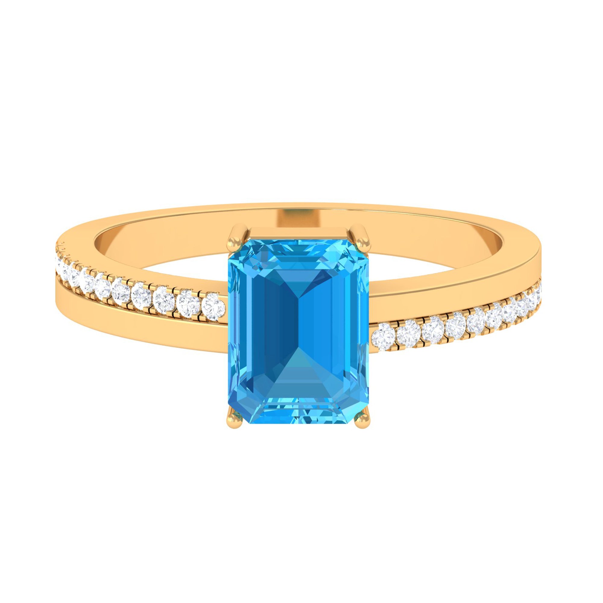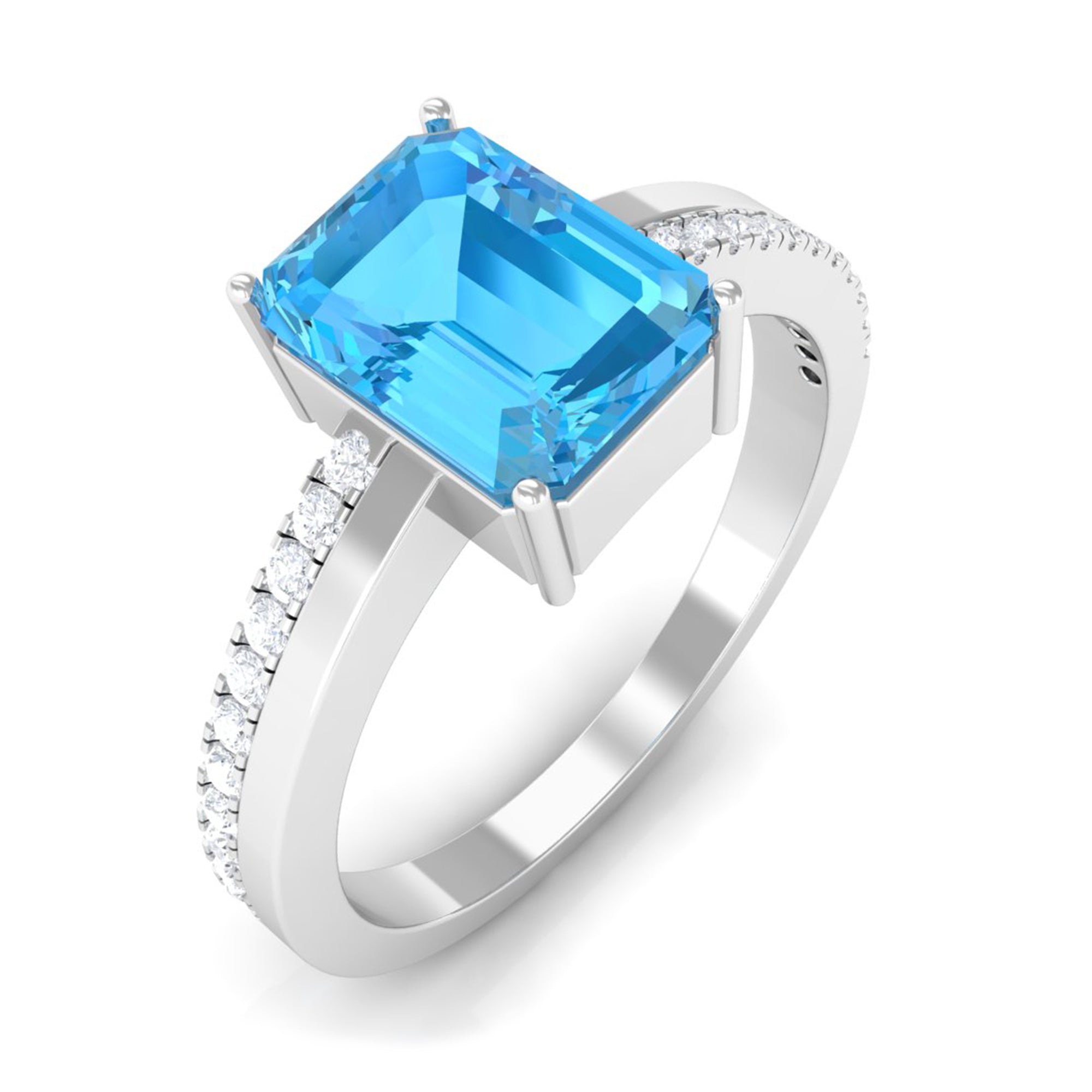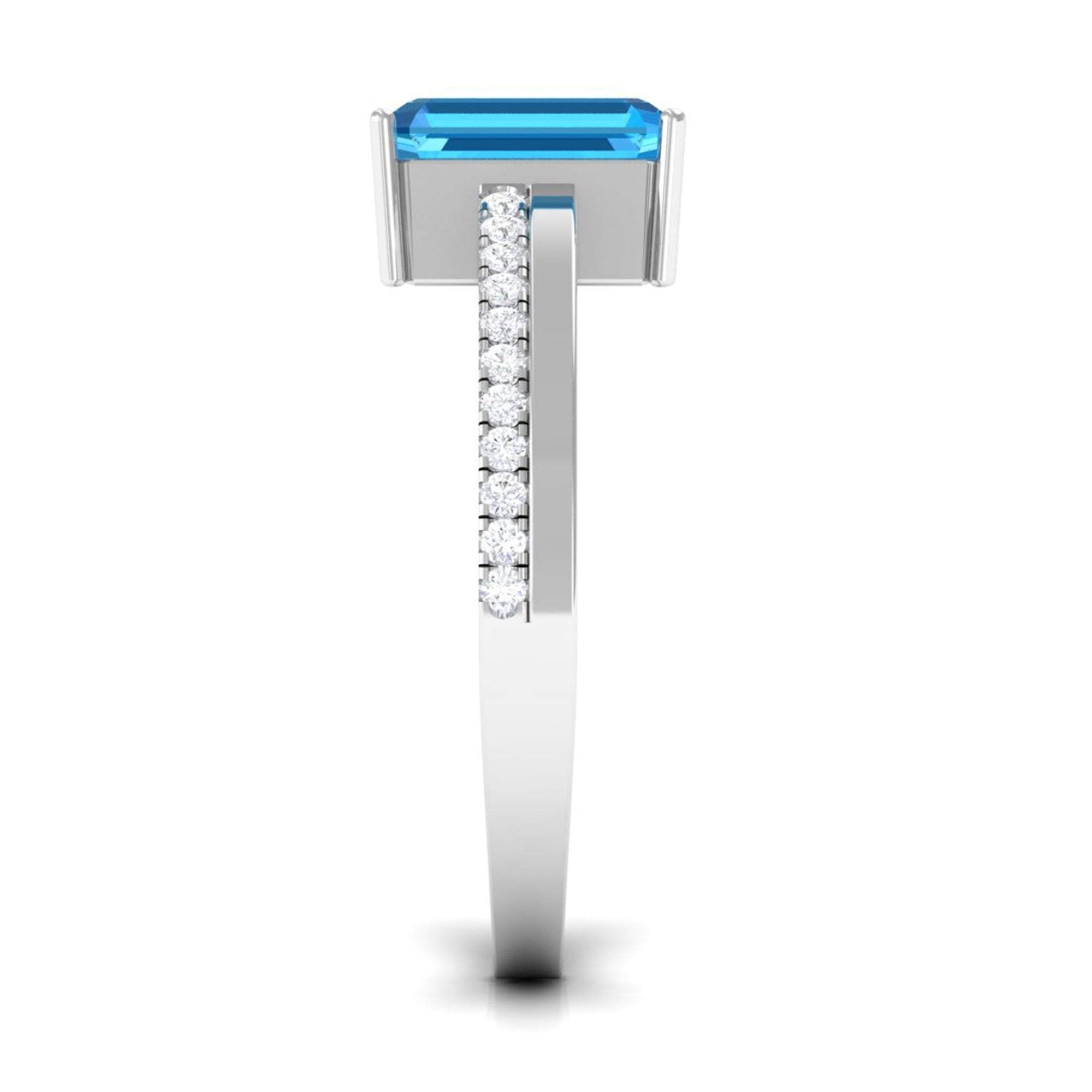 Make a Fashionable Statement when you flaunt this Solitaire Ring studded with an Emerald Cut Swiss Blue Topaz Solitaire accentuated by Round Diamond Accents, in a unique Two Tone Pattern which adds to the look of this ring.