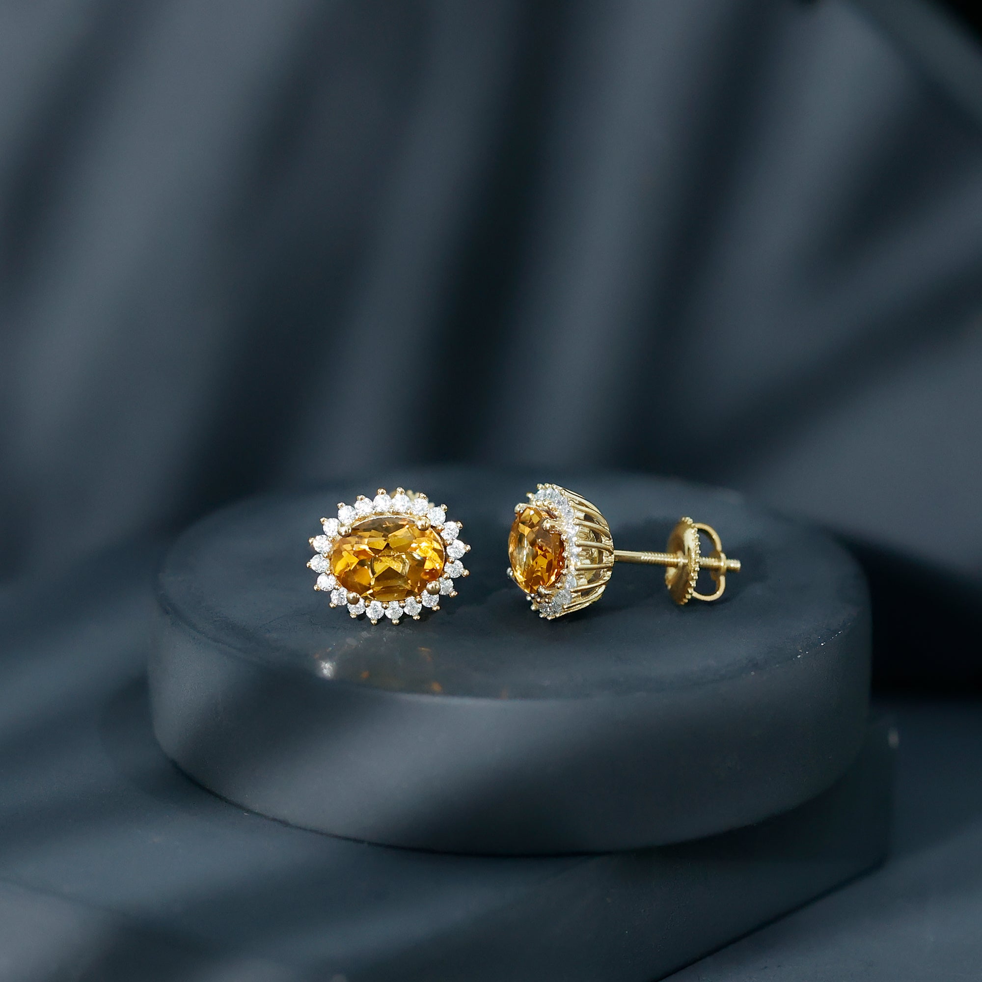 Natural 6X8mm Oval Citrine Stud Earrings with Halo