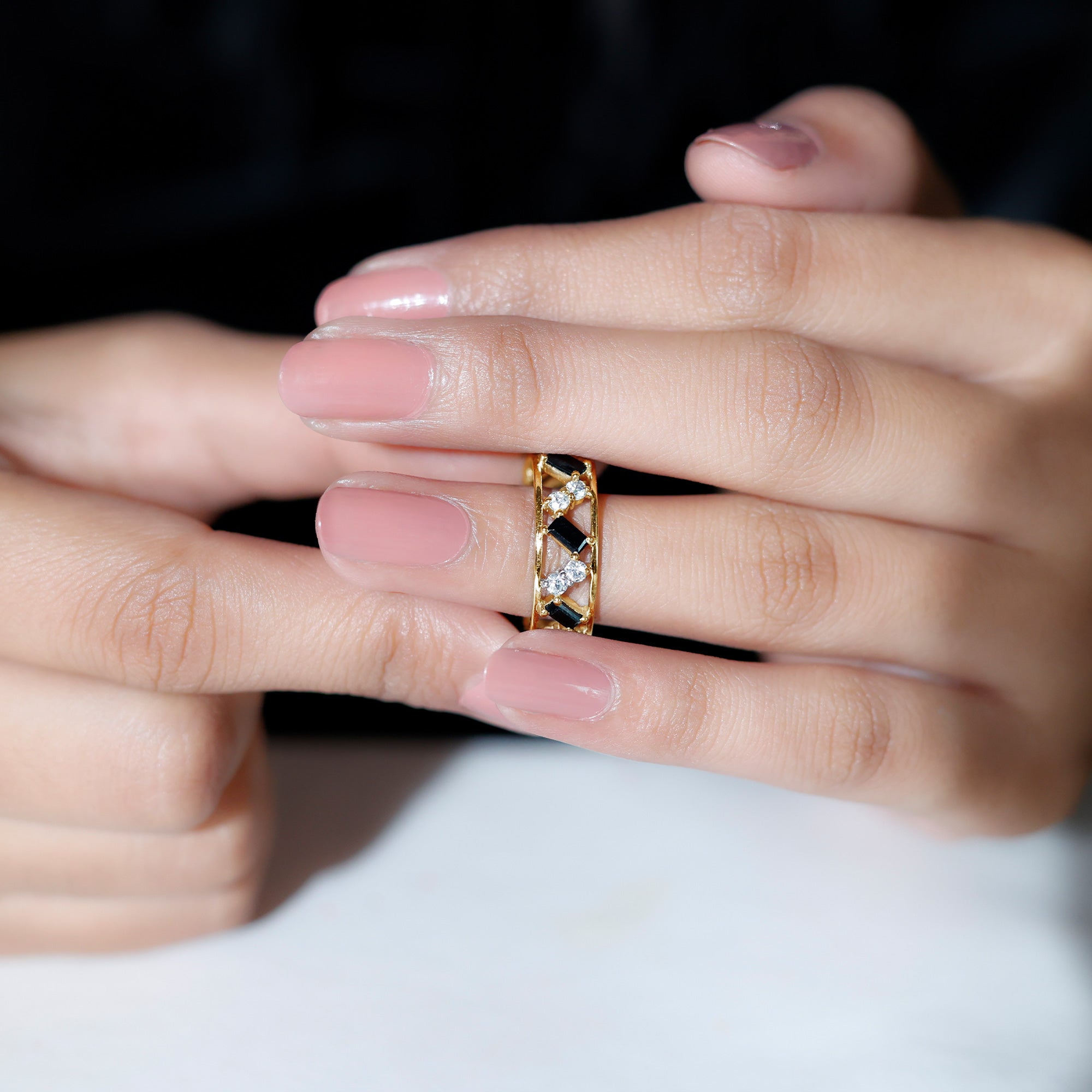 Meet your new favorite piece - a Black Onyx Eternity Band that is all about bold vibes with a romantic twist. Designed with a wide band and a bold zig-zag layout, this Onyx and Diamond Ring is made for those who love jewelry with personality. Whether you are celebrating an anniversary, saying your big YES, or just want something seriously stunning, this Black and White Wedding Band brings all the needed sparkle. It features baguette cut black onyx stones and round cut diamonds, set alternatively in a zig-zag pattern that wraps all the way around your finger. Each stone is held securely in prong setting, so you get the perfect mix of style and stability. The contrast between the deep black onyx and the bright white diamonds gives the ring a designer look, without trying too hard. It is modern, it is artistic, and honestly, it looks amazing from every angle. Perfect as a wedding band, anniversary gift, or a bold statement piece to wear on its own, this eternity ring is built to be admired. You can stack it, flaunt it solo, or pair it with your favorite outfit, it will do the work every time. For the ones who do not follow the crowd, this Wide Wedding Band is for you.