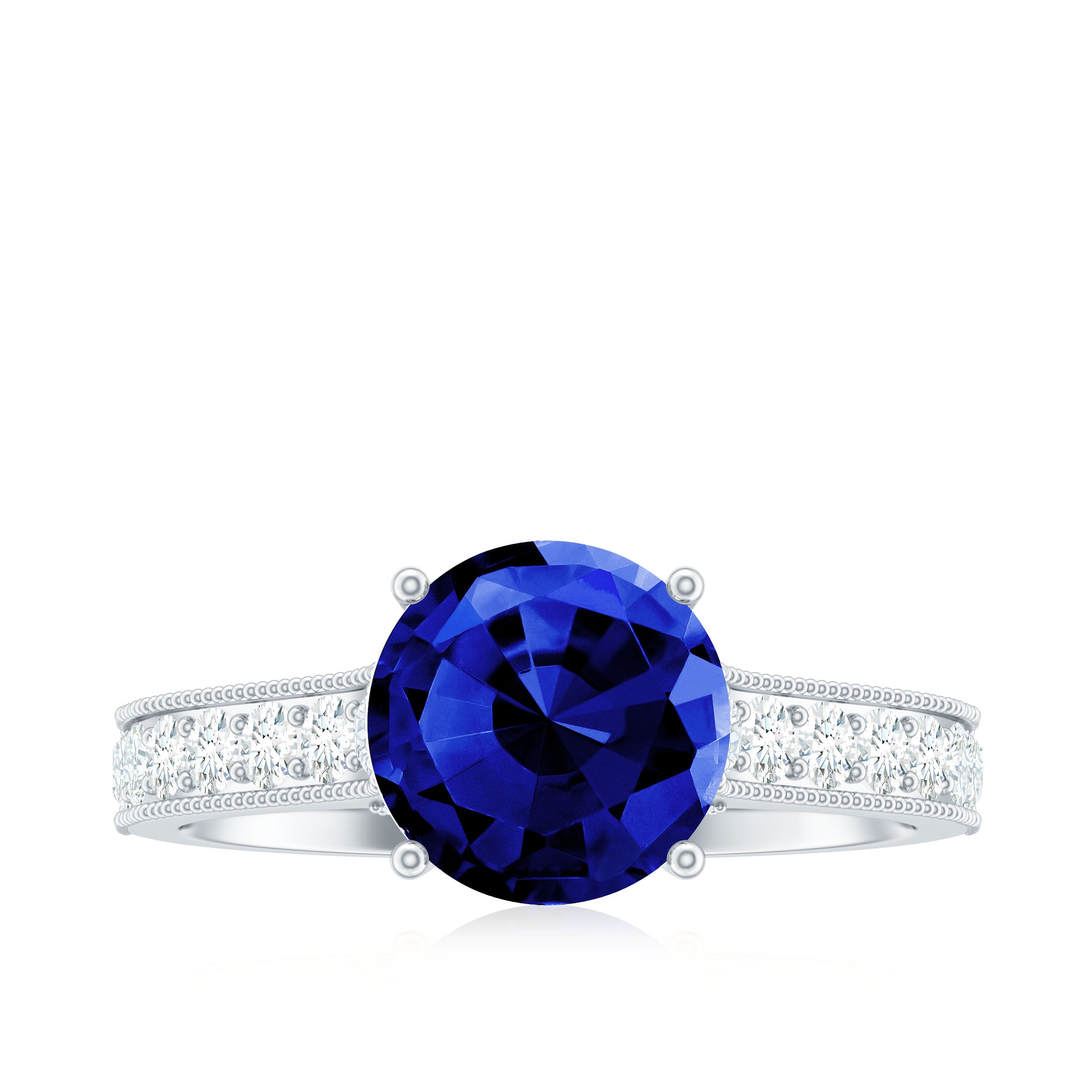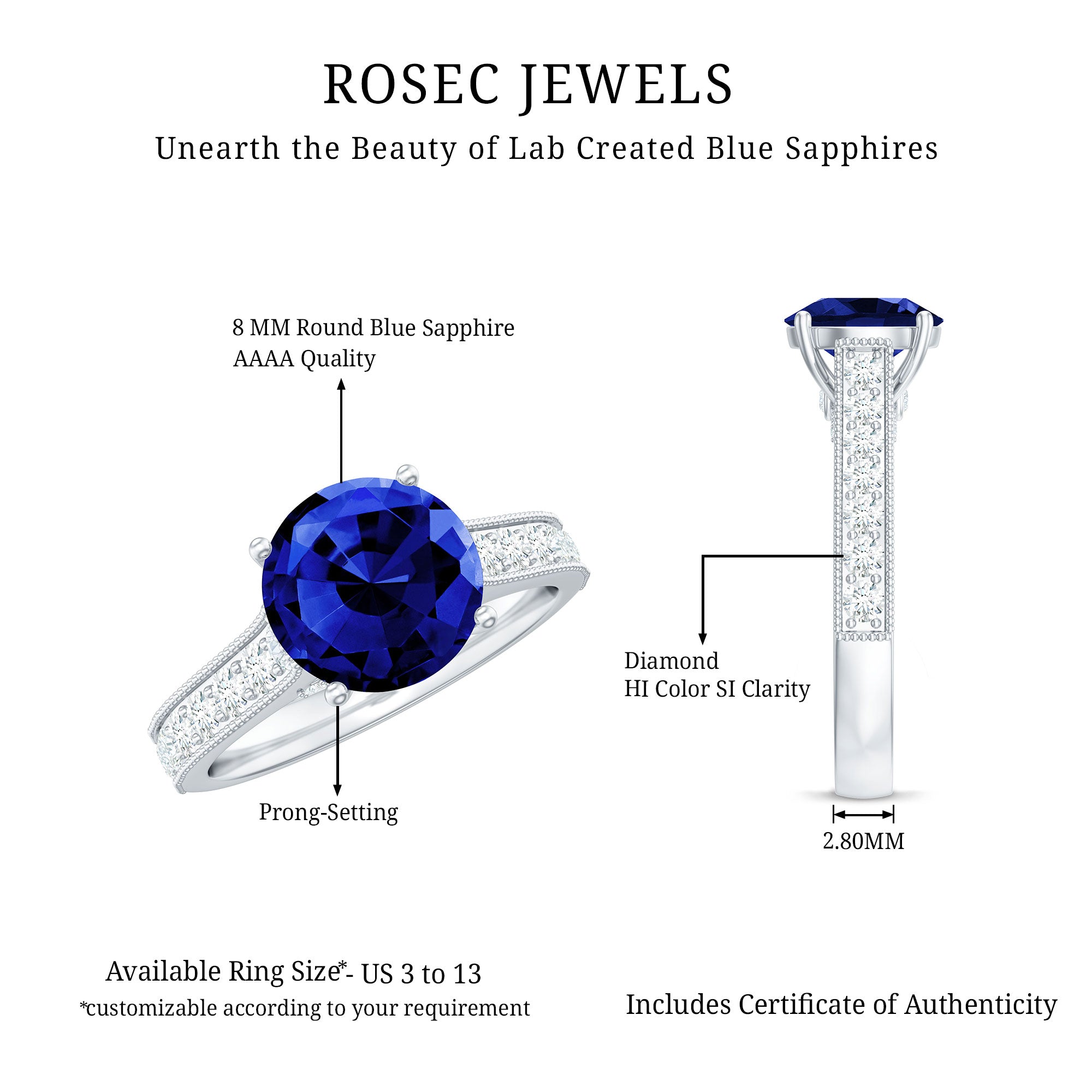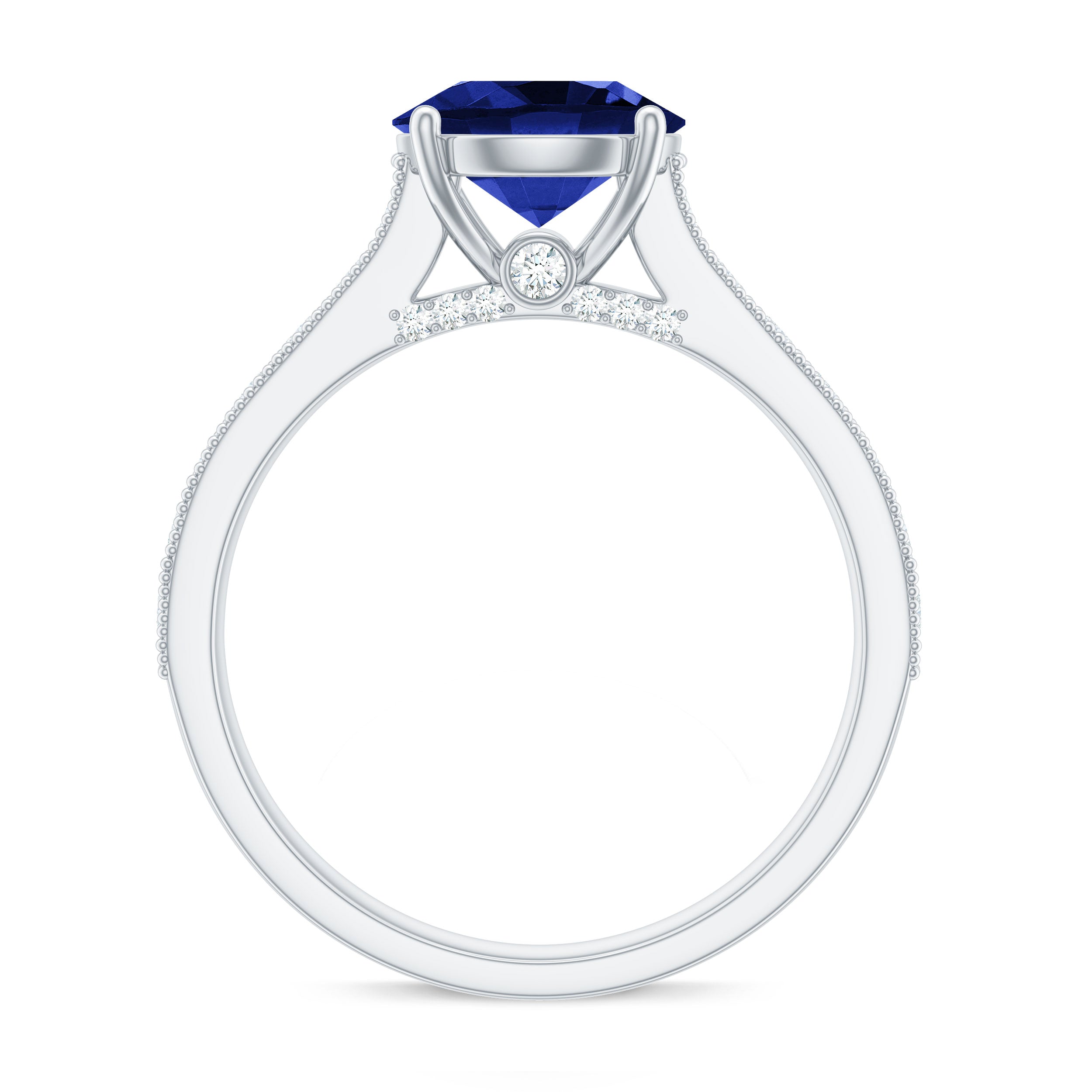 2.50 CT Created Blue Sapphire Solitaire Engagement Ring with Diamond and Milgrain Detailing