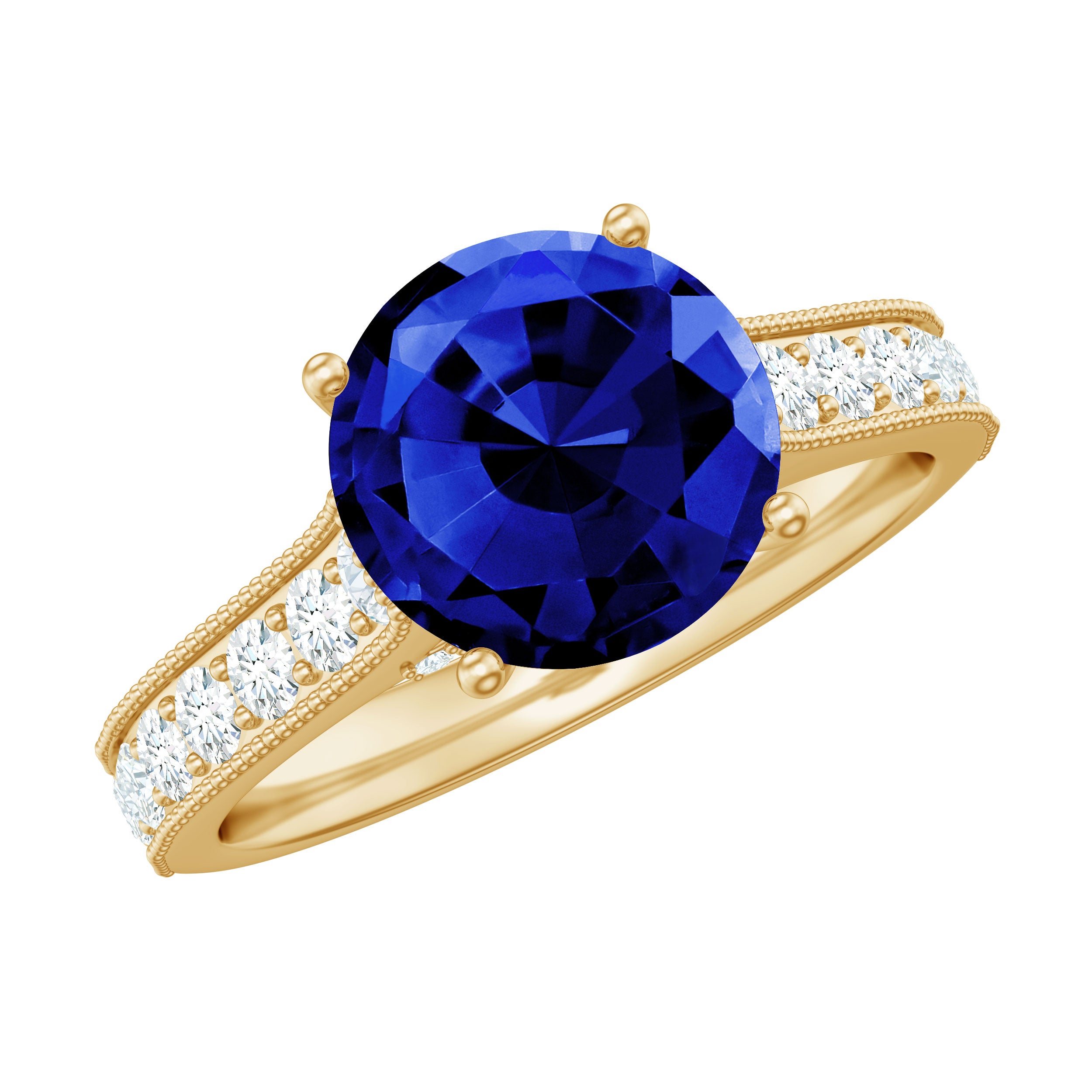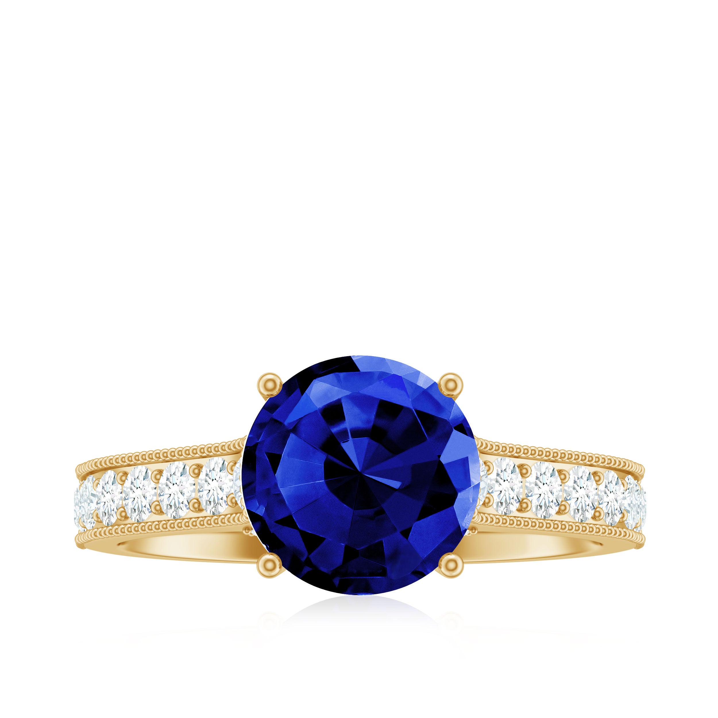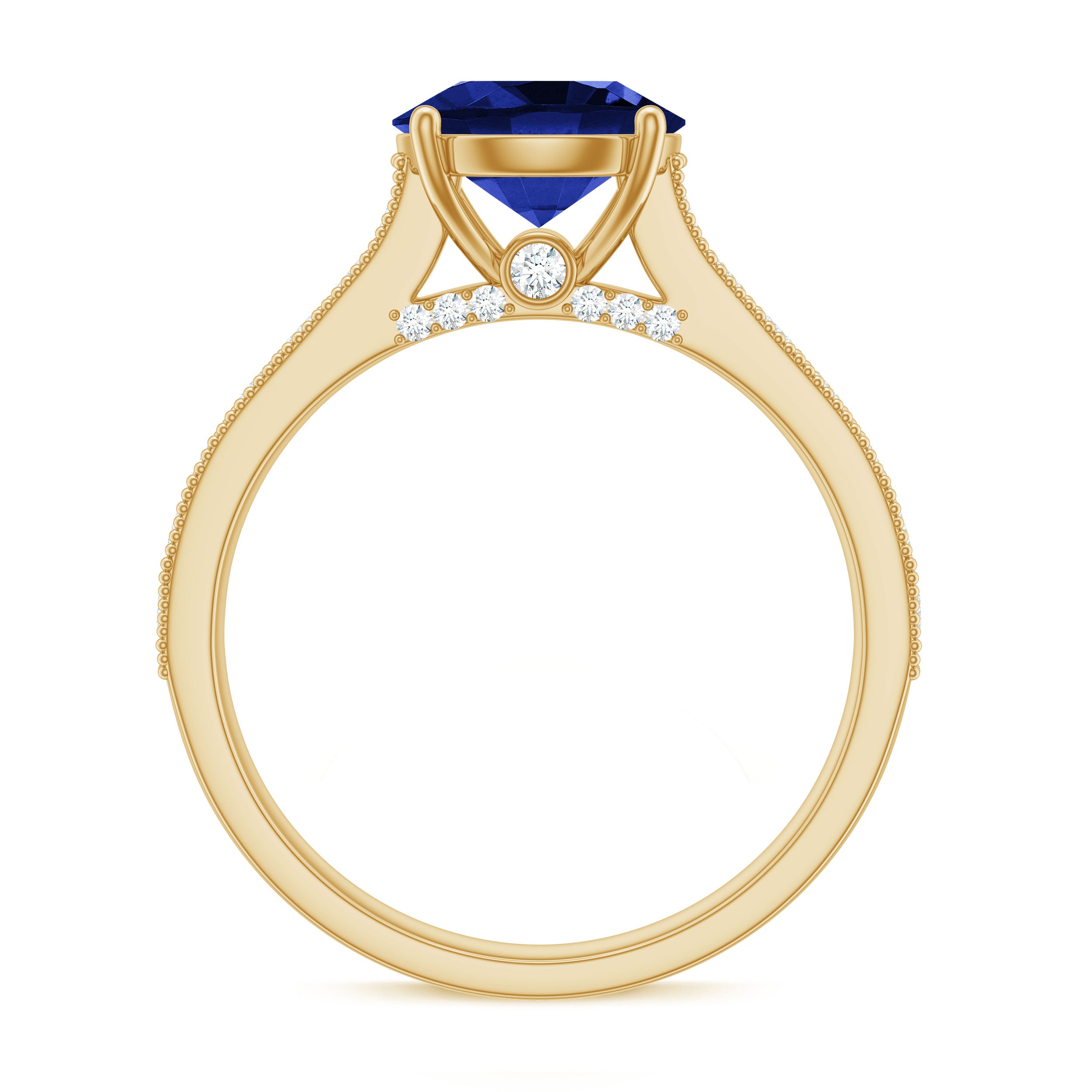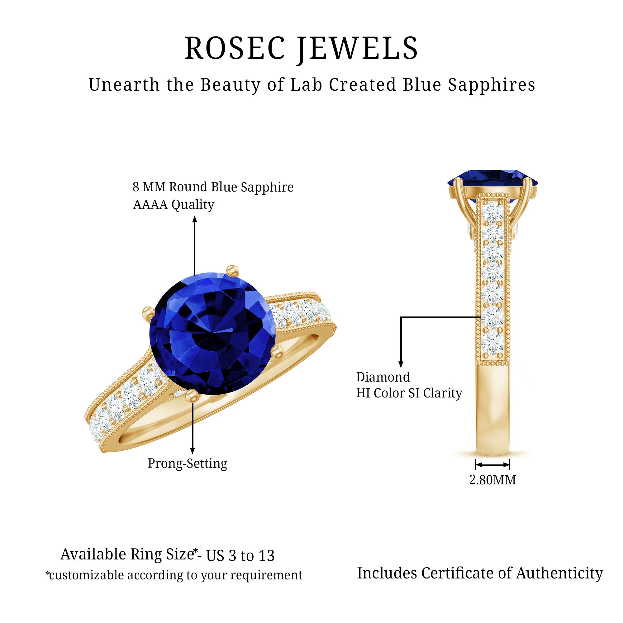 2.50 CT Created Blue Sapphire Solitaire Engagement Ring with Diamond and Milgrain Detailing