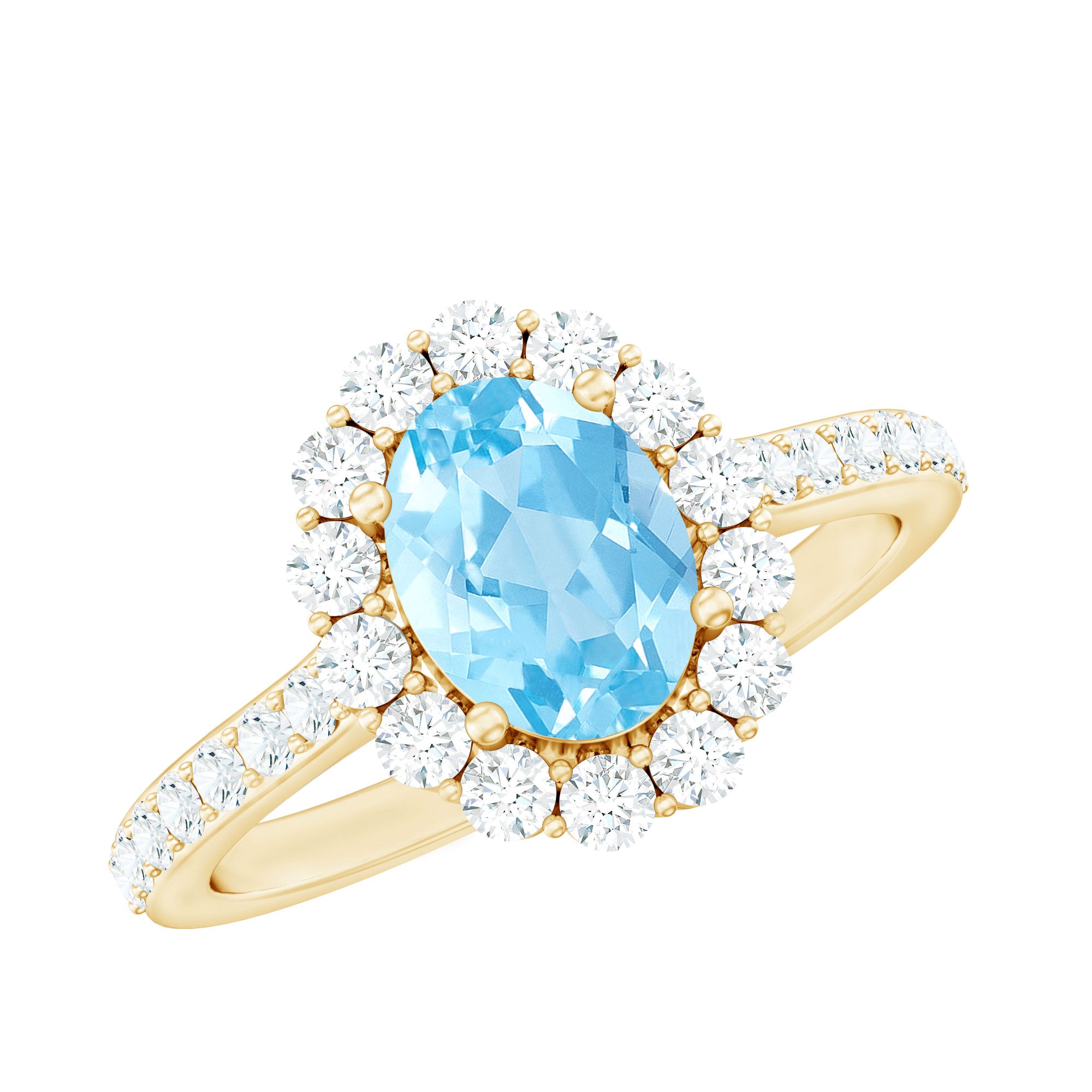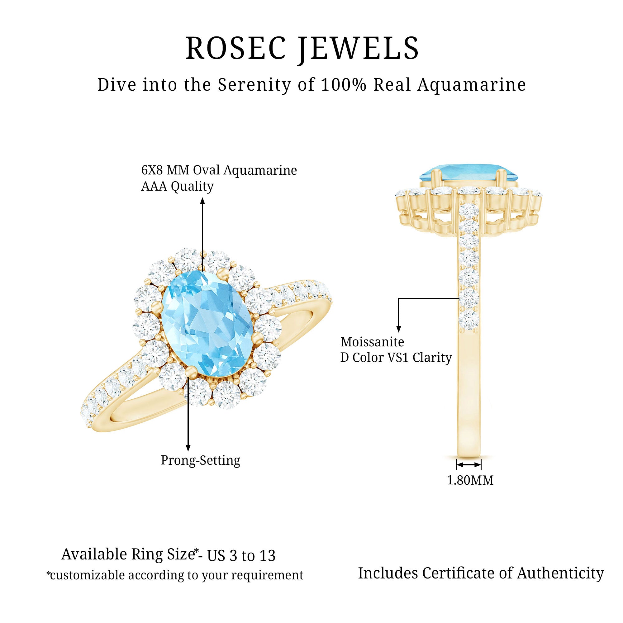 Unique Engagement Ring is the beautiful accessory engraved with Oval Cut Aquamarine as Solitaire and Round Shape Moissanite is set in Halo and Side Stone Setting. This lovely Engagement Ring makes a statement piece for women is composed of Solid Gold.