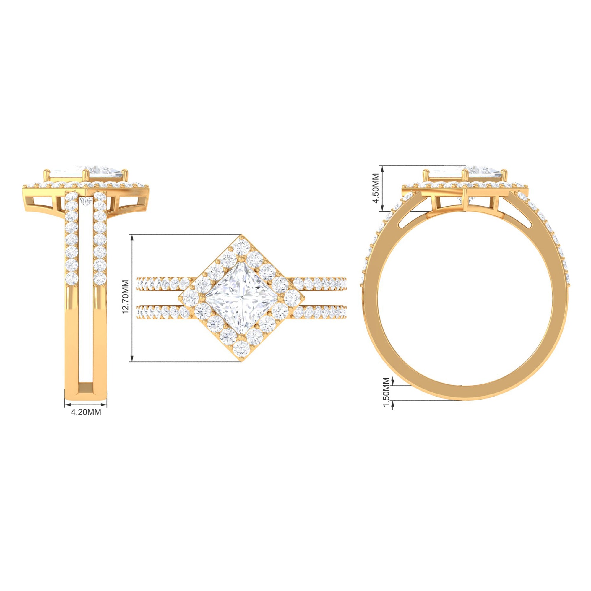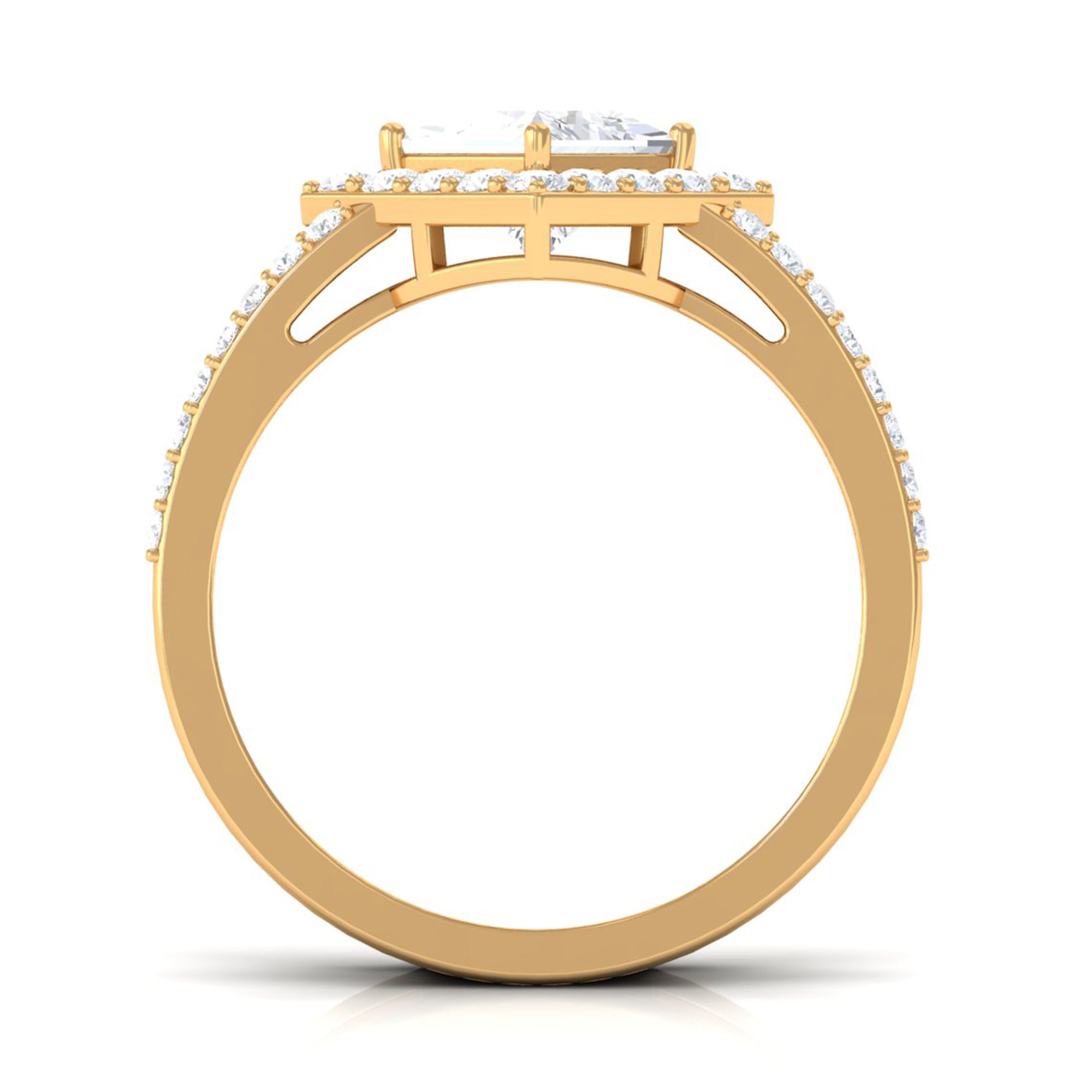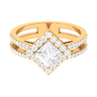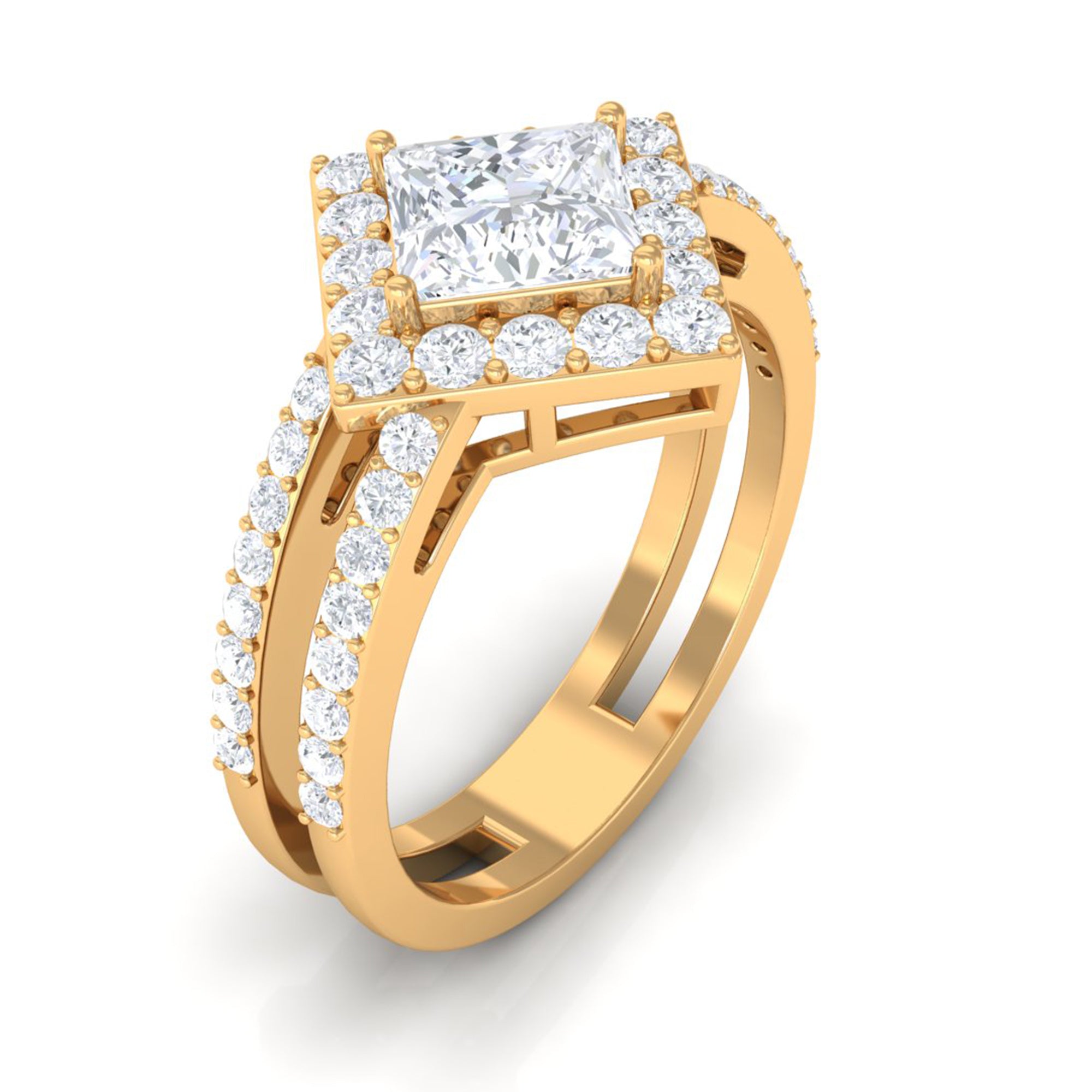 Featuring an elegant Cubic Zirconia Engagement Ring adorned with Princess cut Zircon set at the center of the ring with double band shank in Prong Setting and round cut zircon halo and side stones creates an appealing look. This Zircon Engagement Ring is crafted in Gold for an eye catching and appealing look.