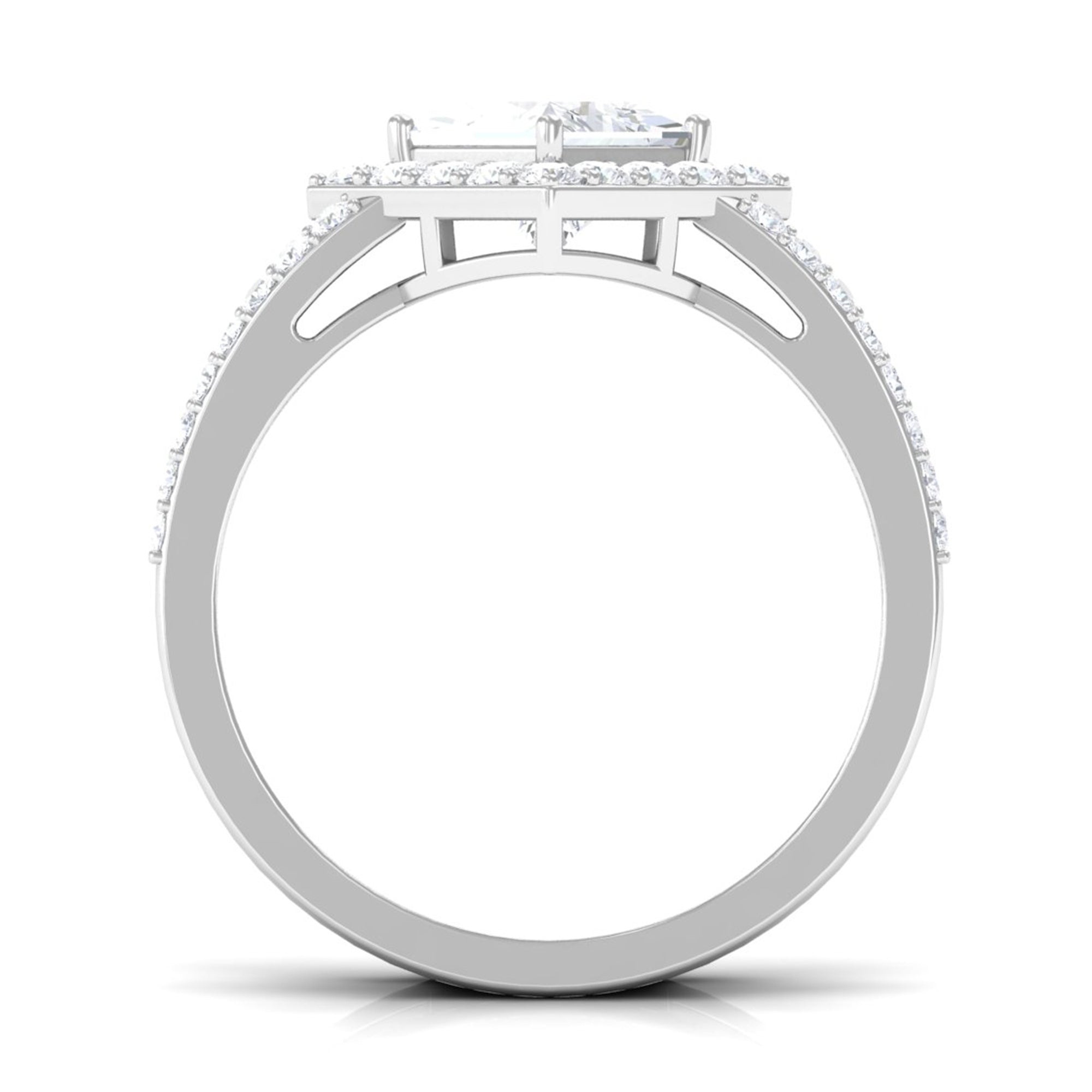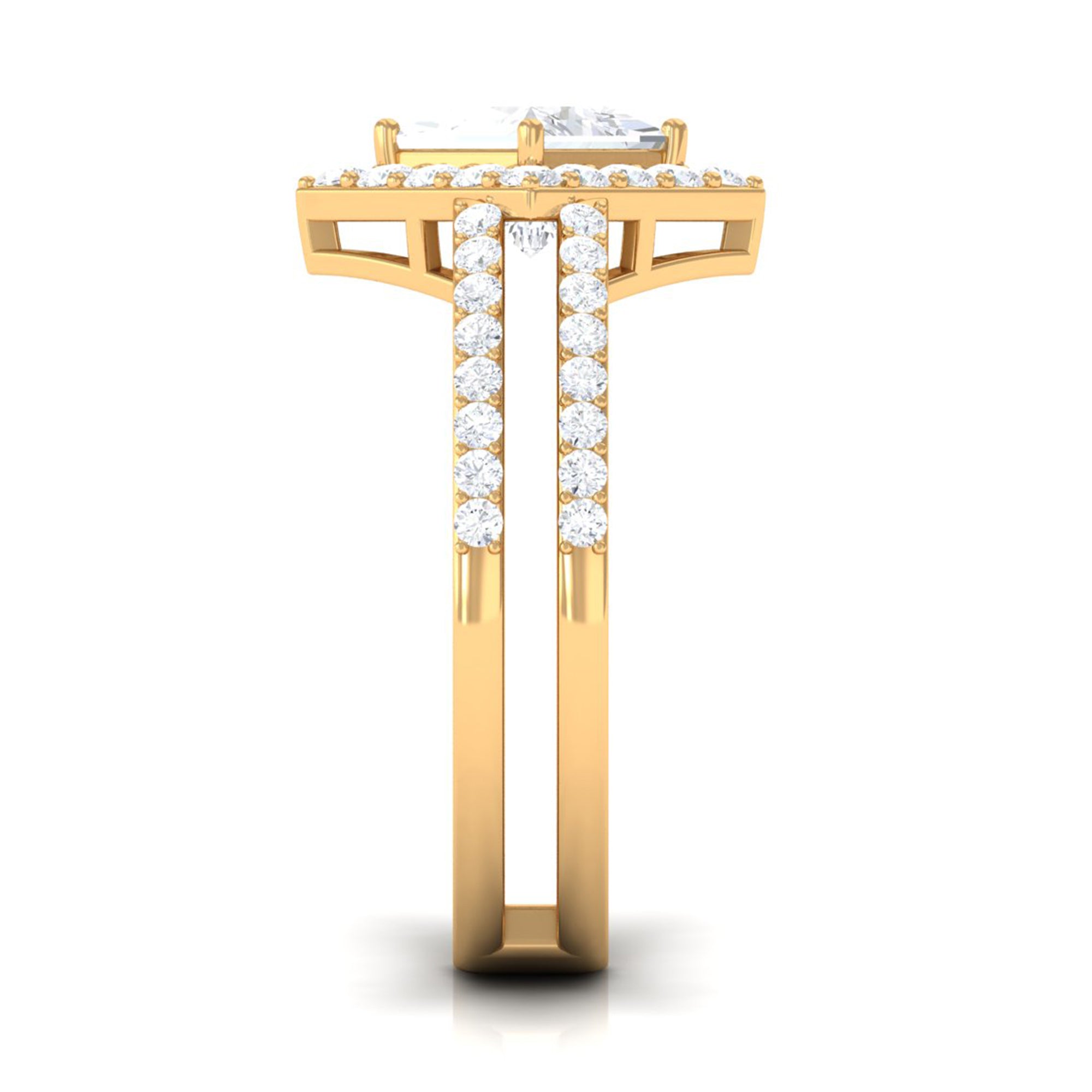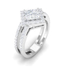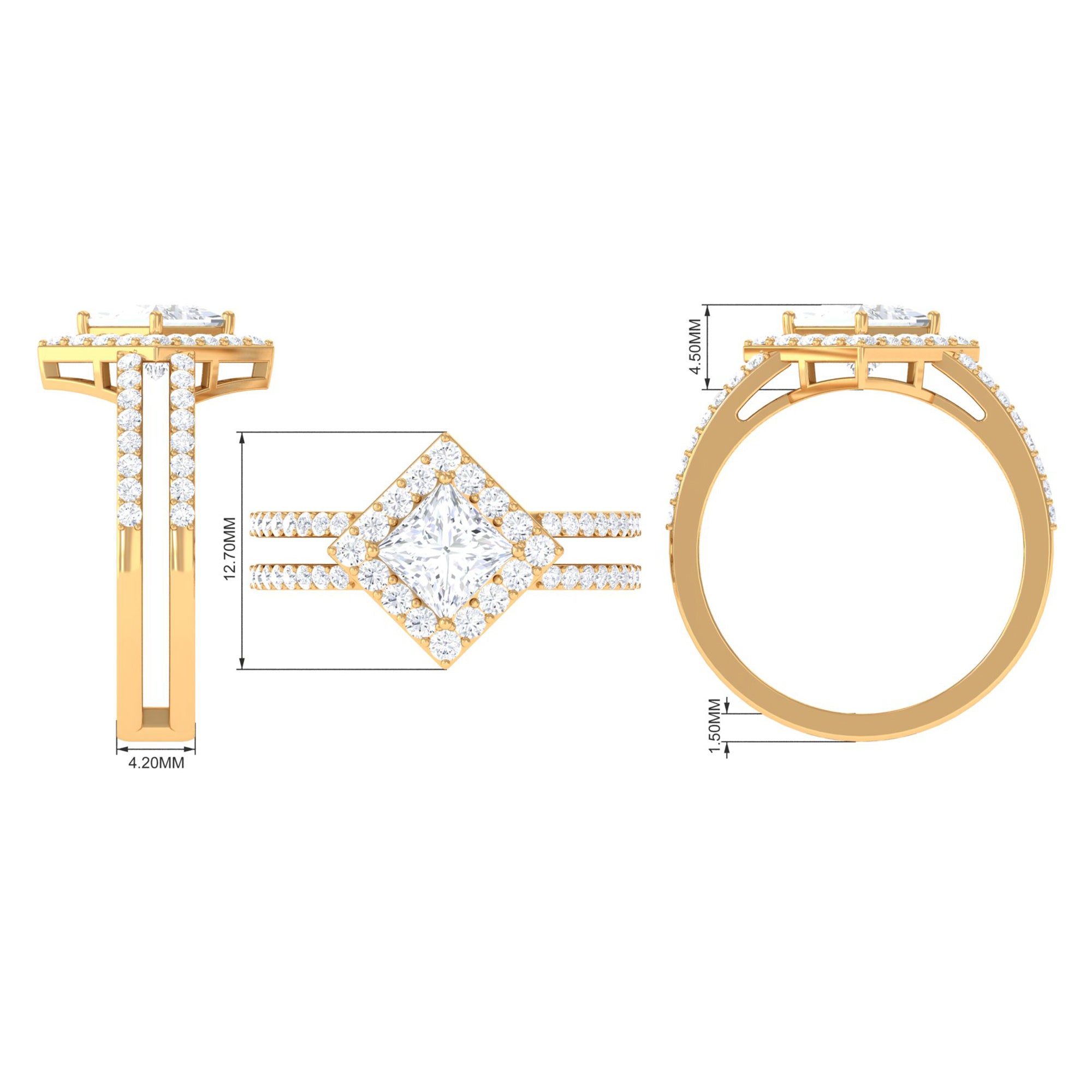 Featuring an elegant Cubic Zirconia Engagement Ring adorned with Princess cut Zircon set at the center of the ring with double band shank in Prong Setting and round cut zircon halo and side stones creates an appealing look. This Zircon Engagement Ring is crafted in Gold for an eye catching and appealing look.